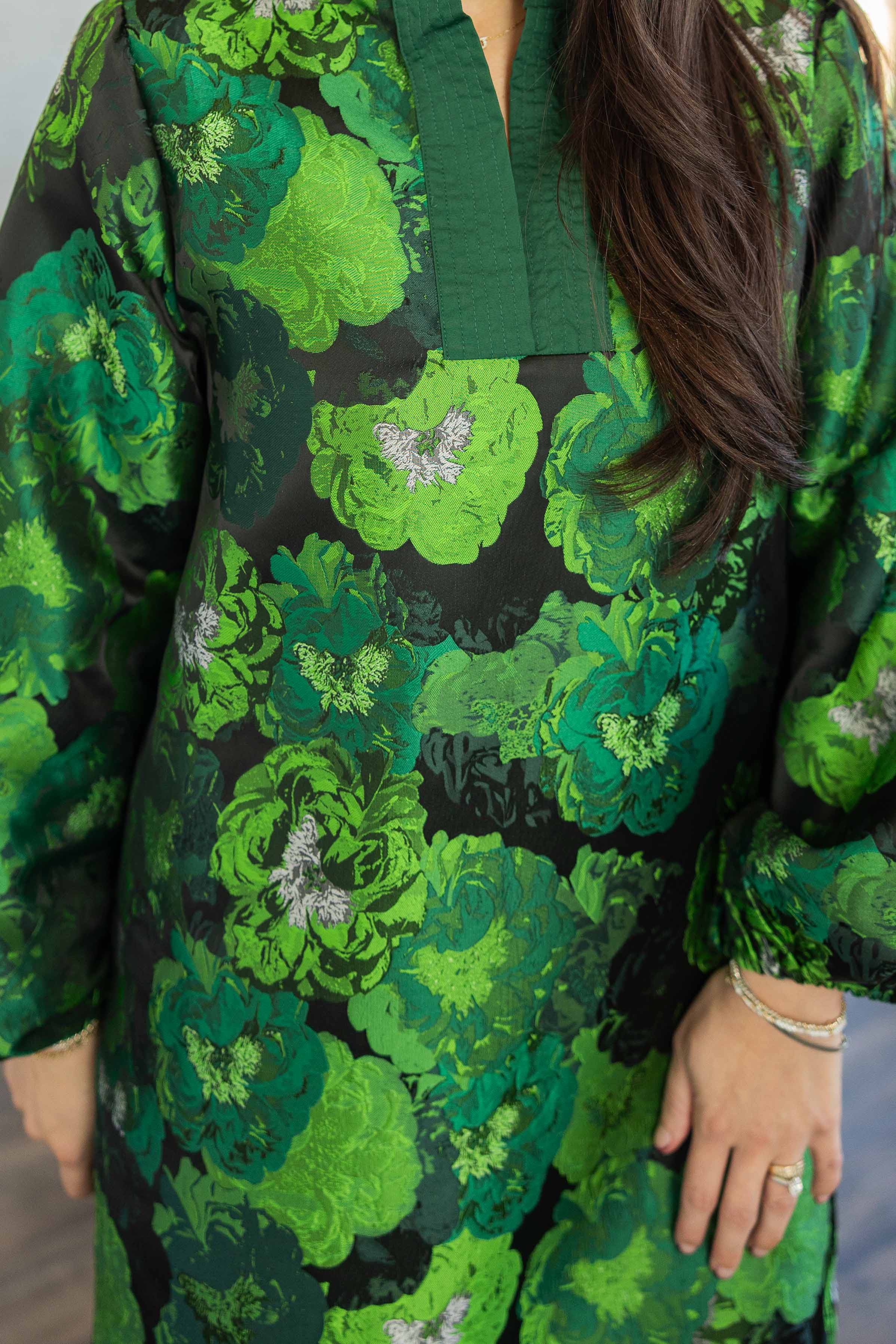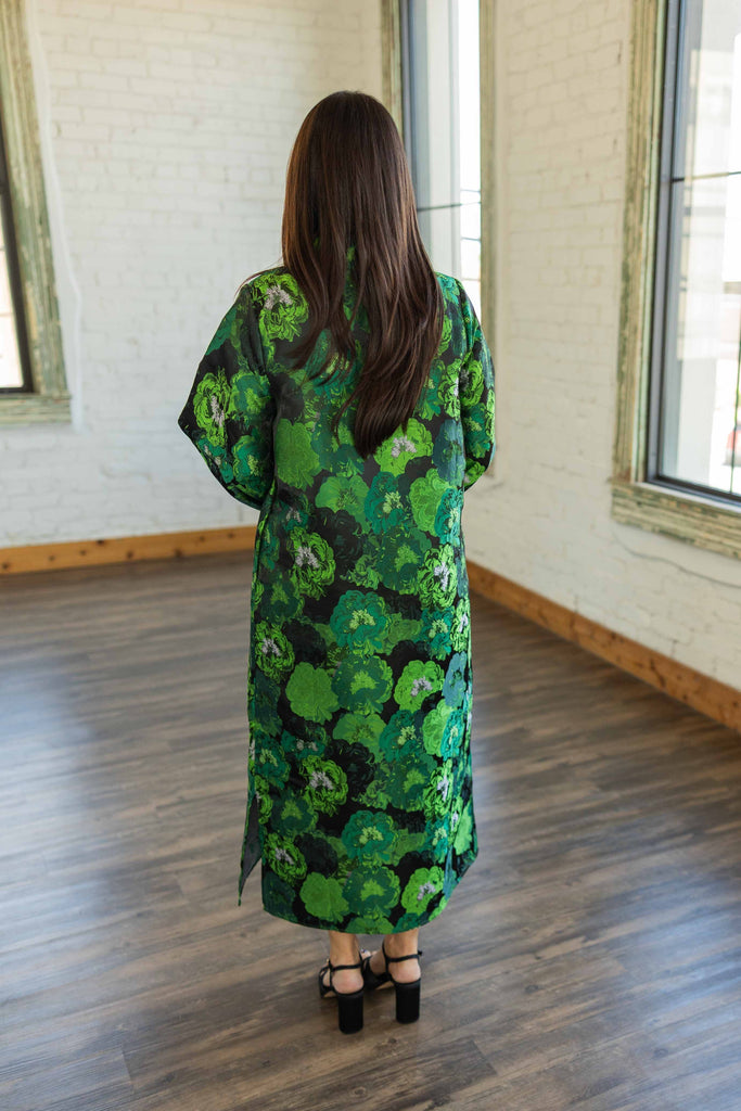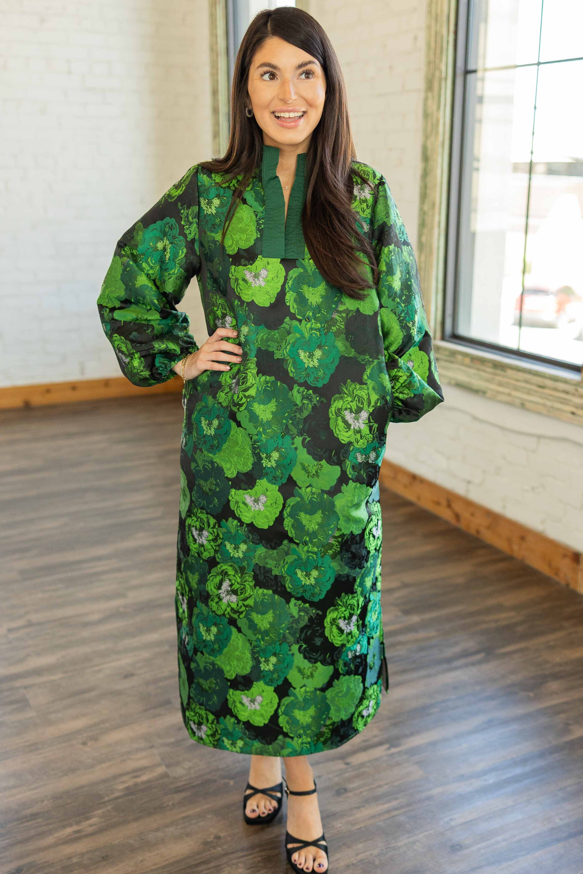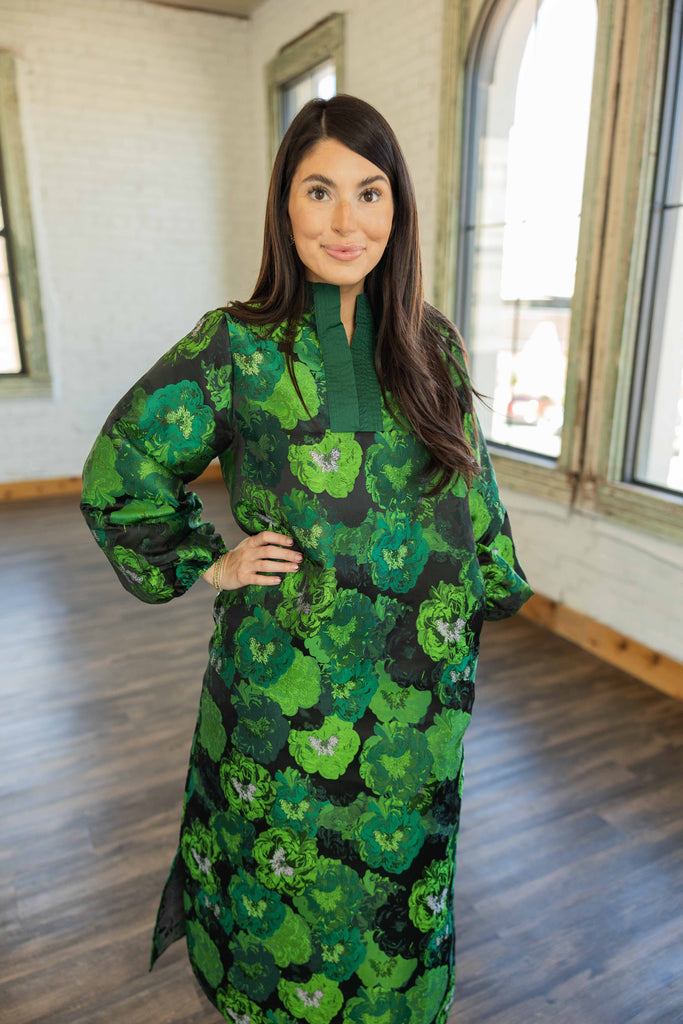 The Ariya Dress is a showstopper in every sense. With bold green florals woven into a metallic jacquard fabric, this caftan-style midi gives “holiday glam” without sacrificing comfort. The standing collar and contrast V-neck keep things polished, the side slits add movement, and yes—it has pockets. Because magic deserves convenience.