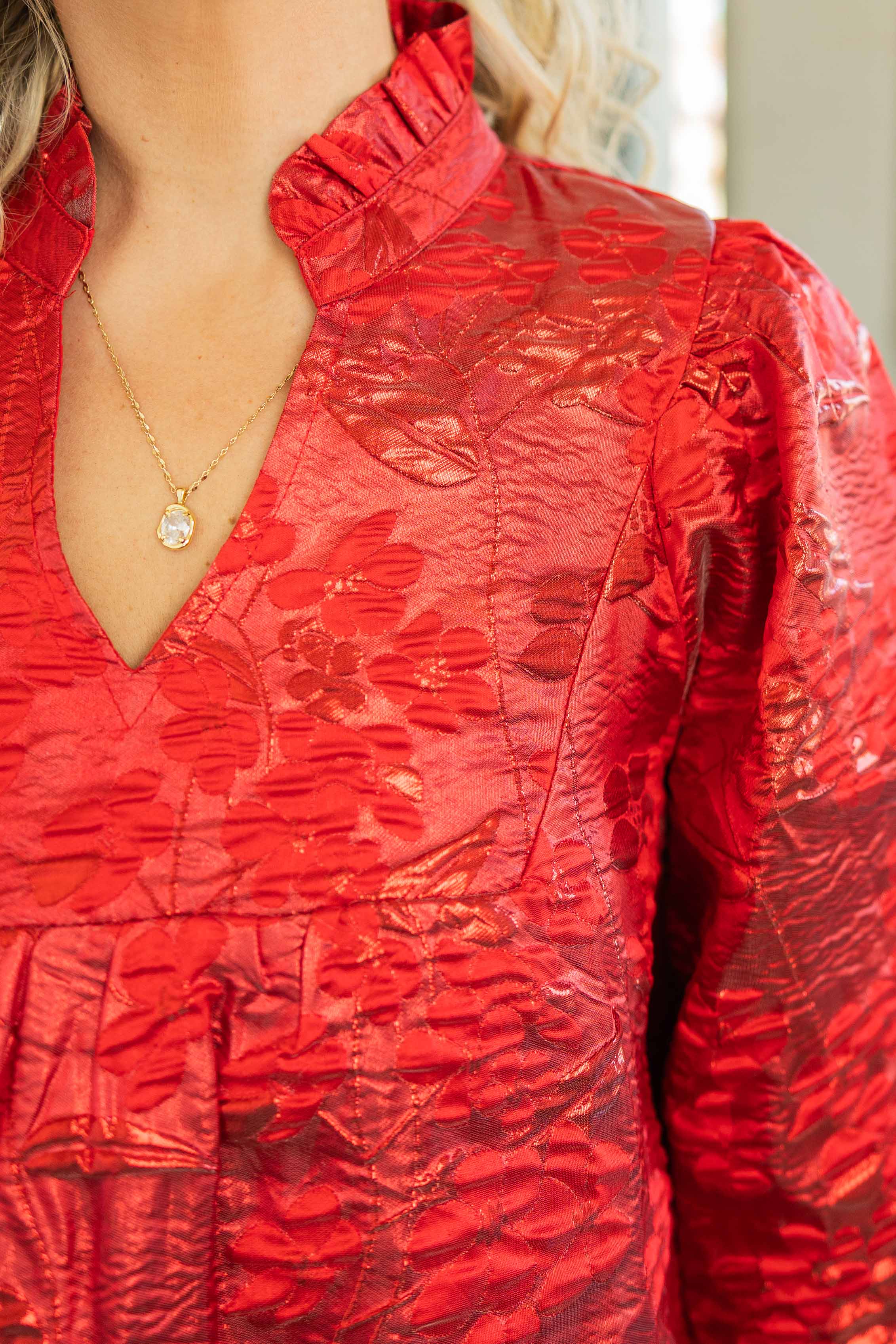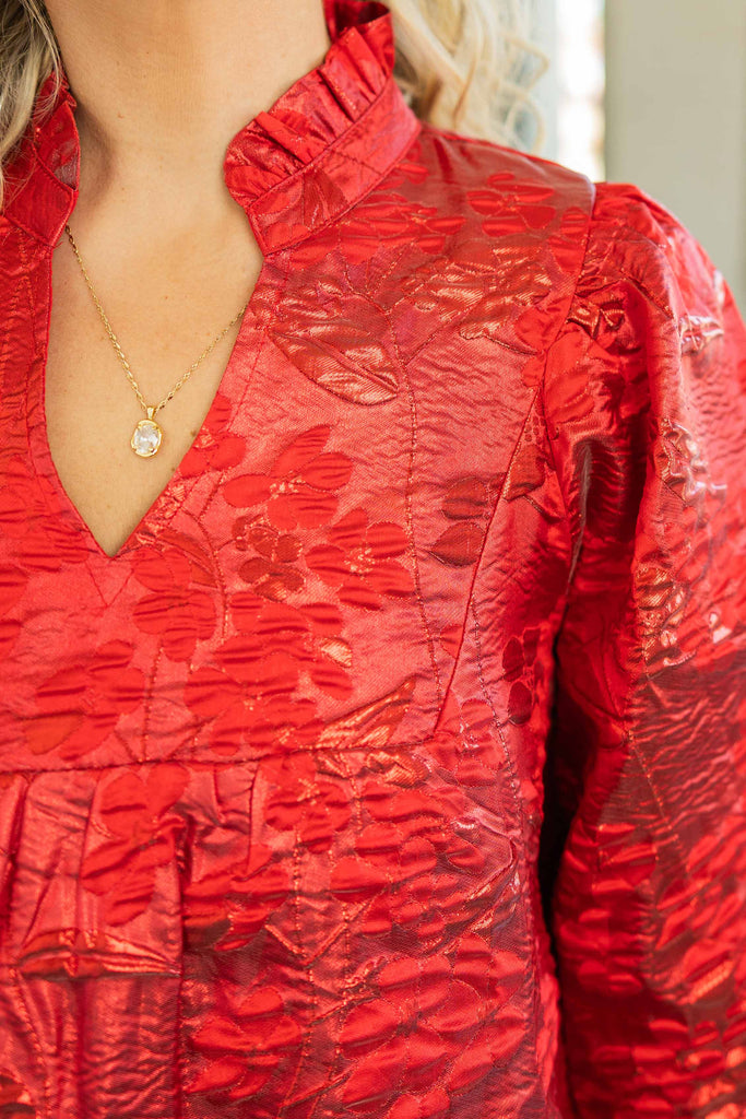 All the shimmer, none of the fuss. The Aylin Dress is the definition of festive flair with its bold red floral jacquard fabric and easy, relaxed shape. The ruffled neckline and puff sleeves give it a touch of drama, while the pockets seal the deal—it’s party-ready and practical.