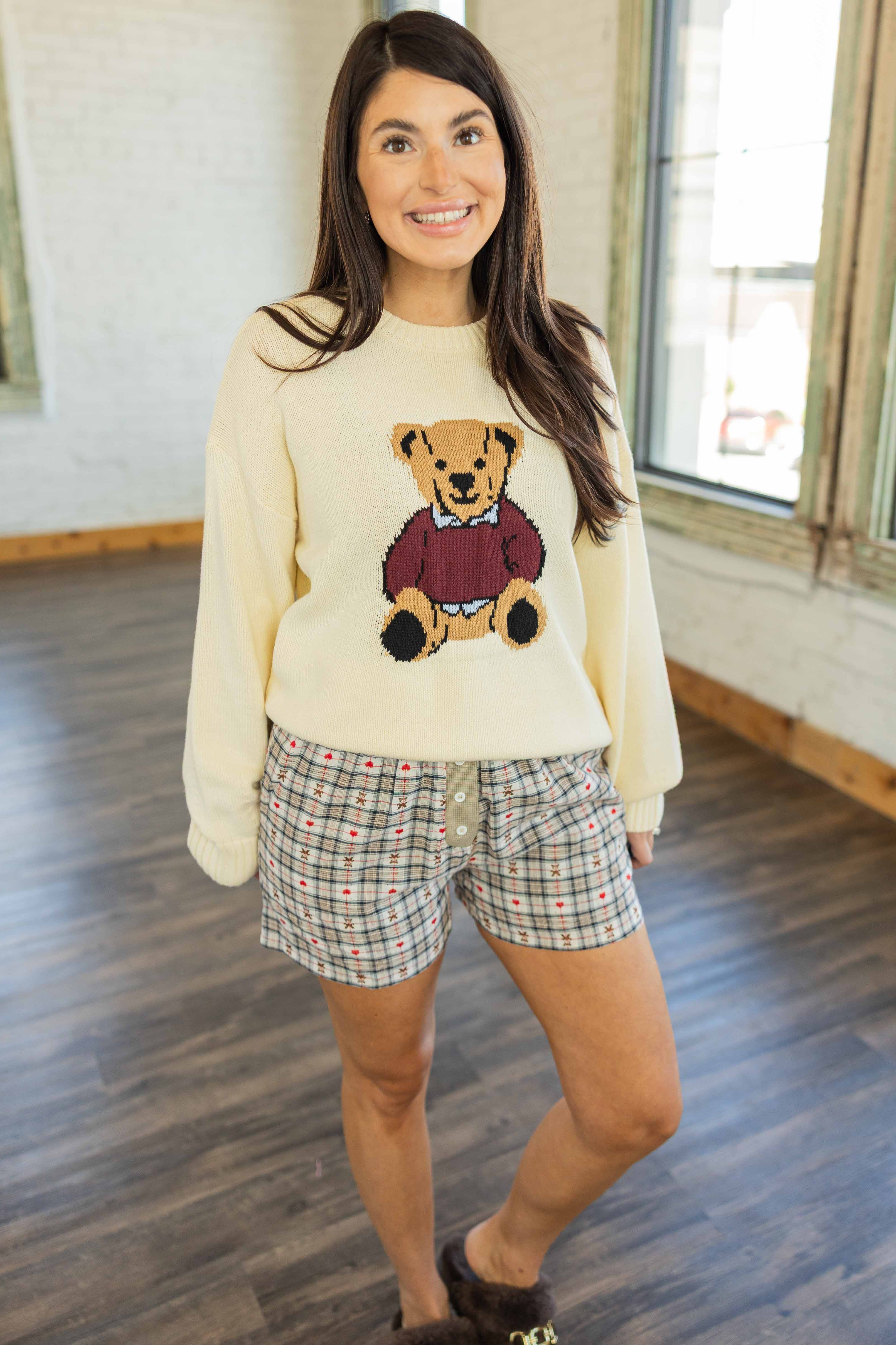 The Cameron Boxer Shorts are giving cozy-cute energy for every chill day ahead. These relaxed plaid shorts feature tiny teddy bear details with a soft contrast waistband for a comfy fit. Designed with side and back pockets, an elastic waist, and non-functional buttons at the front for that lived-in lounge look.
