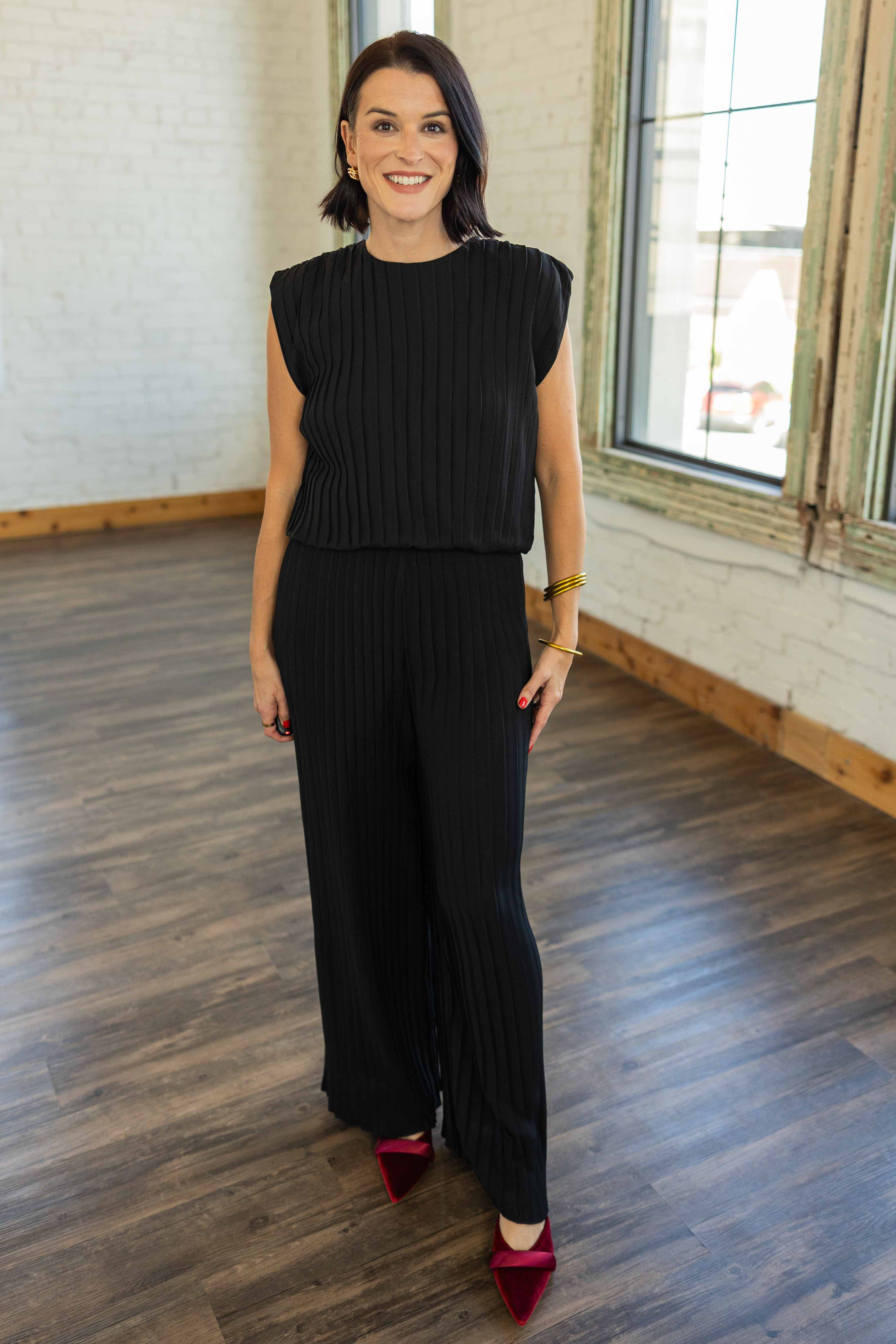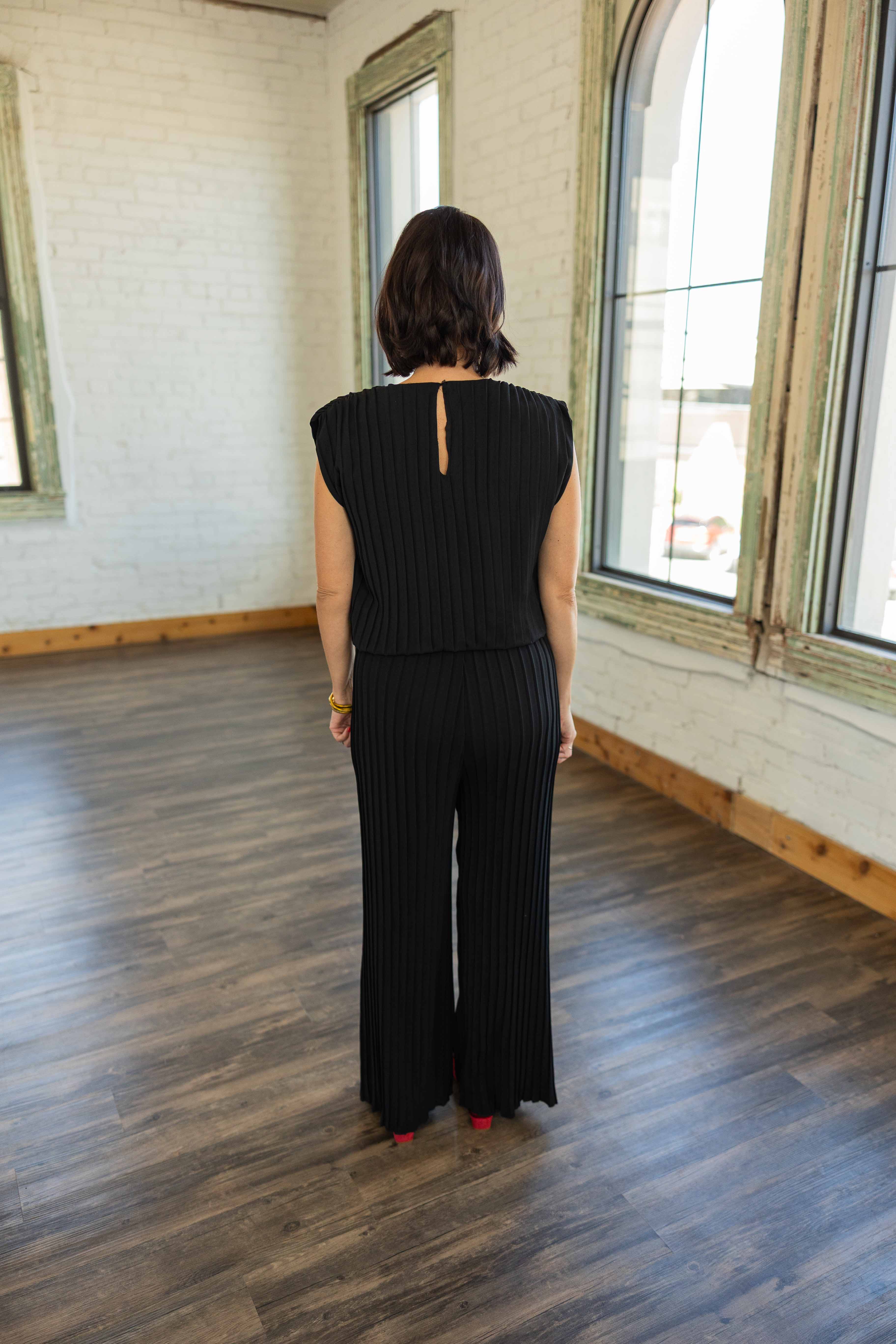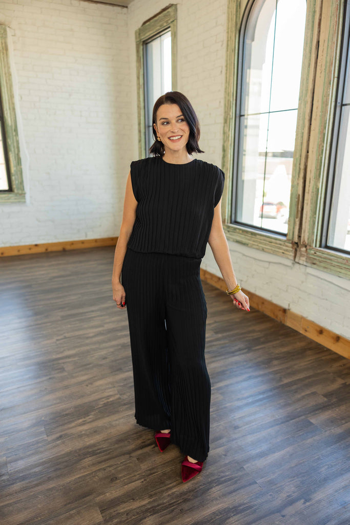 The Elora Set is proof that comfy can still look polished. This black pleated two-piece set features a relaxed top with shoulder detail and matching wide-leg pants. It moves beautifully, feels lightweight, and can go from dinner party to airport lounge with a simple shoe swap. Easy, chic, and totally effortless.