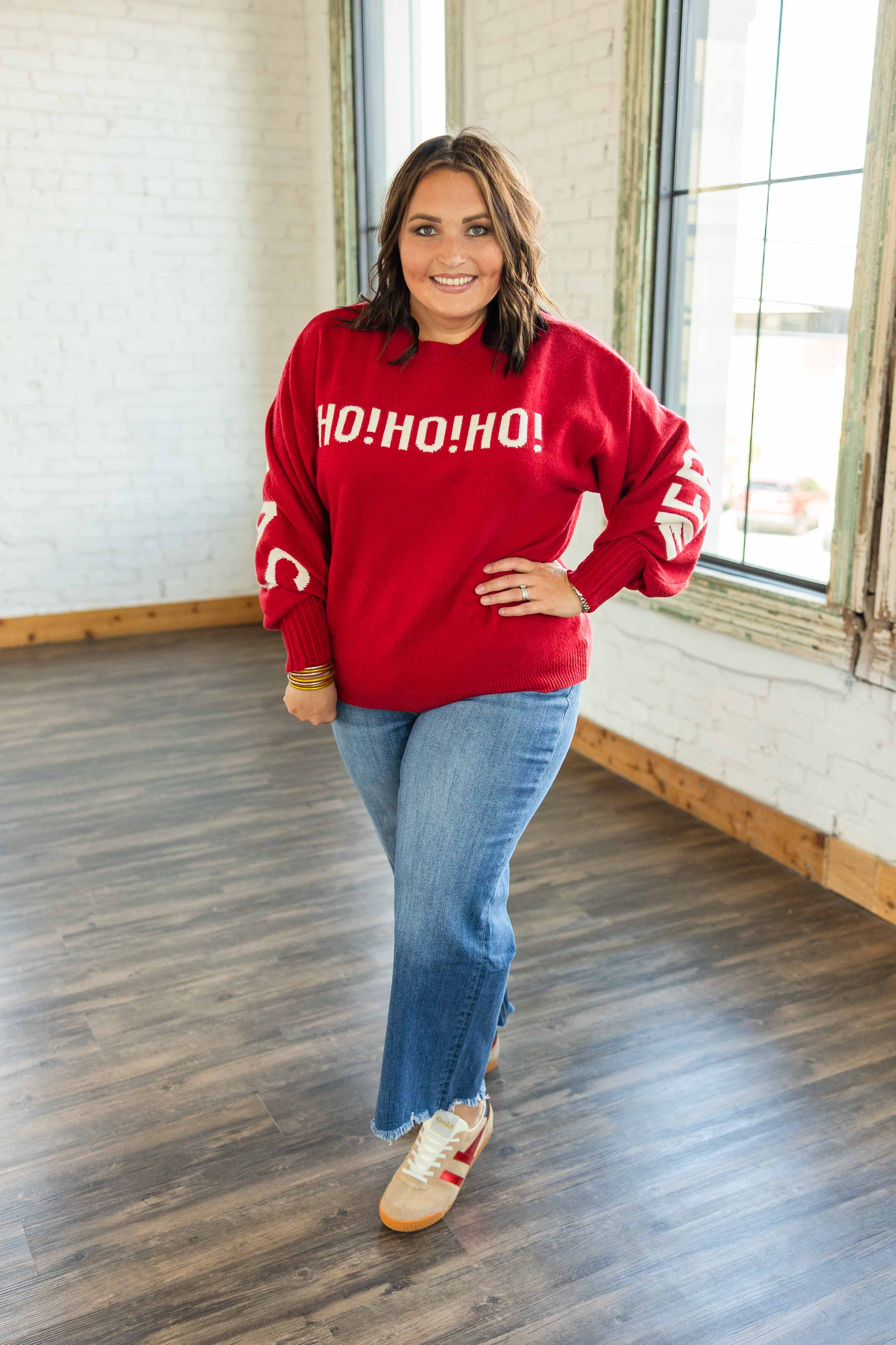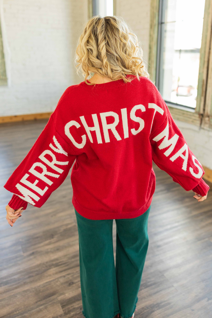 If holiday cheer were a sweater, it would be this one. The Galielia Sweater is bright, bold, and full of festive energy. The cozy red knit features “HO! HO! HO!” across the front and “MERRY CHRISTMAS” wrapped across the back and sleeves. Oversized for maximum comfort, this one’s made for cookie baking, movie marathons, and all things merry.