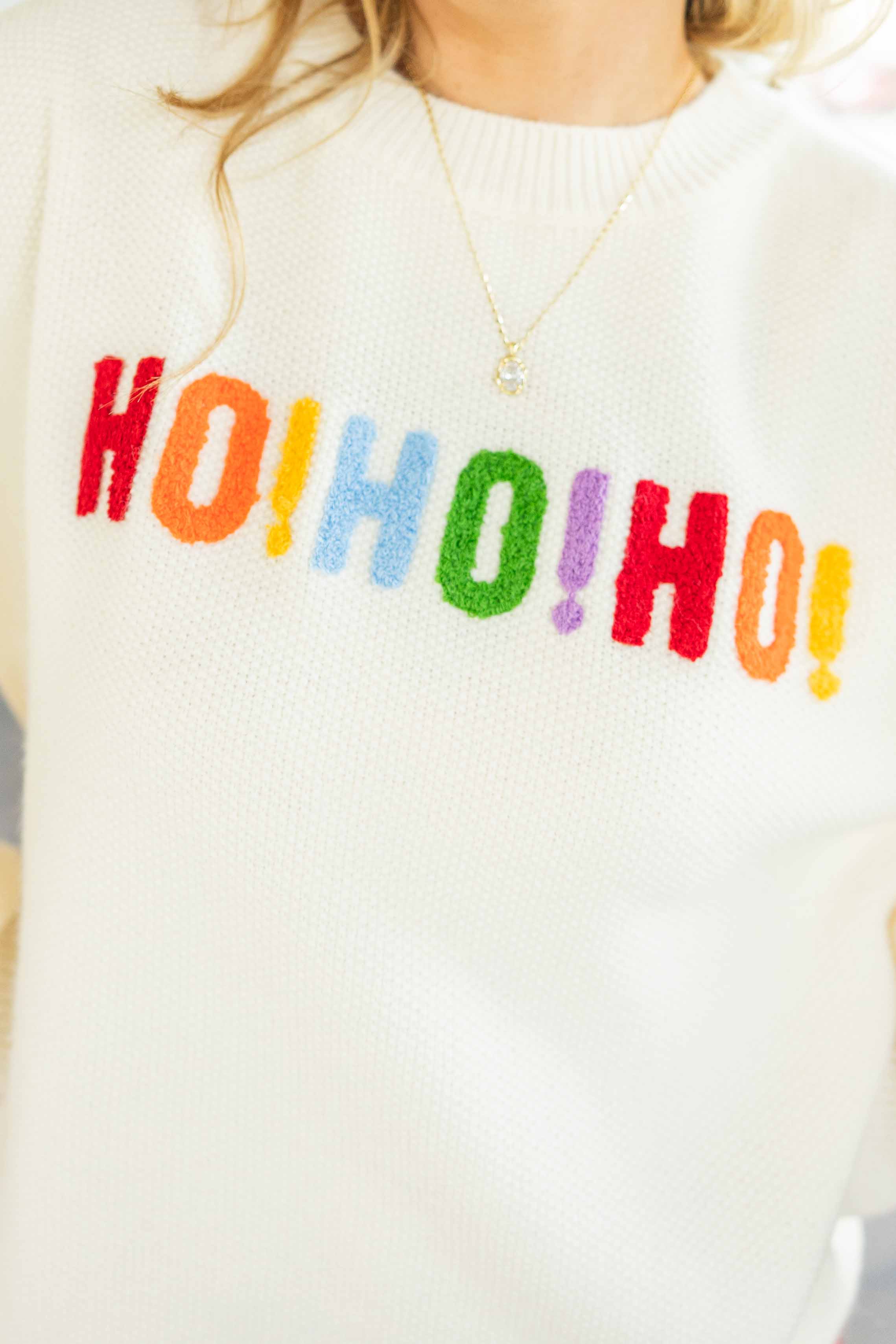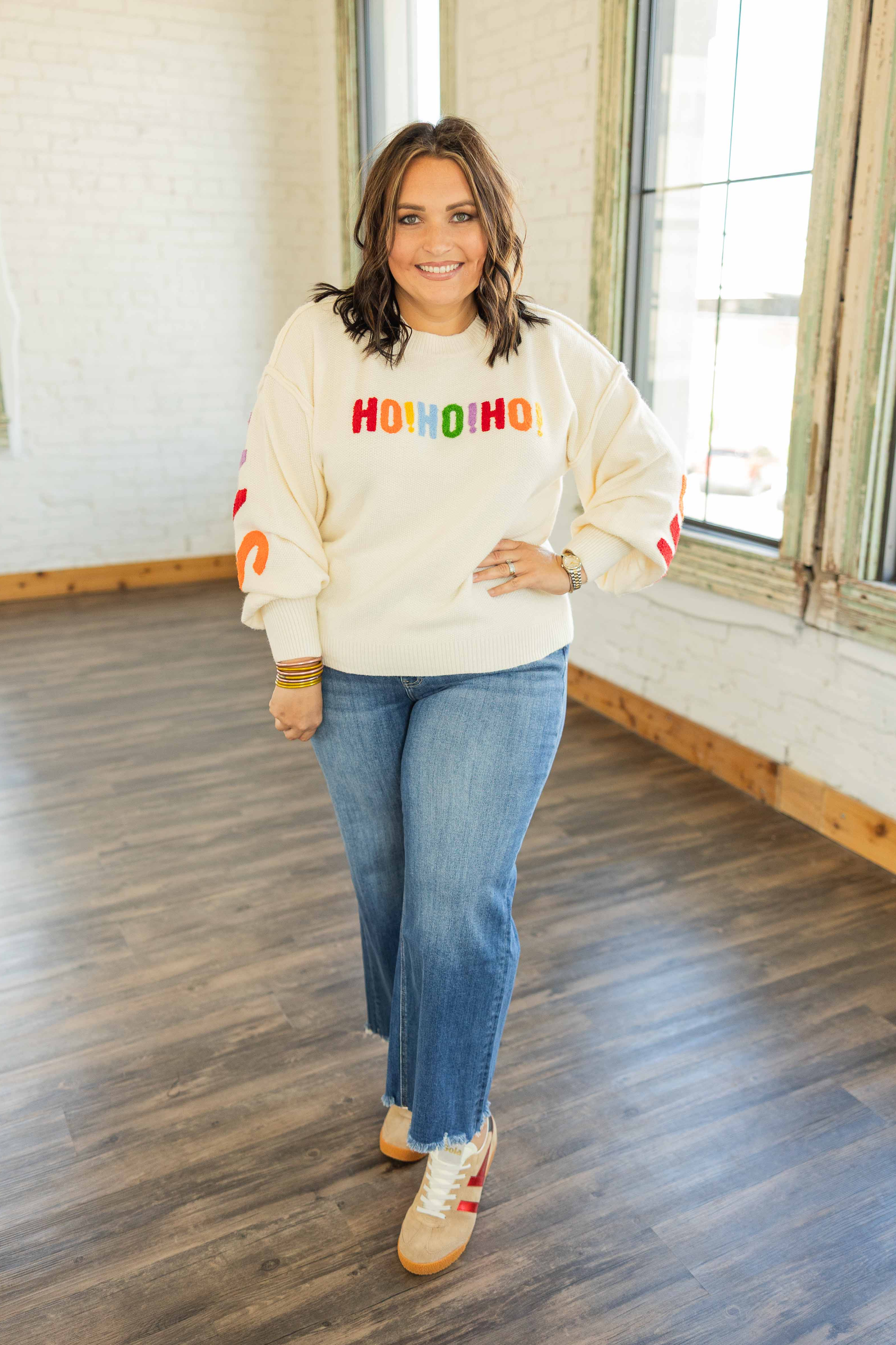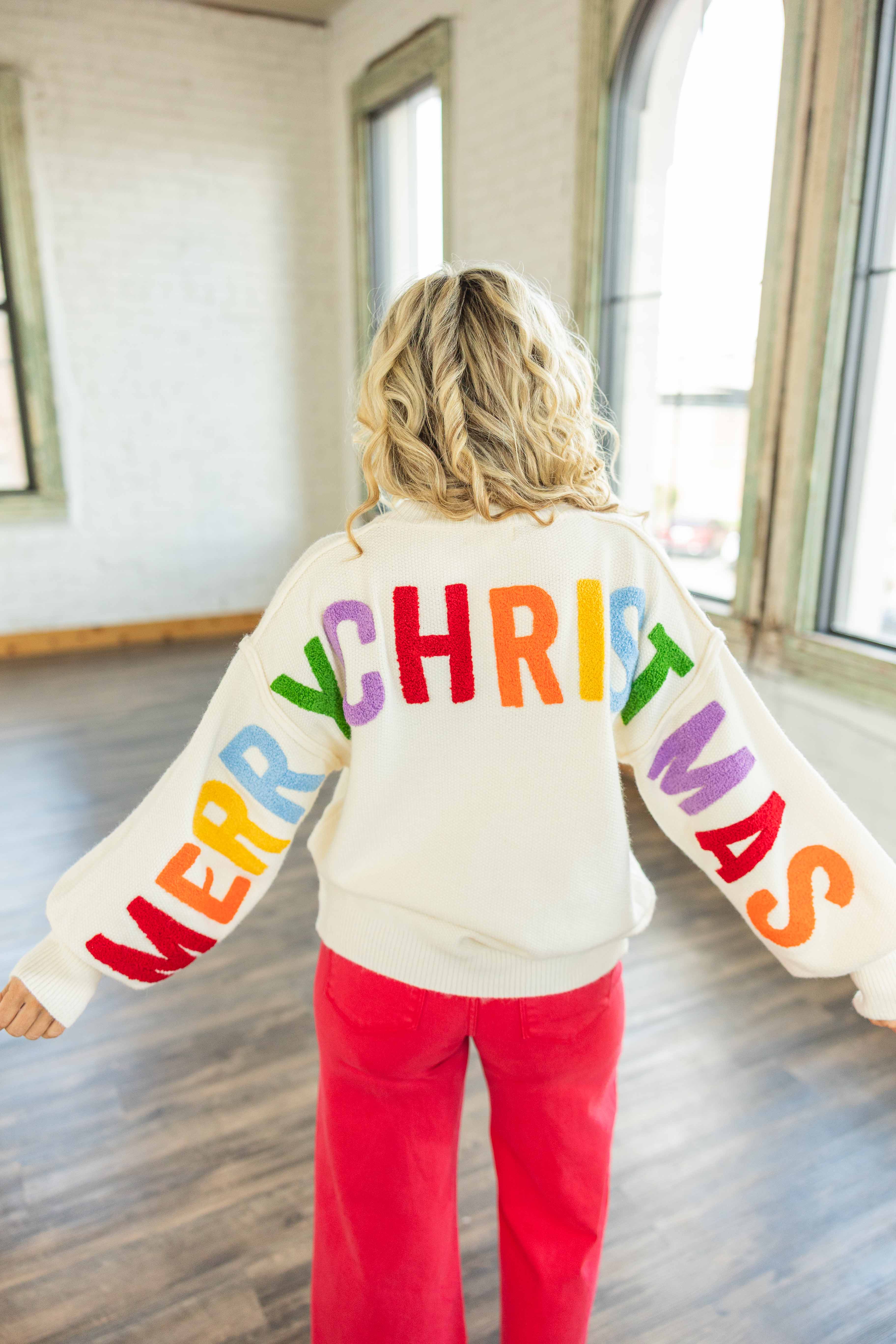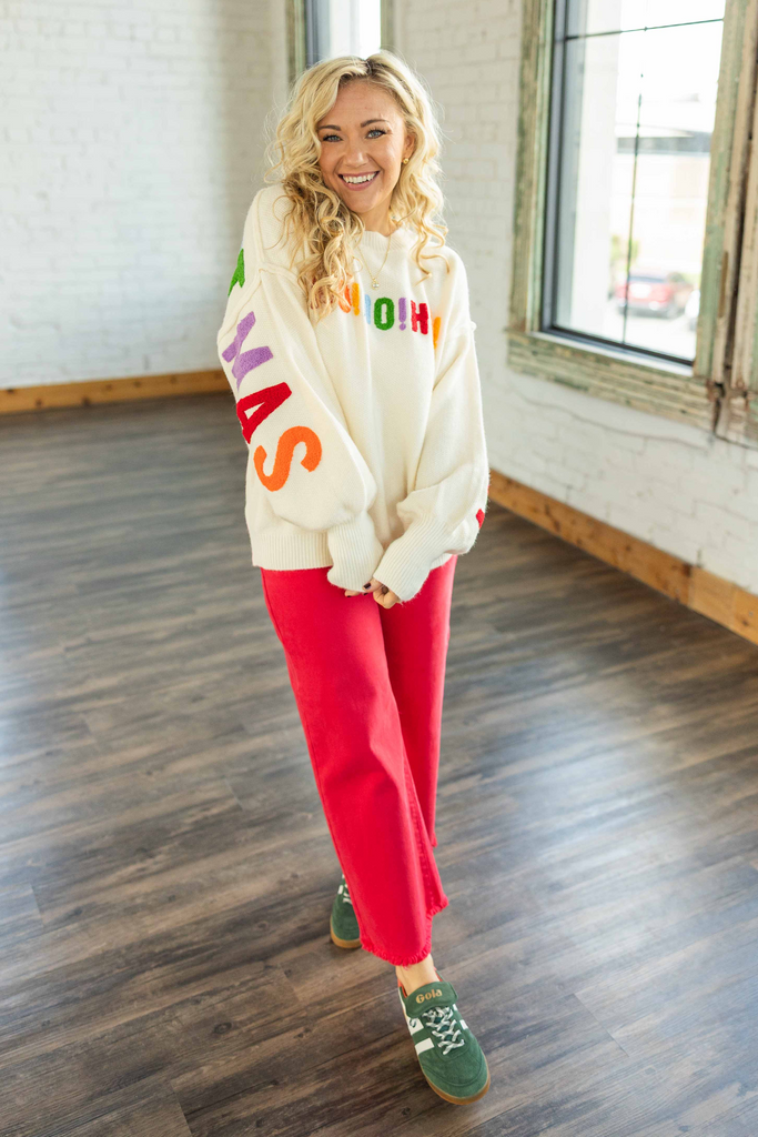 Festive, fun, and full of personality, the Irene Sweater is holiday cheer in wearable form. This cream knit features bright chenille “HO! HO! HO!” lettering across the front and a bold “MERRY CHRISTMAS” wrapping around the back and sleeves. It’s oversized, cozy, and impossible not to smile at.