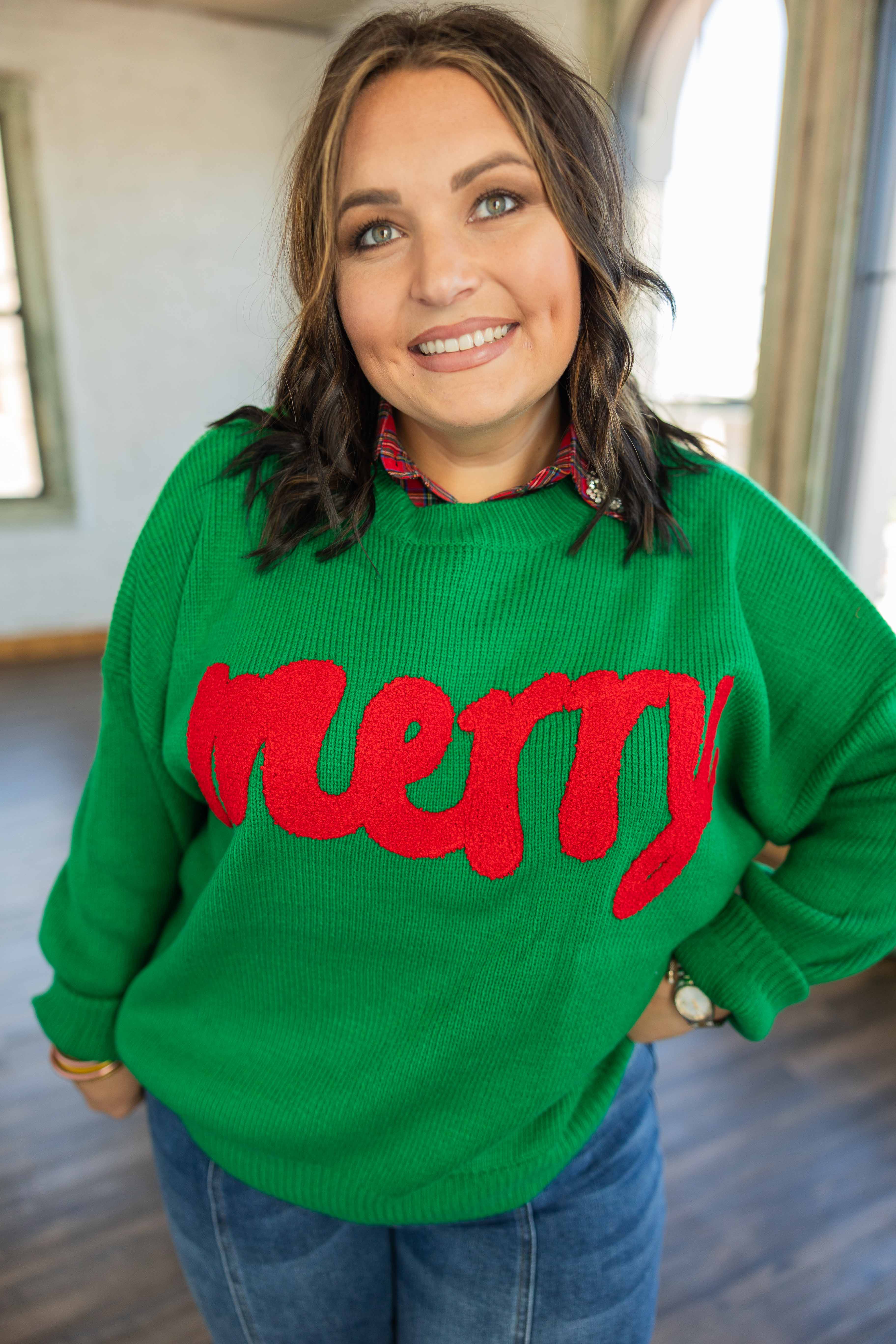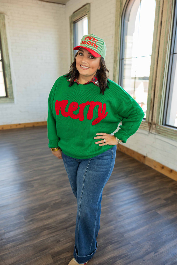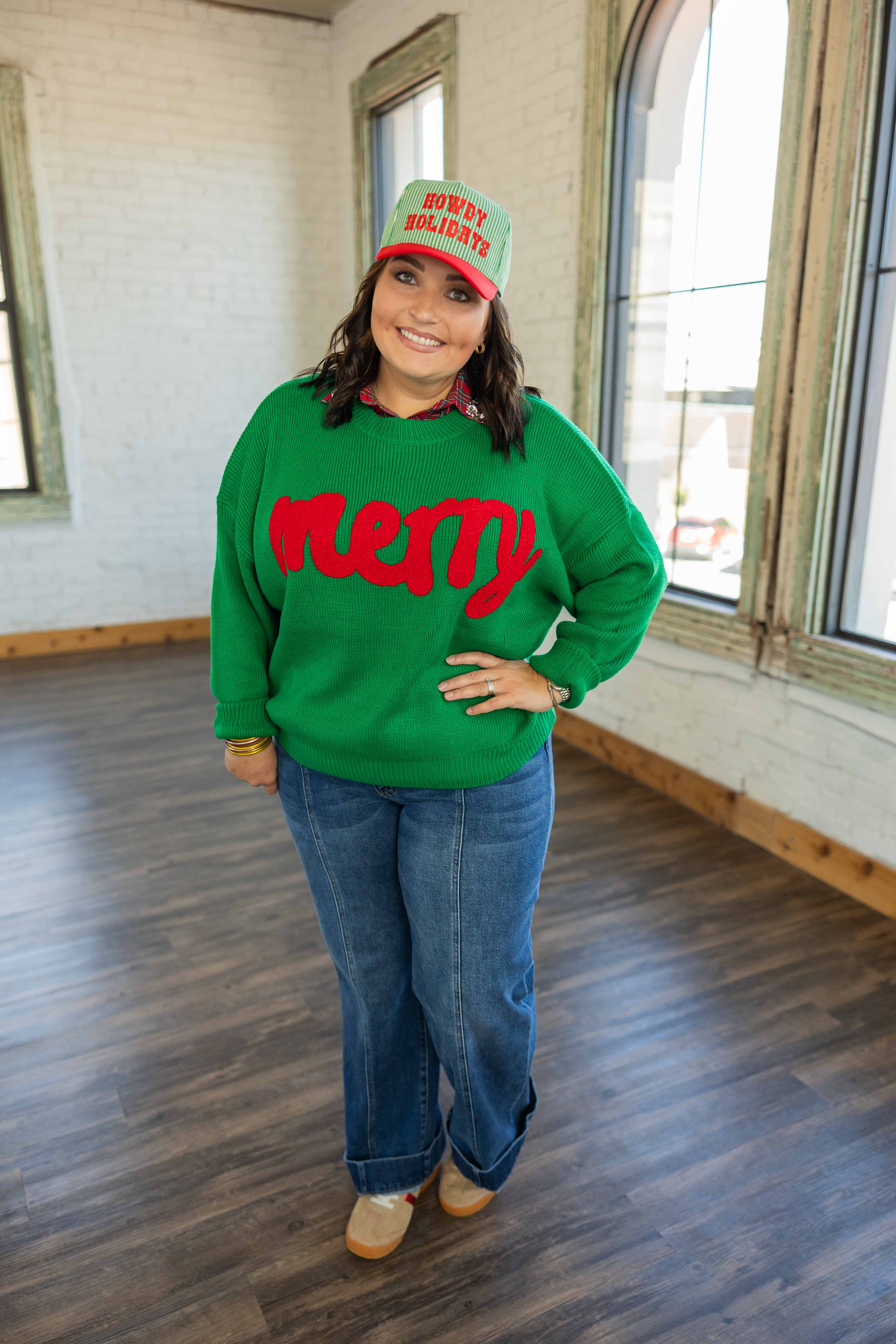 Bring on the holly jolly. This bright green sweater with bold red “merry” lettering is holiday cheer you can actually wear. Soft, cozy, and easy to throw on with jeans or leggings, it’s giving festive without trying too hard. Perfect for decking halls, sipping cocoa, or simply surviving your family’s group chat.