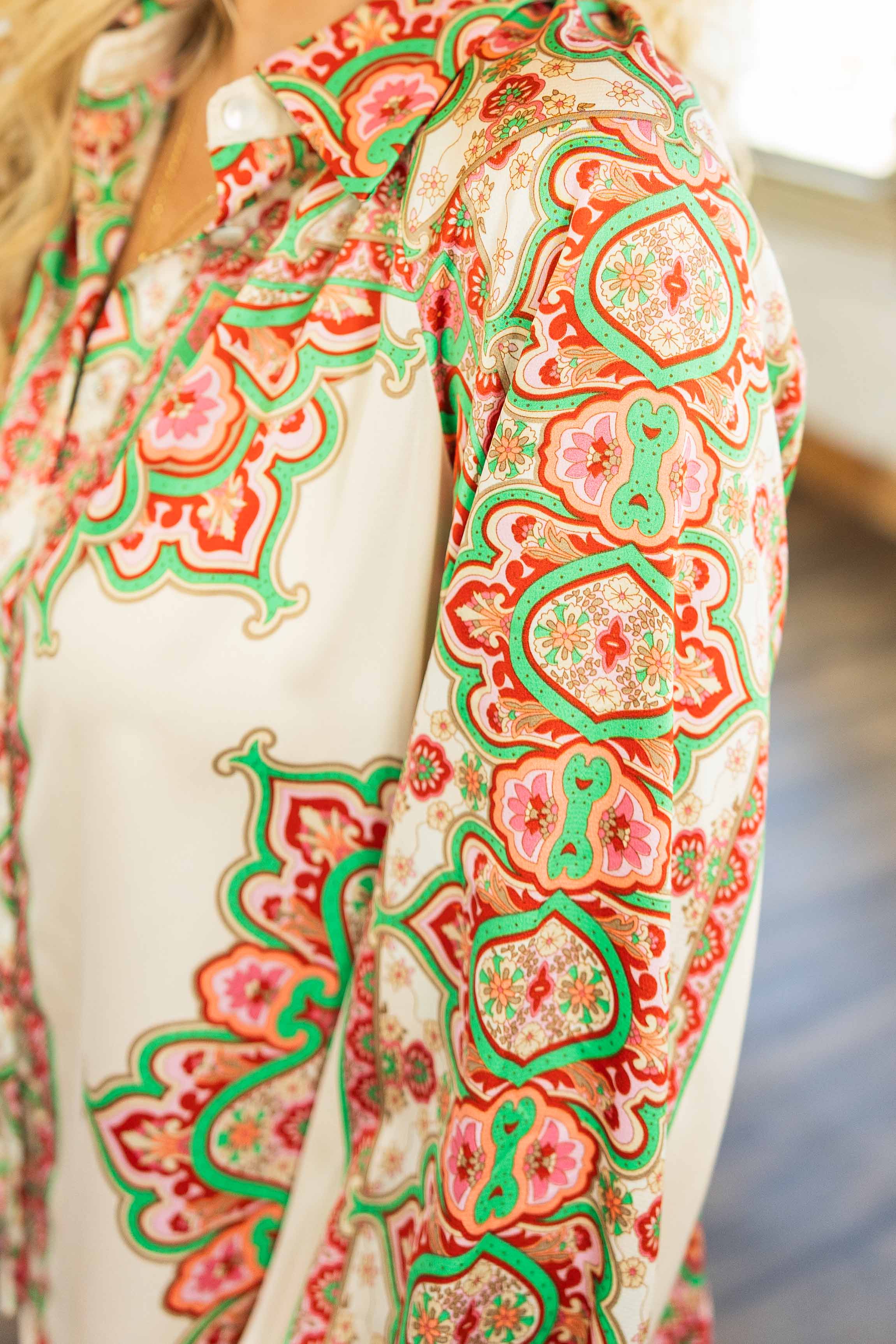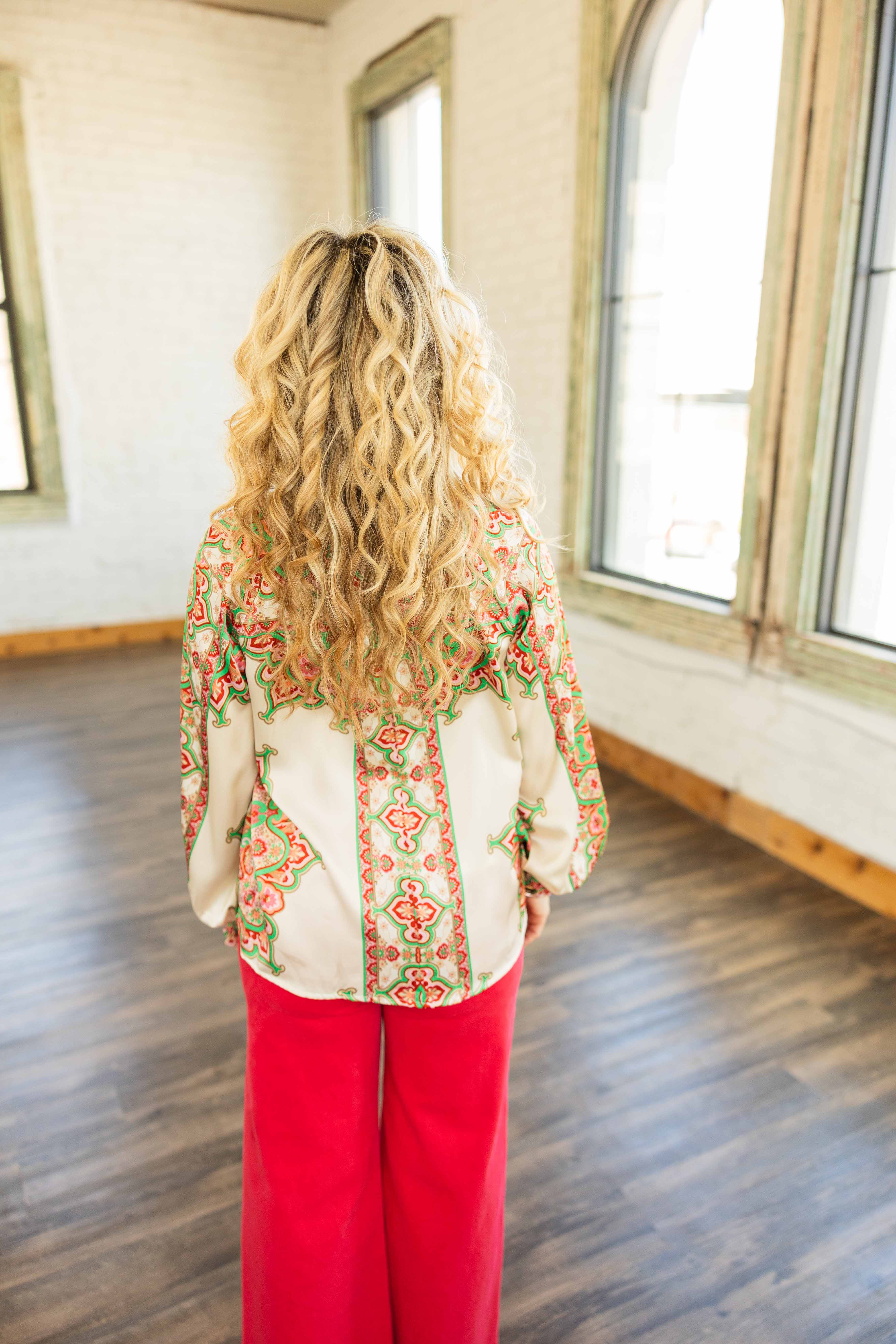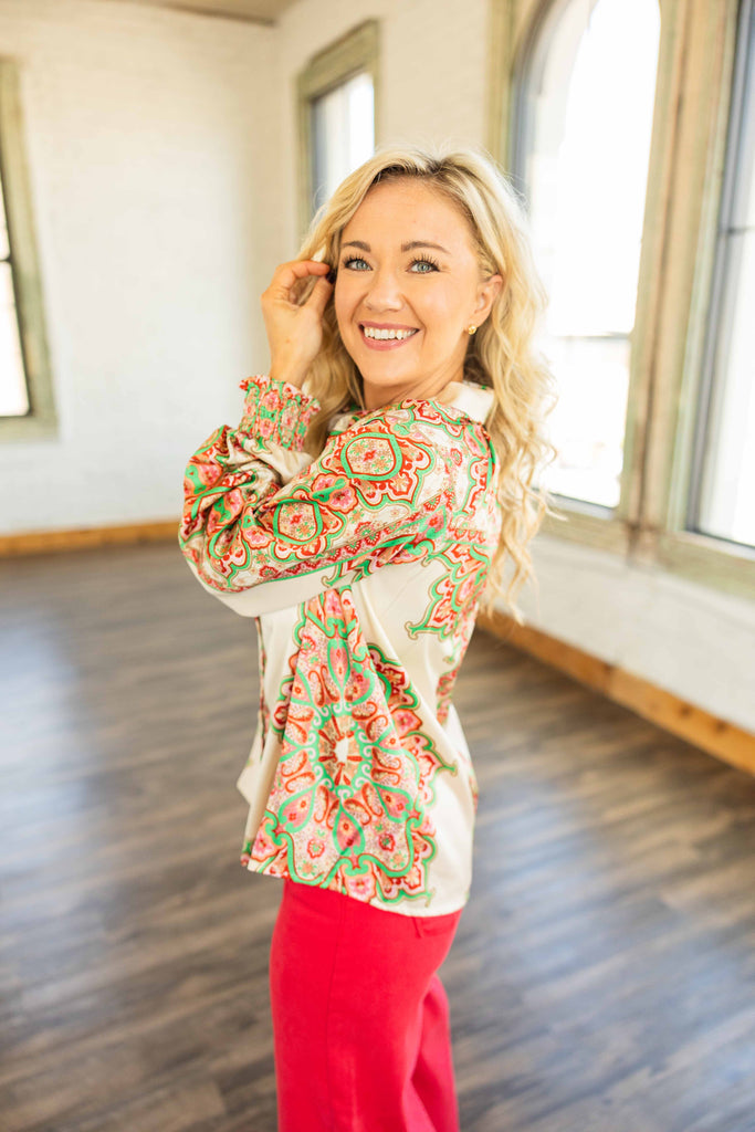 The Noah Top is that perfect mix of statement and sophistication. The satin finish gives it a polished glow, while the red and green damask print adds a festive twist that feels merry without being too much. The relaxed fit and bishop sleeves keep it easy and flattering for every shape.