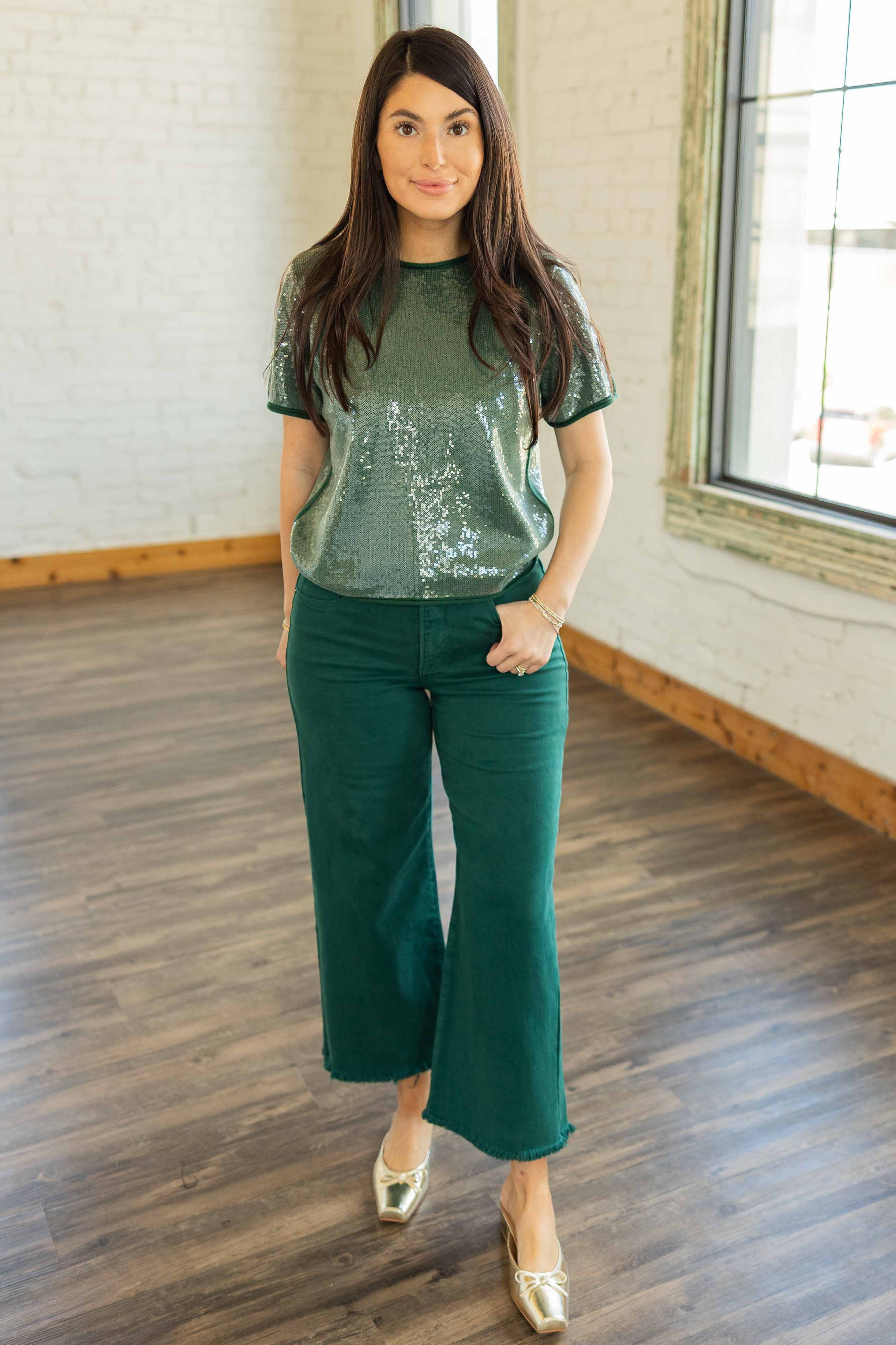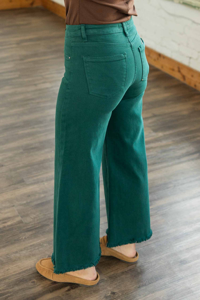 The Piper Jeans bring comfort, structure, and just the right pop of color to your holiday looks. Designed with a tummy control panel, these high-rise jeans give a flattering fit that holds everything comfortably in place. The cropped wide leg and raw hem keep things modern and fresh. Deep emerald green adds a bold seasonal twist.