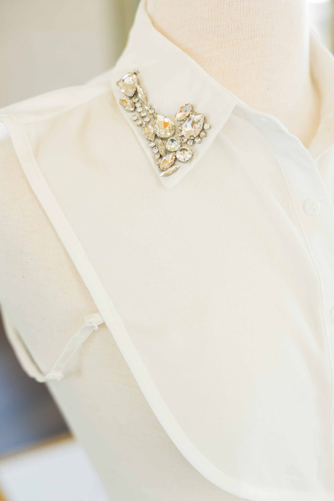 Instant polish, zero bulk. The White Jewel Dickie Collar adds that dressed-up touch under any sweater, sweatshirt, or jacket. Featuring a crisp white button-up front with rhinestone embellishments along the collar, this one-size piece layers easily thanks to adjustable side straps. A little sparkle goes a long way.