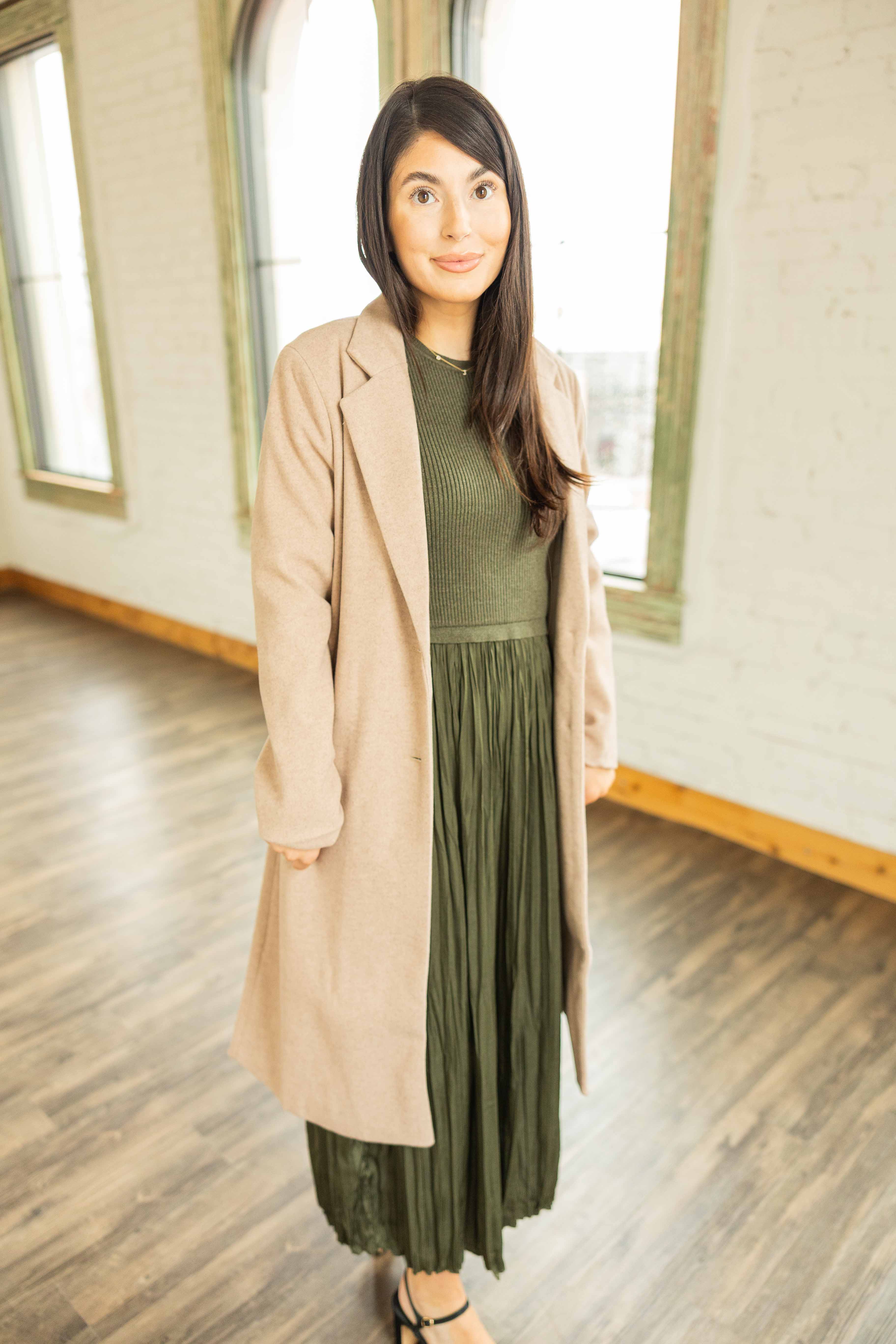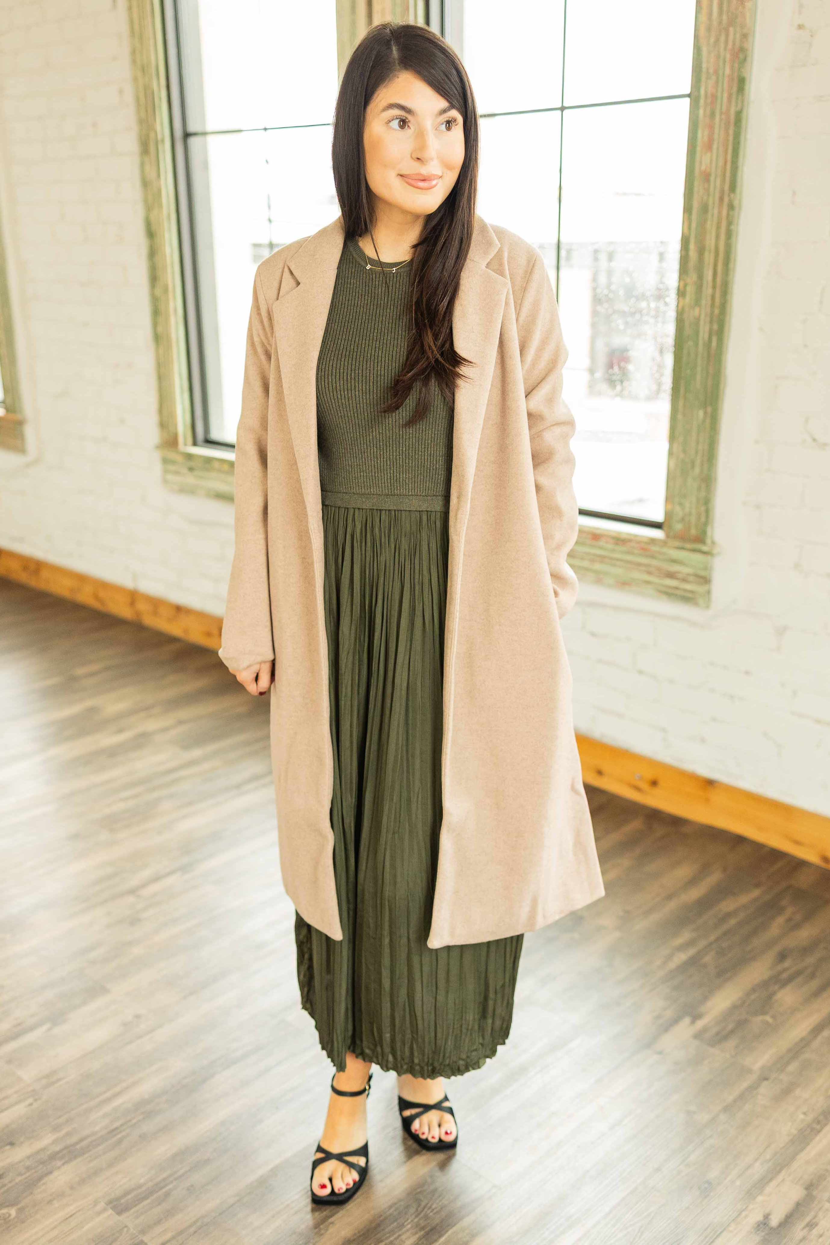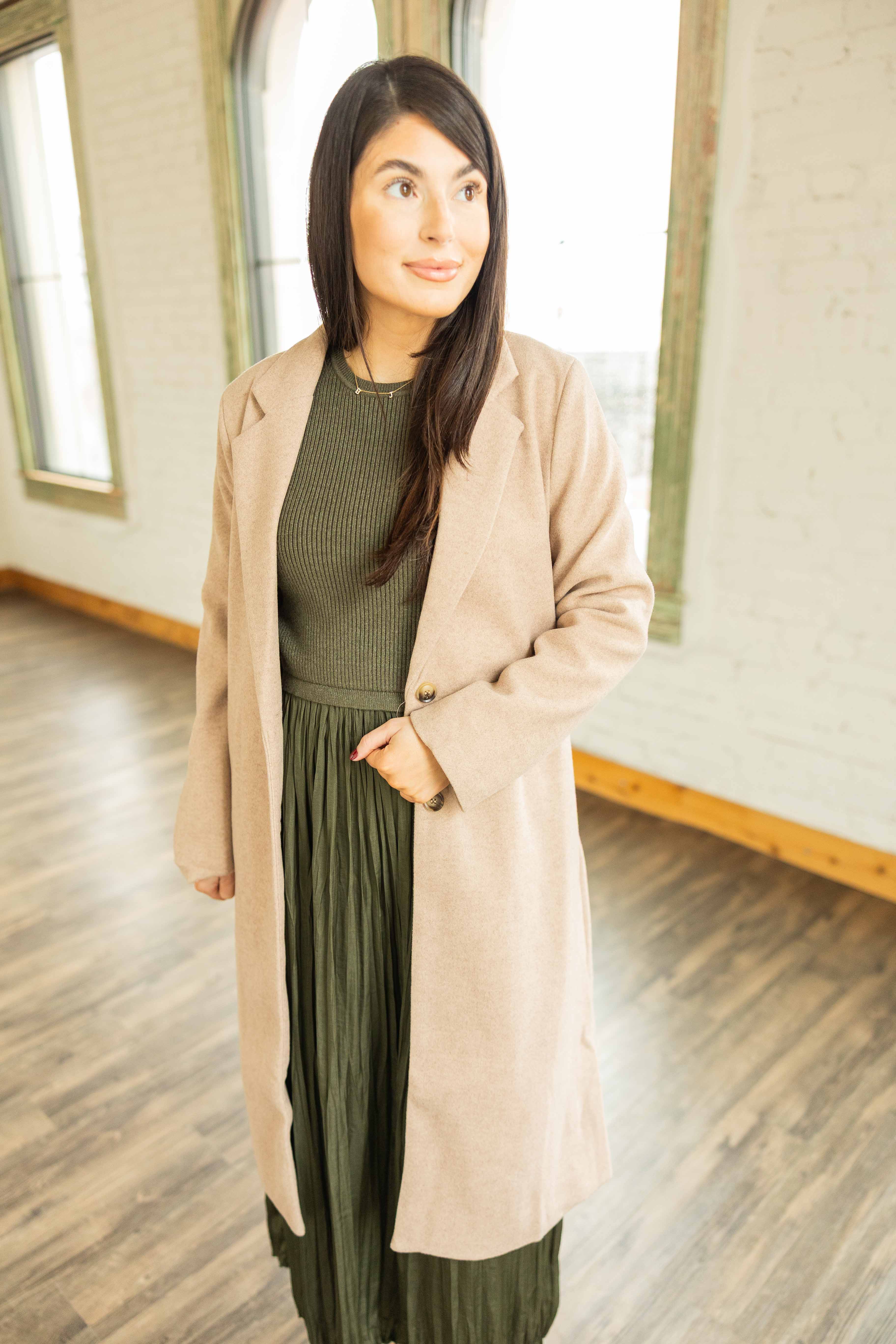 Clean, classic, polished. This tan single breasted coat adds instant structure to your outfit. The lapel gives it a tailored feel. The length keeps it sleek. The pockets are practical. It layers easily over dresses or sweaters. The fit is smooth without feeling tight.