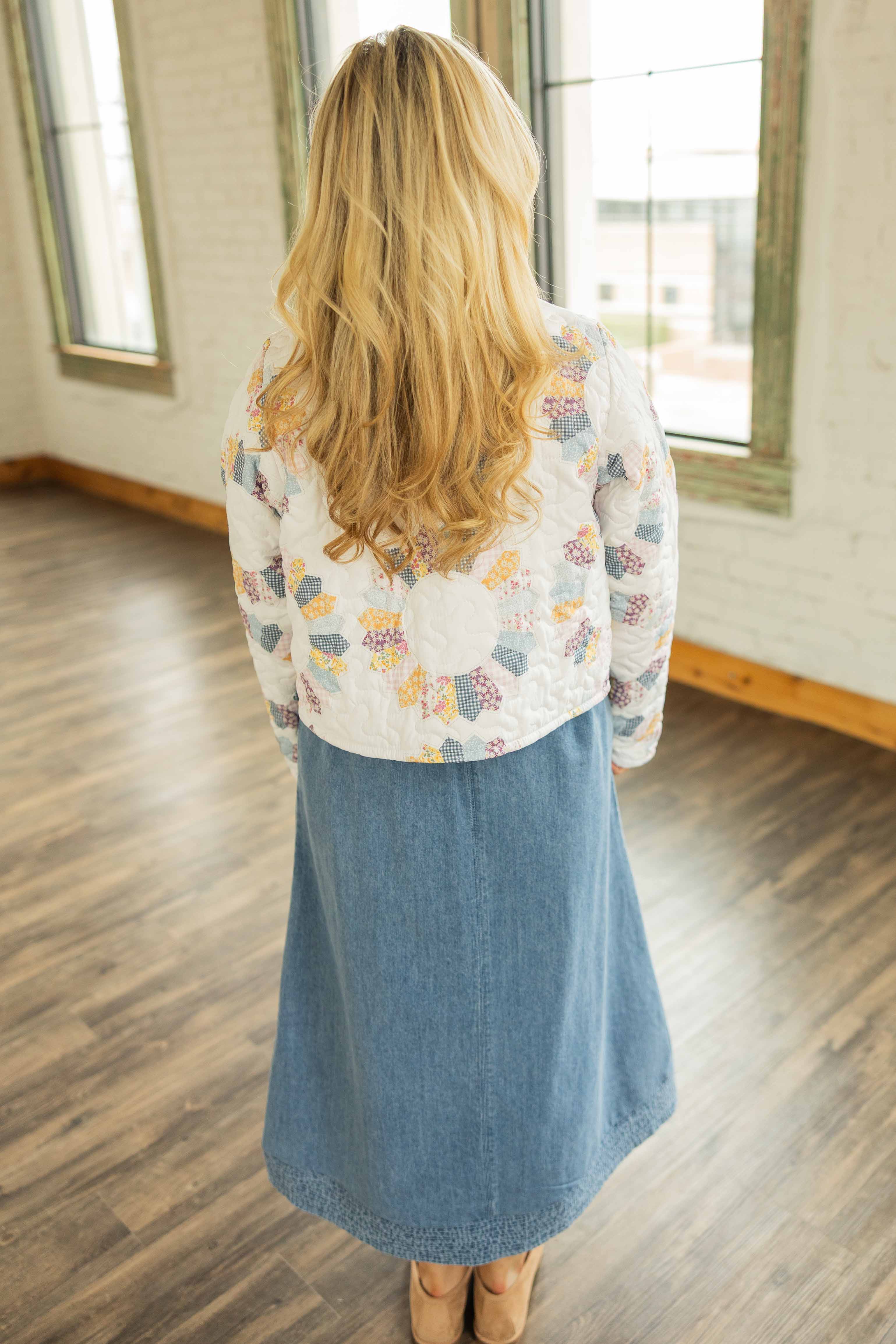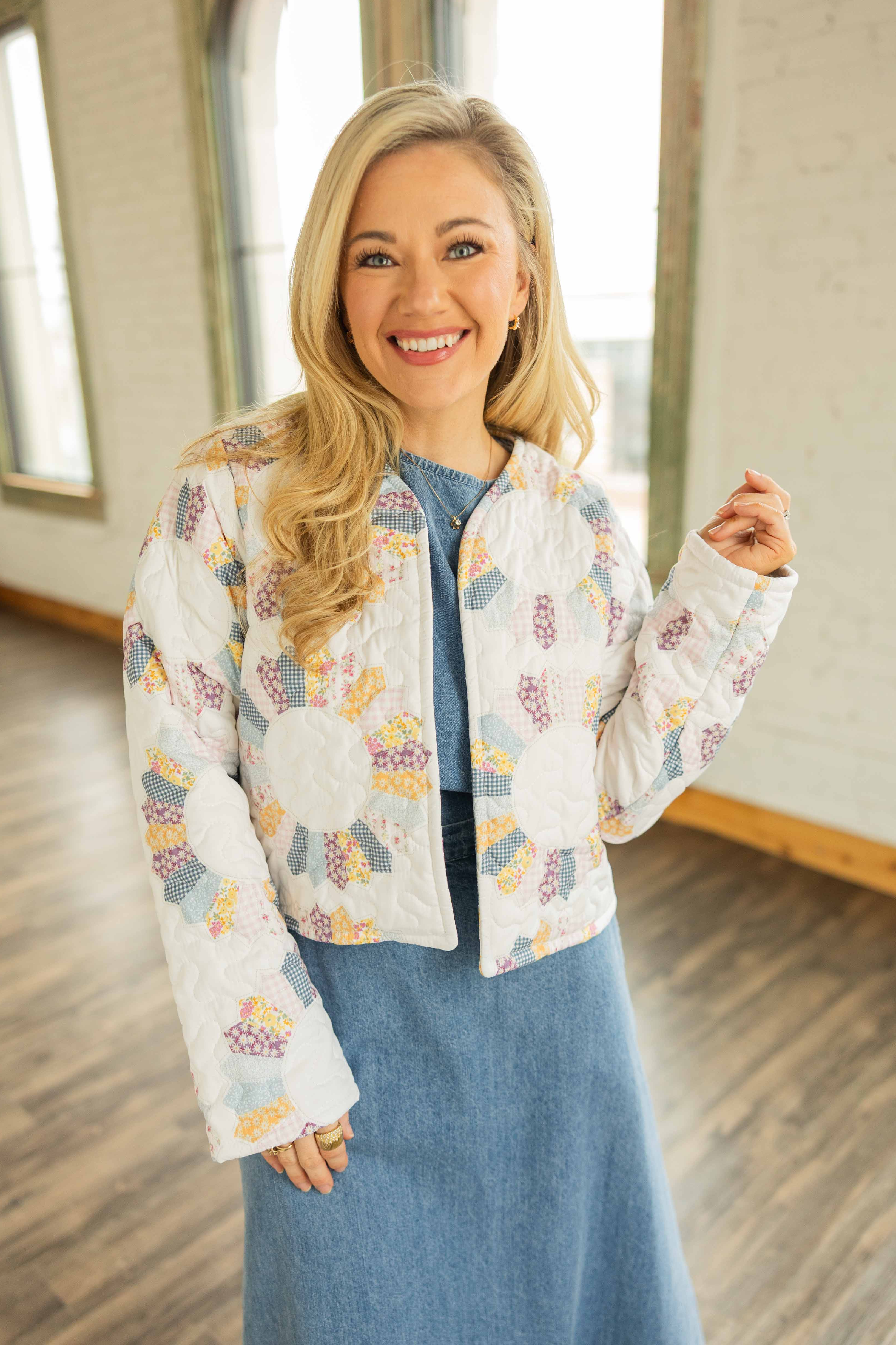 This one is special special. Handmade in Texas and it shows. Classic Dresden quilt pattern with soft pastel tones that feel heirloom but fresh. Cropped length gives it a modern shape while the quilted cotton keeps it cozy without bulk. This is the kind of piece you keep forever and get compliments on every single time you wear it.