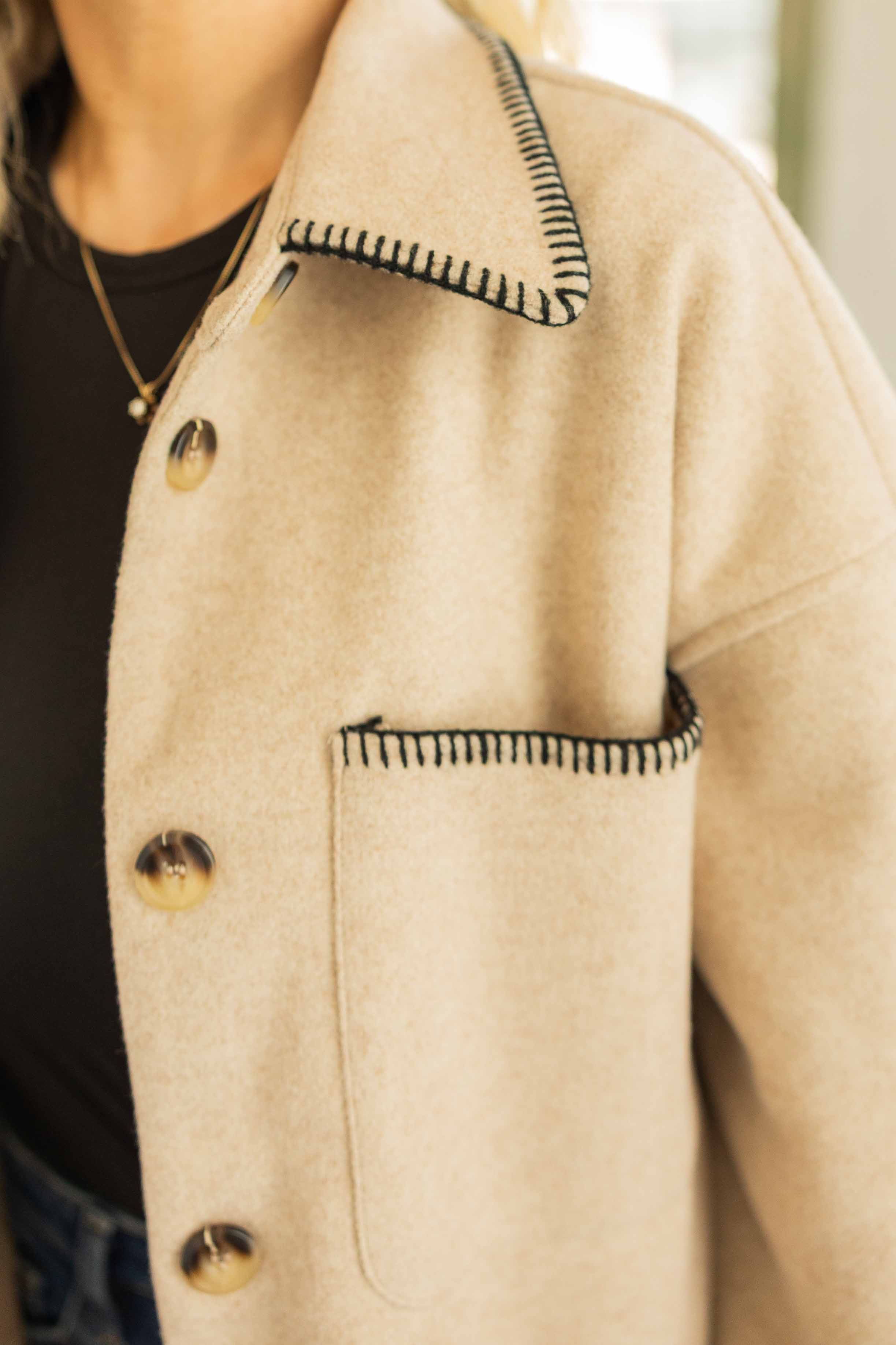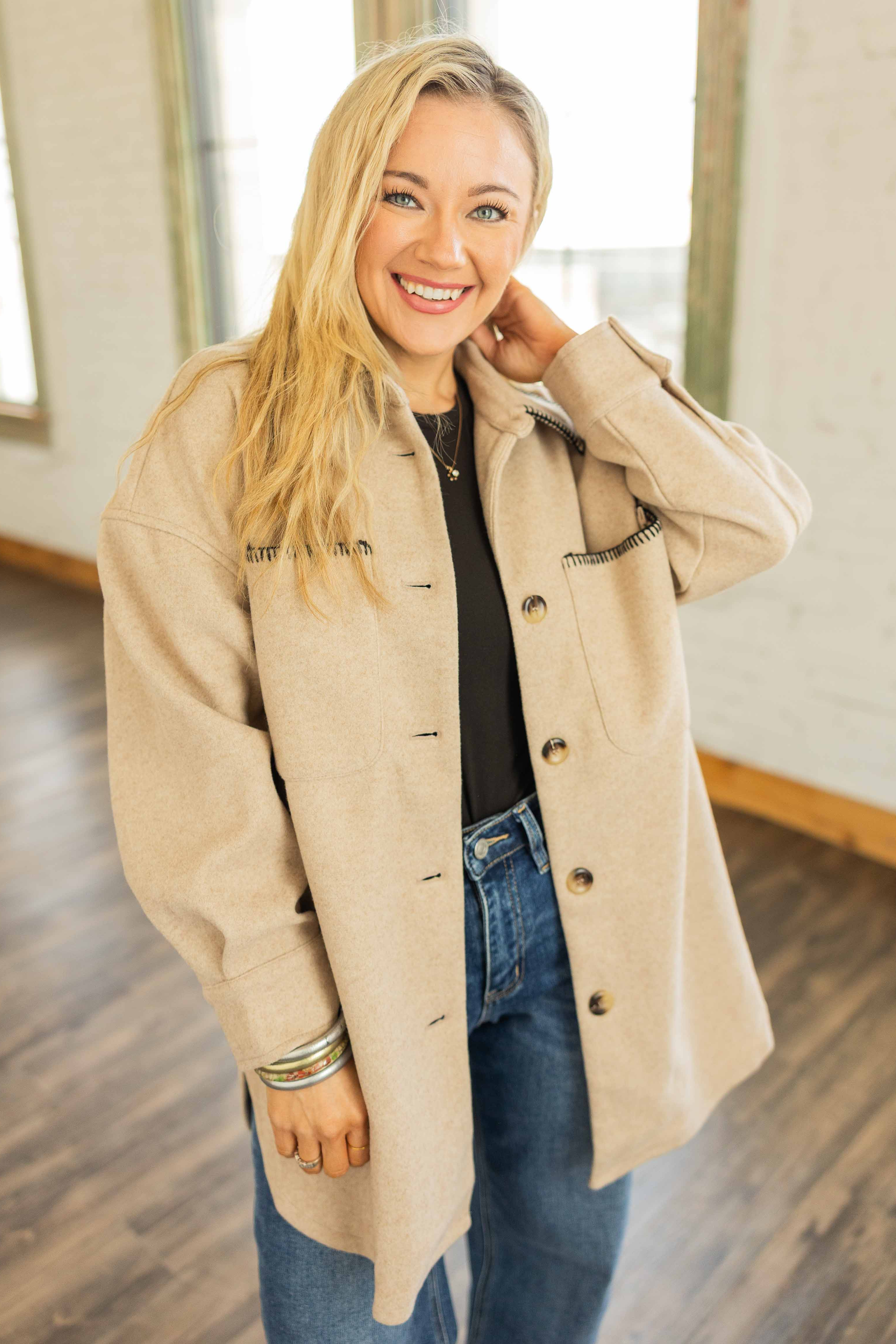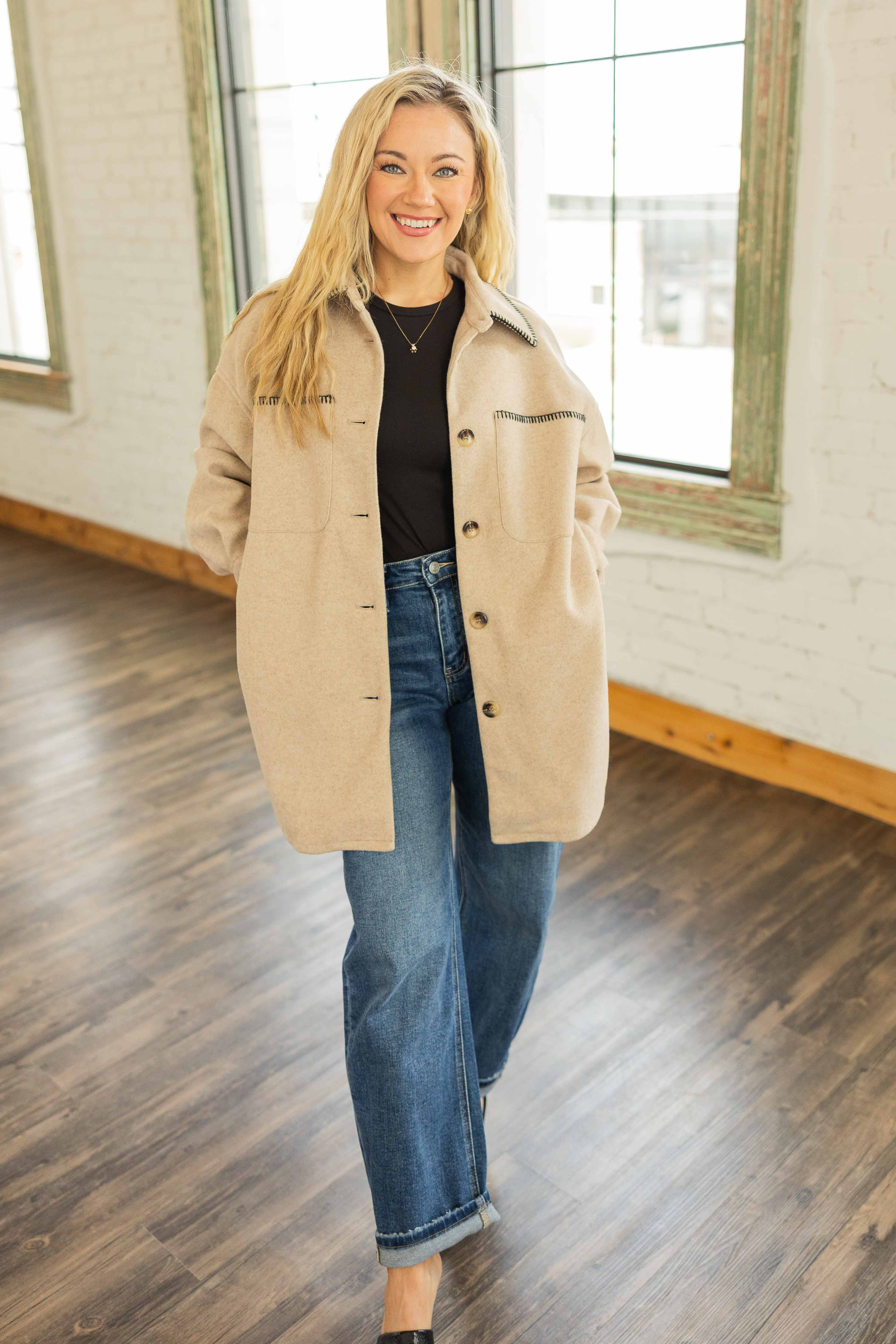 This jacket means business but still knows how to have fun. Structured feel with an oversized fit. The contrast trim gives it that little something extra. It feels polished, cozy, and just a touch western. Throw it on and suddenly your outfit looks intentional.