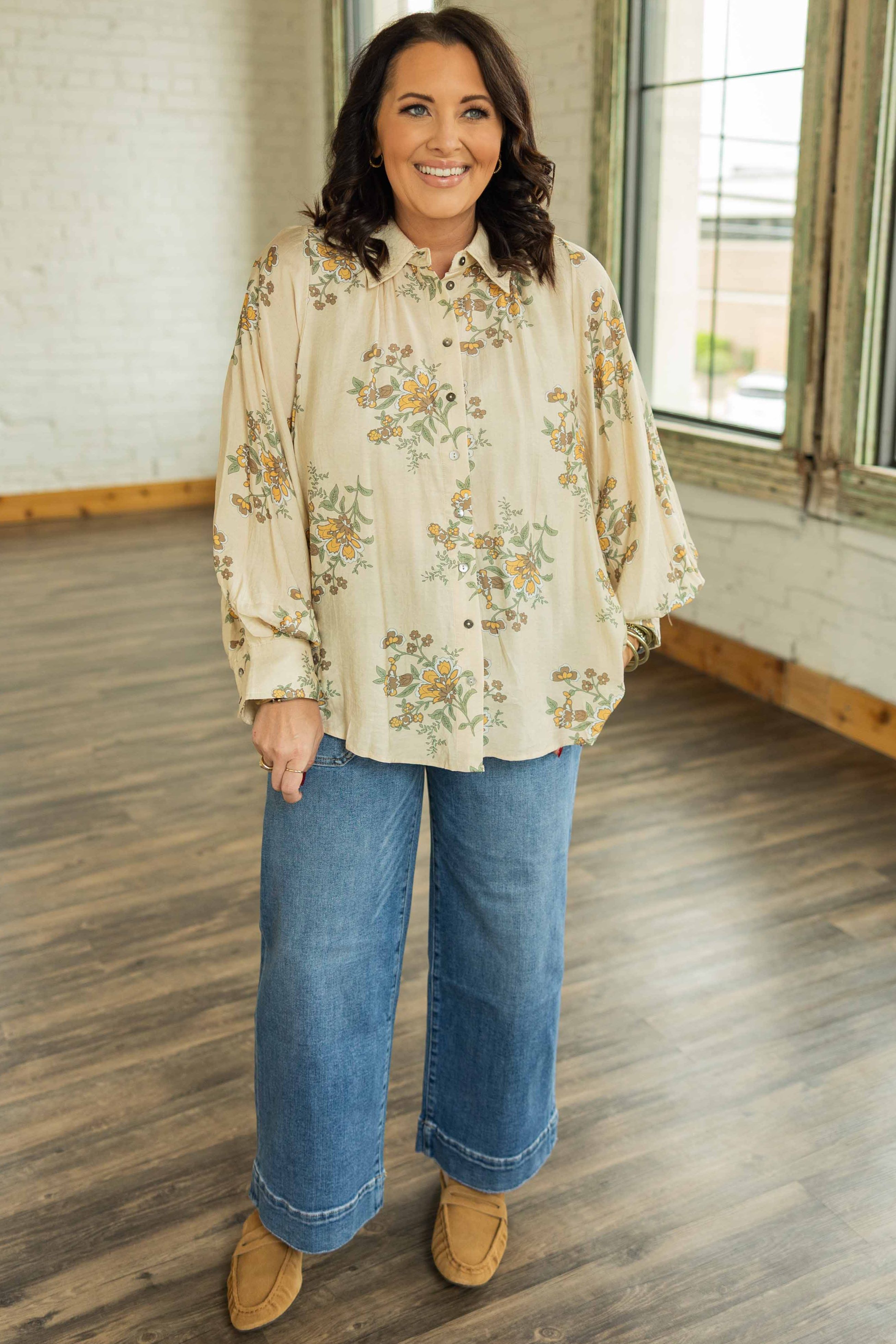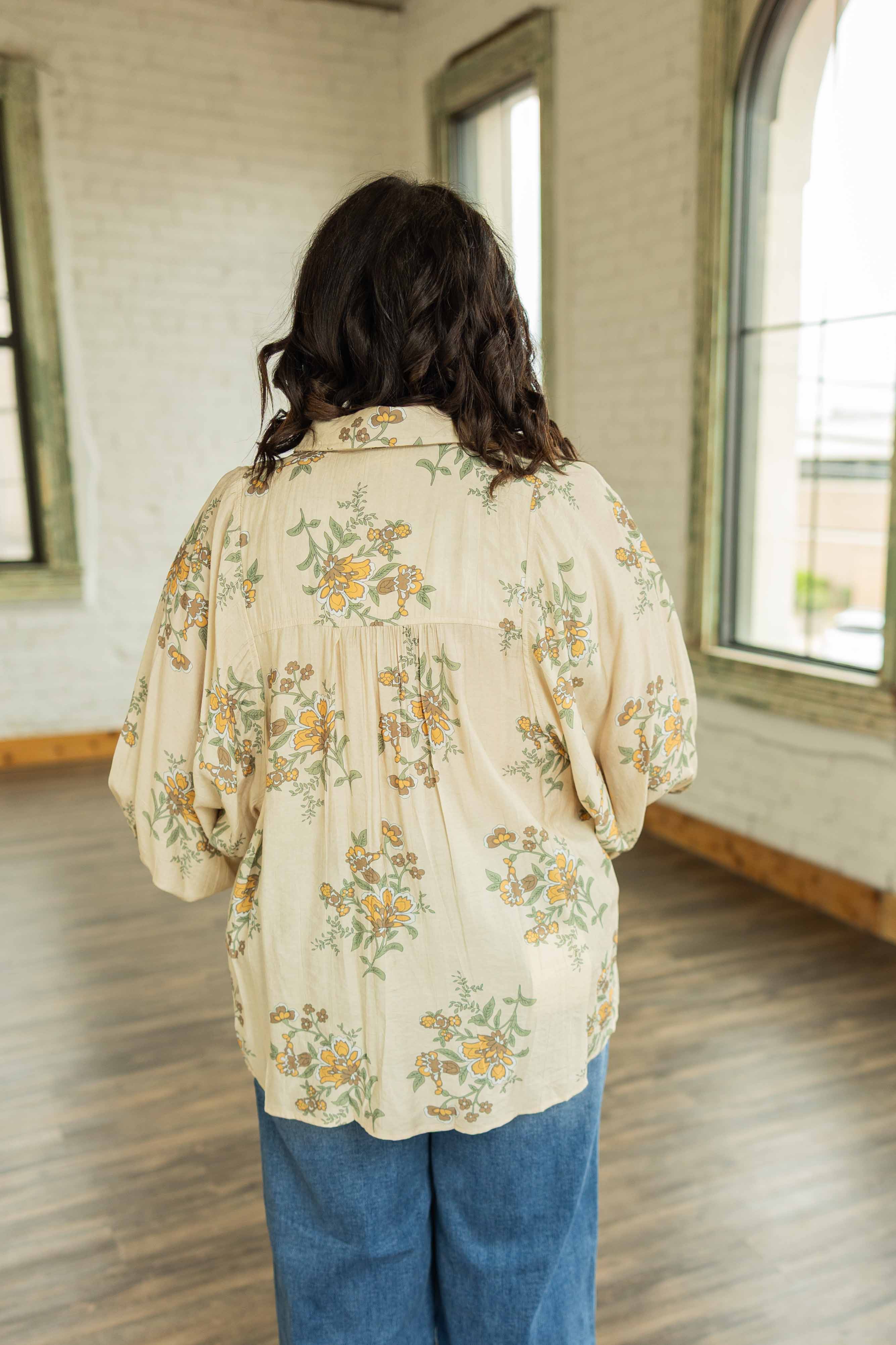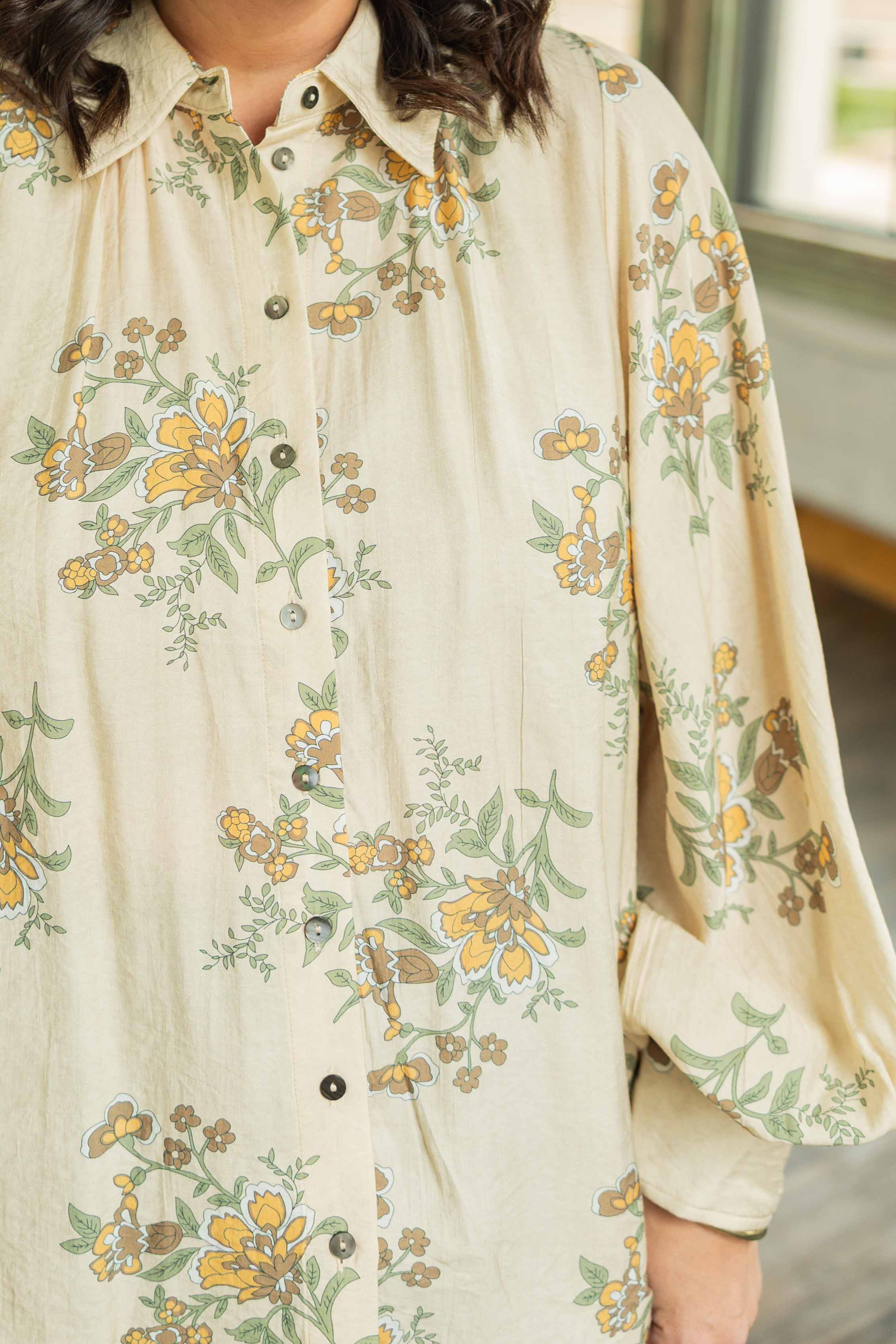 Soft, flowy, and oh-so-pretty. The Bianca Plus Top brings an easy charm with its delicate floral print on a warm cream base. Designed with subtle pleating at the shoulders and back yoke, it drapes beautifully for a relaxed, feminine shape. The classic collar and button cuffs give it a timeless feel—perfect tucked in or left loose.