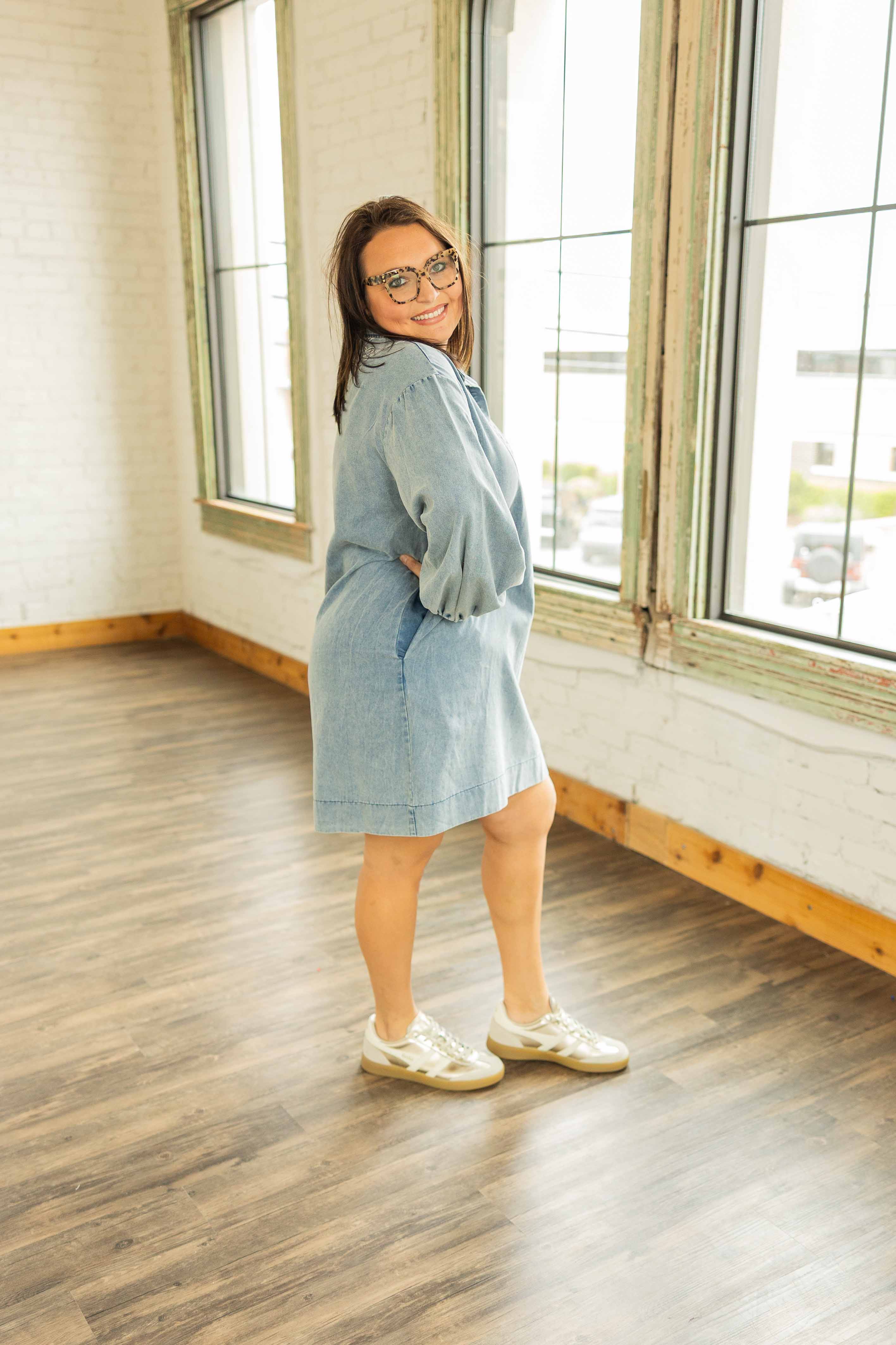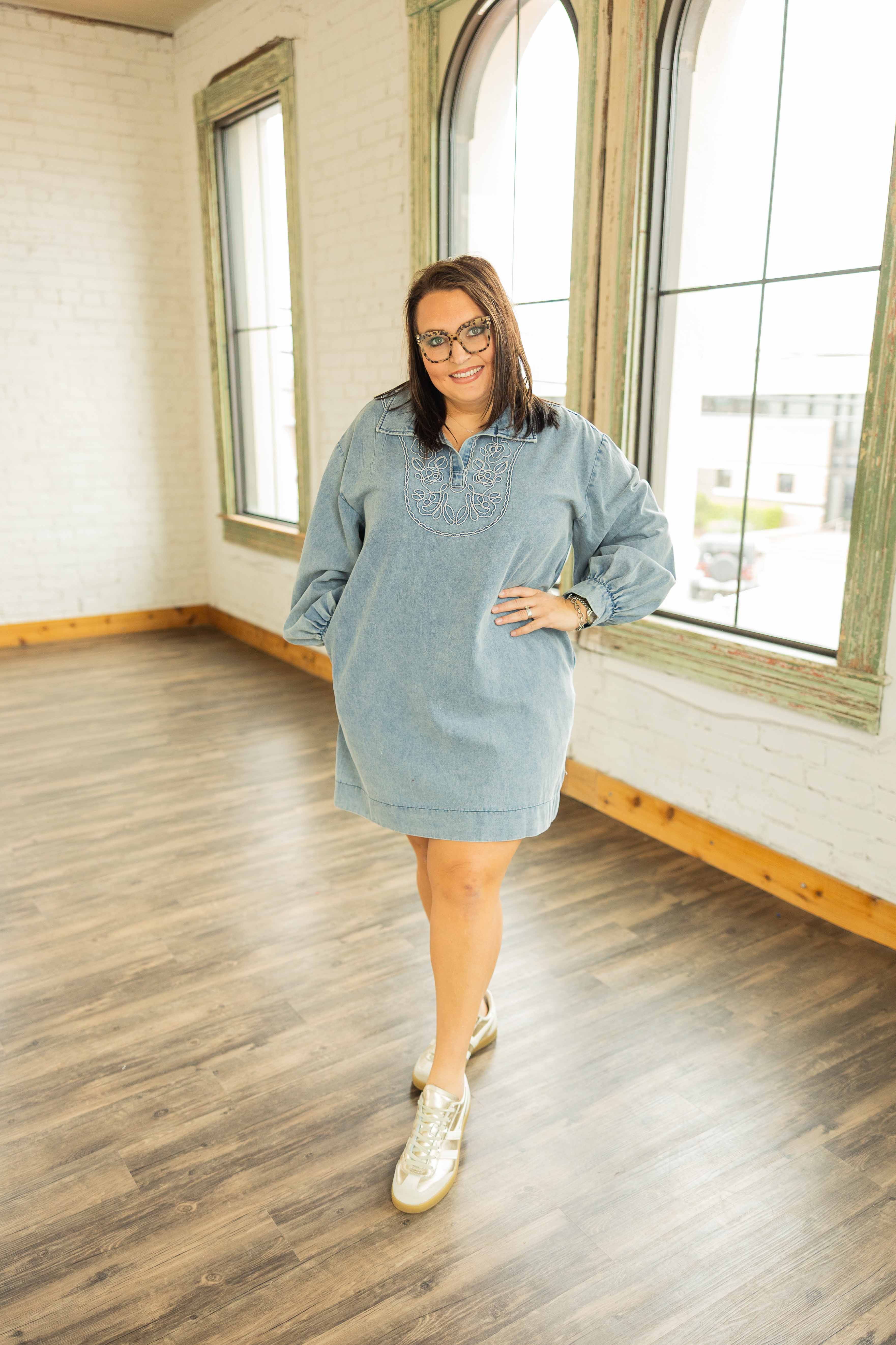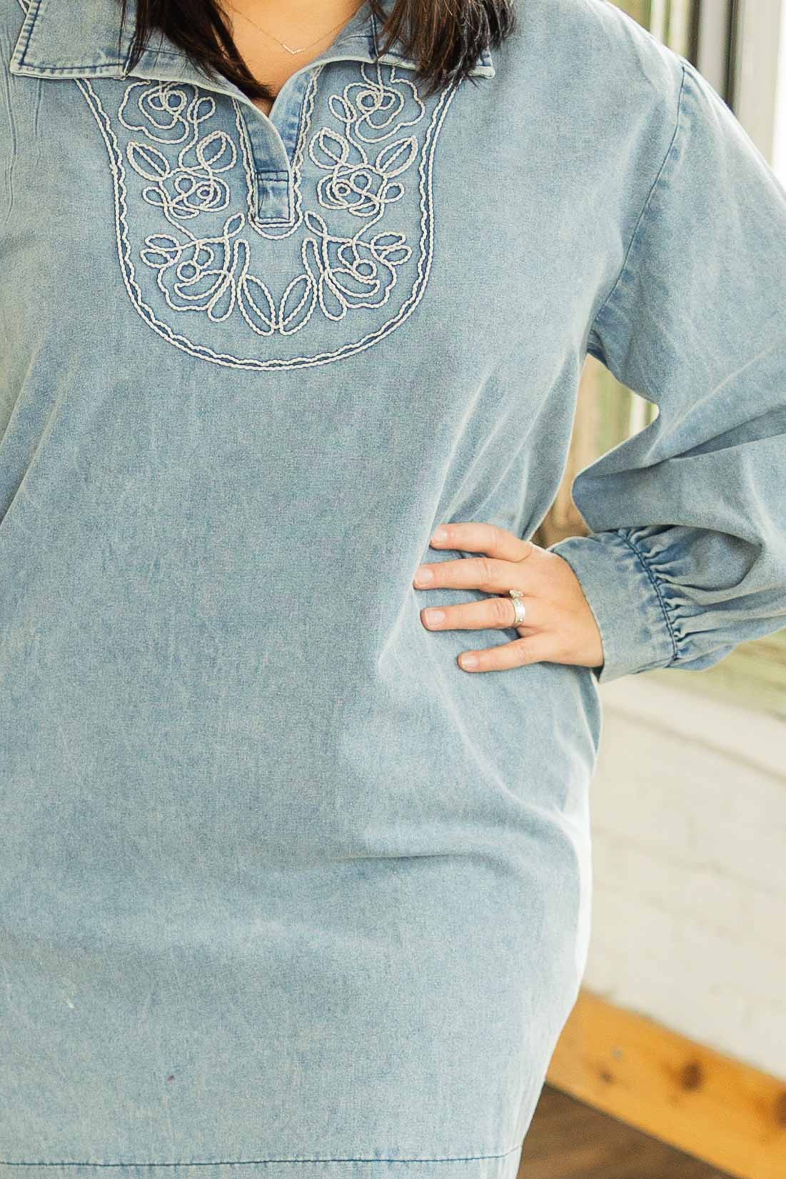This one is easy. Throw it on. Add boots. Go. The soft denim fabric keeps it comfy, while the embroidered neckline gives it that little something extra. The roomy fit means no tugging or adjusting, and yes, it has pockets because we know better. The washed denim blue color makes it a year round staple that works now and later.