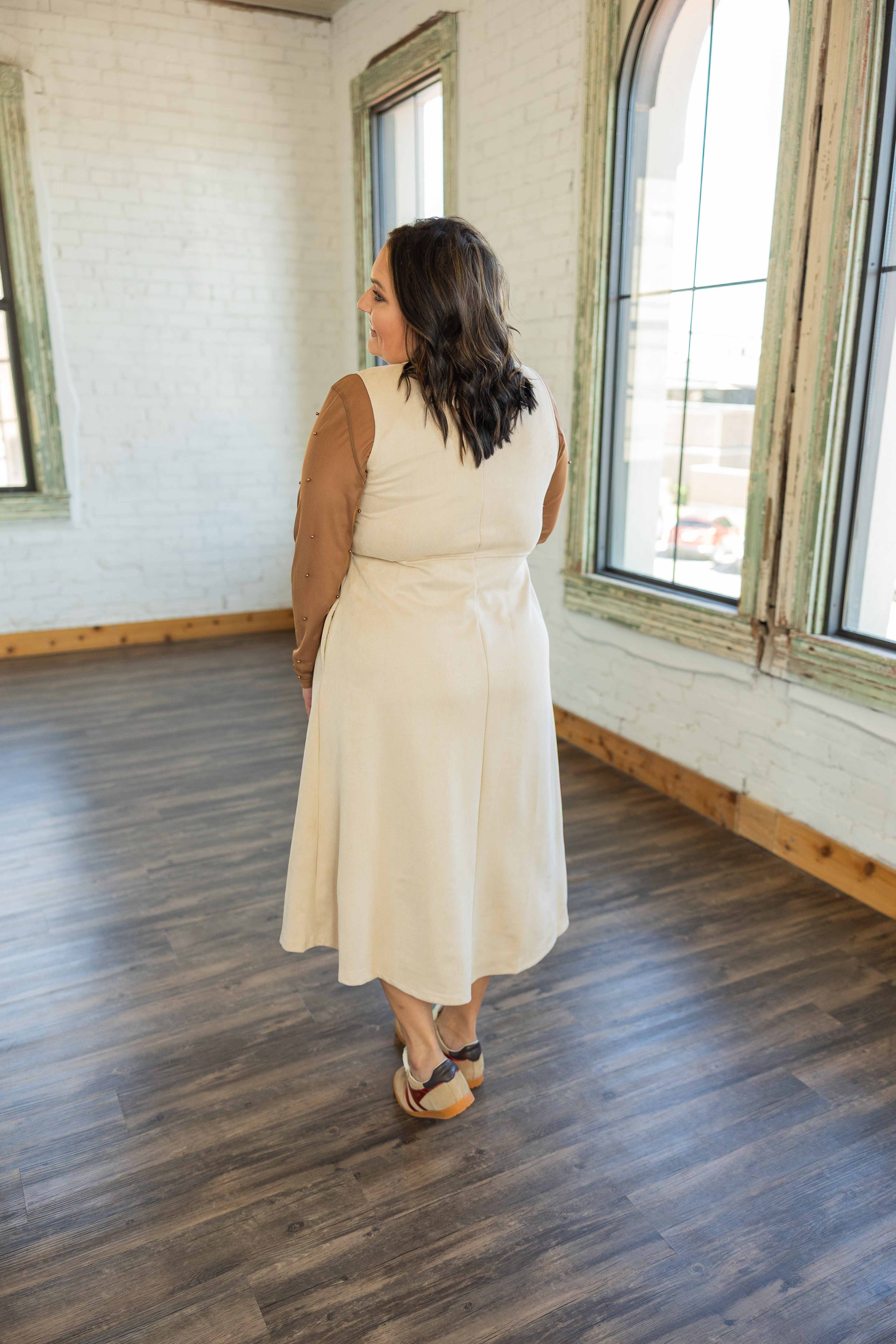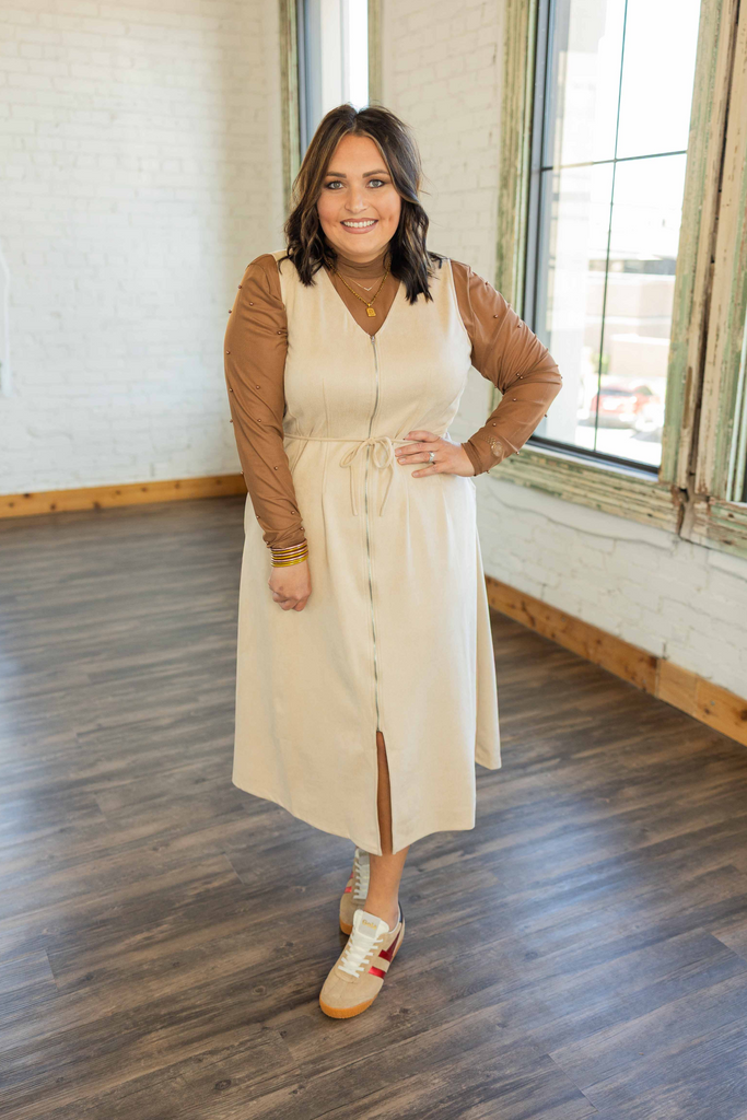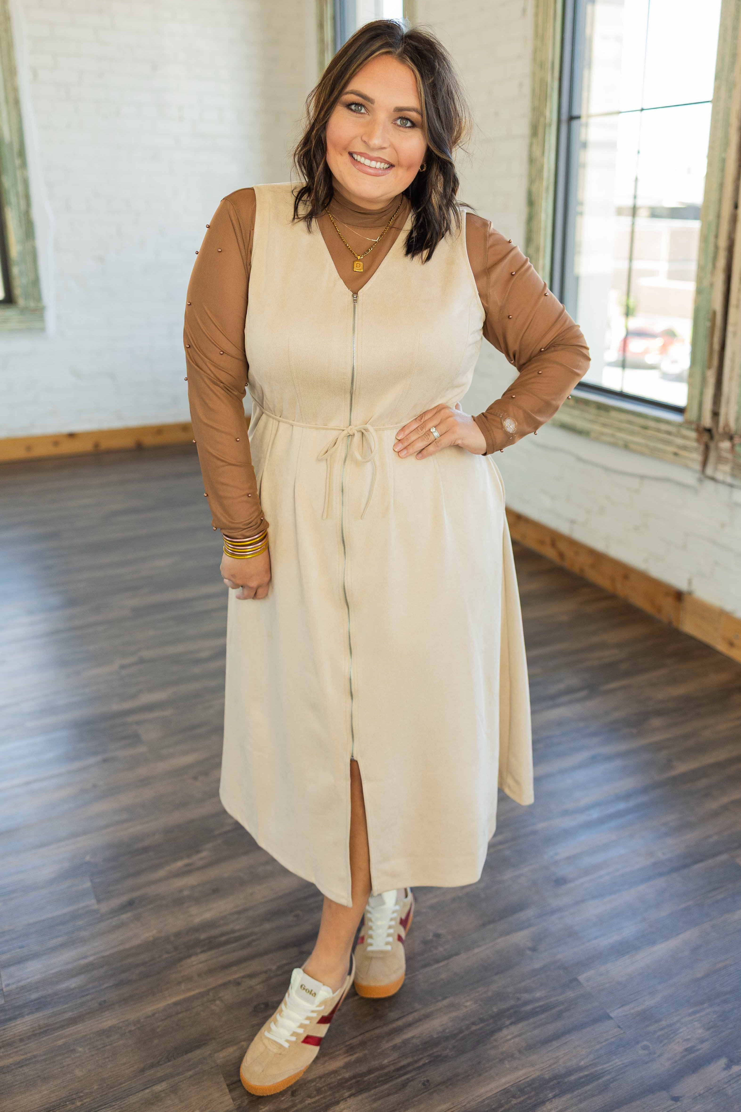 Say hello to a neutral moment worth keeping on repeat. The Winnie Dress is a soft suede midi that zips down the front, ties at the waist, and flatters without trying too hard. The warm beige tone makes it a perfect layering piece for fall—pair it with a fitted mock neck or graphic tee underneath and your favorite sneakers or boots.