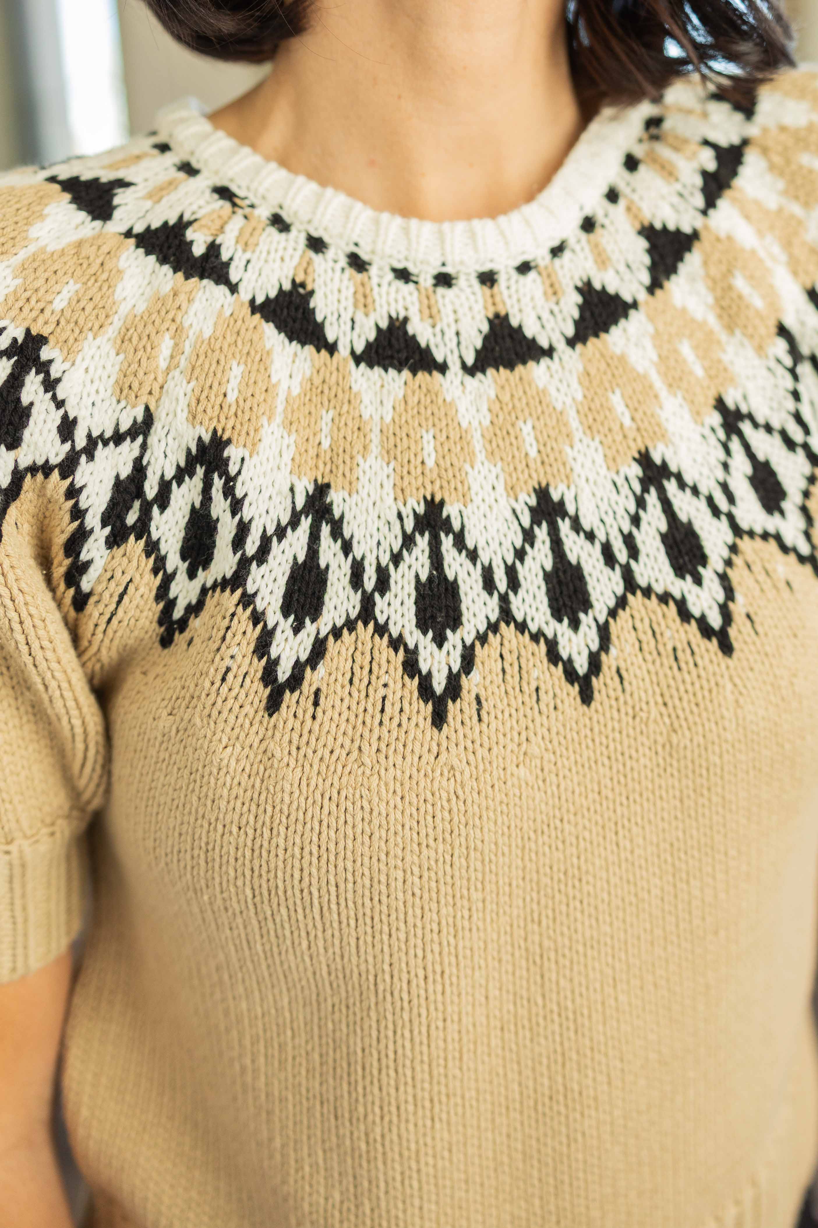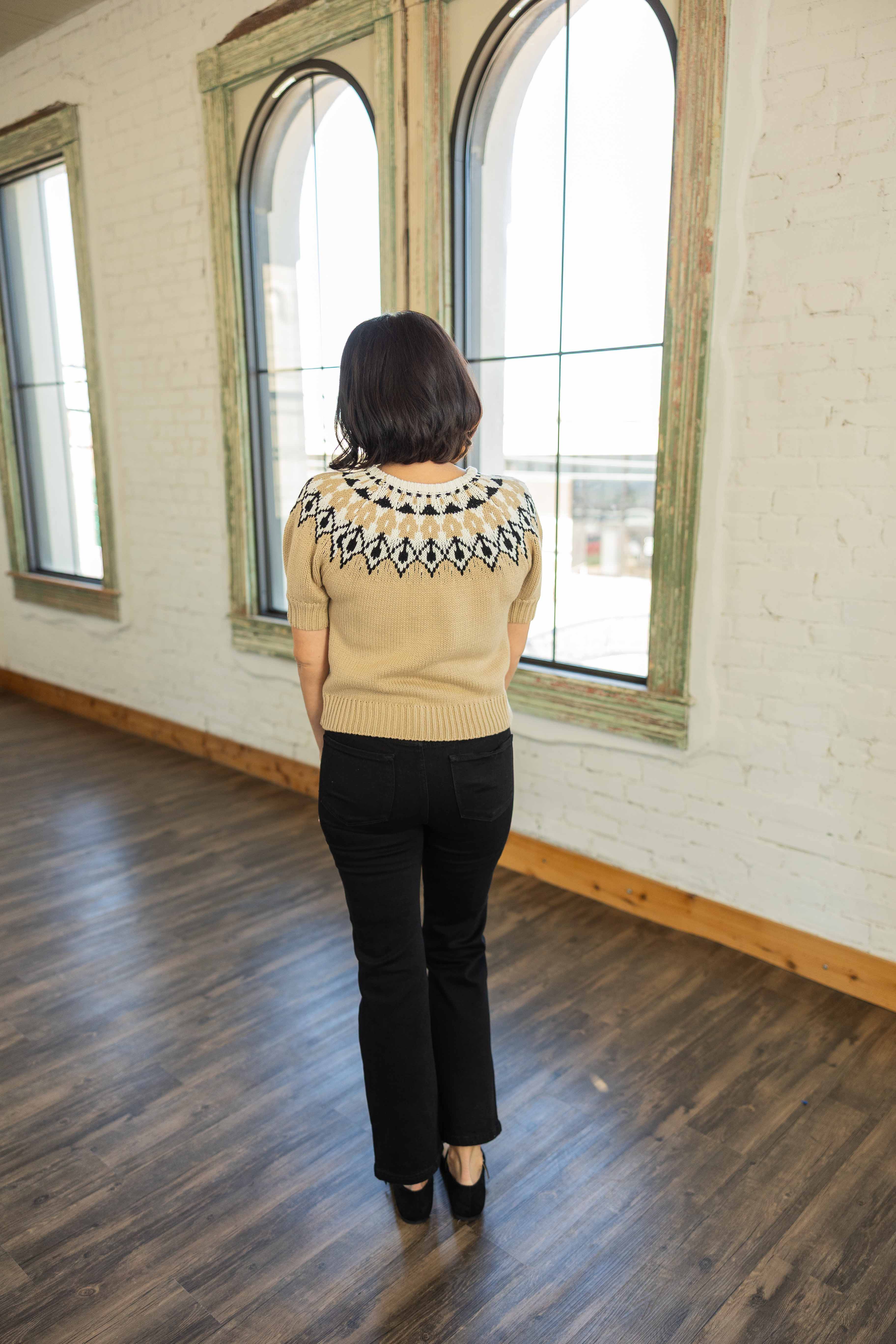 This one feels classic with a little twist. Soft knit. Pretty patterning. Easy shape. The neutral tan base with black and cream detail gives it that cozy vintage vibe, while the slightly cropped length keeps it current. It hits just right at the waist, so it works beautifully with high rise denim. Polished enough for plans. Comfortable enough for all day.