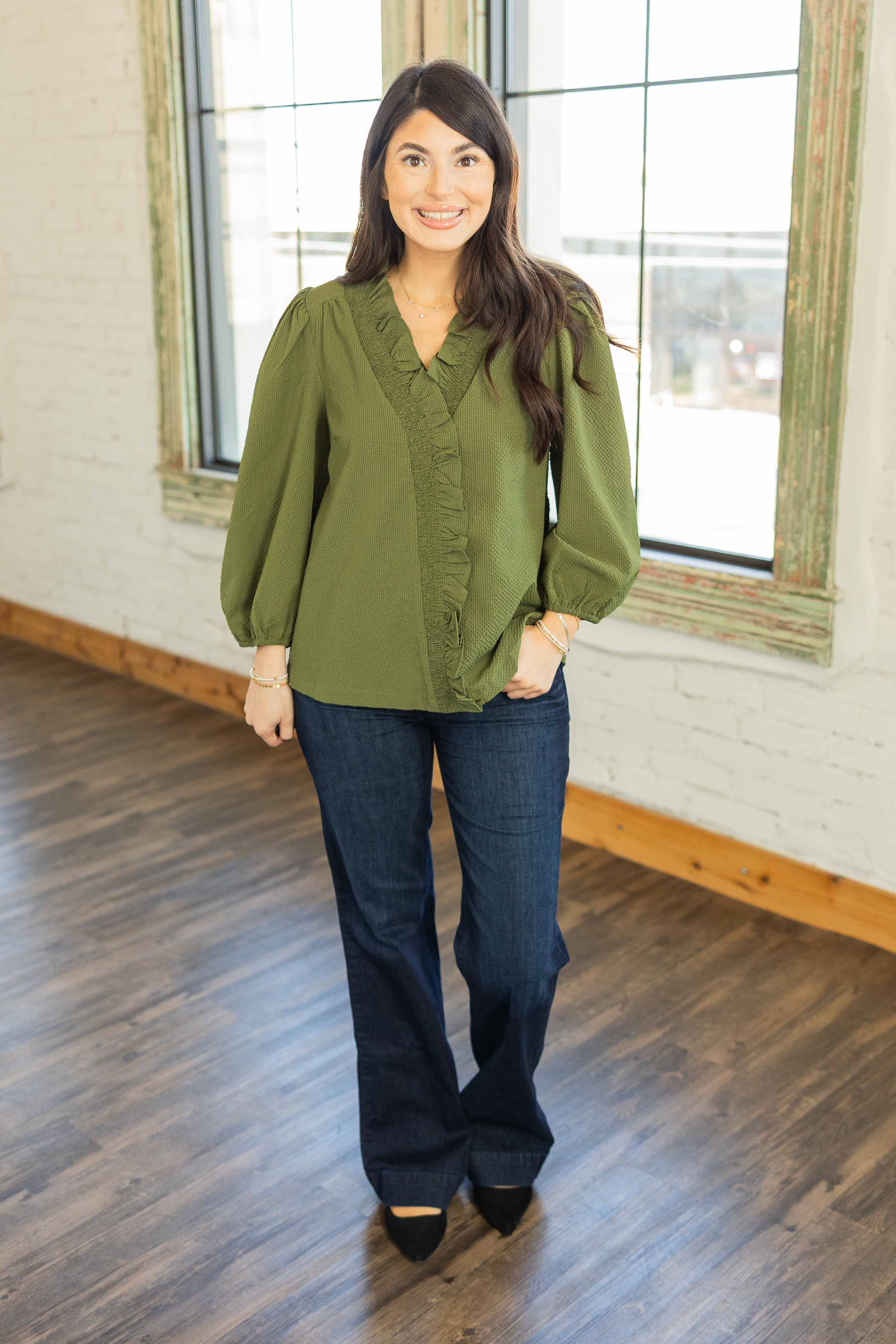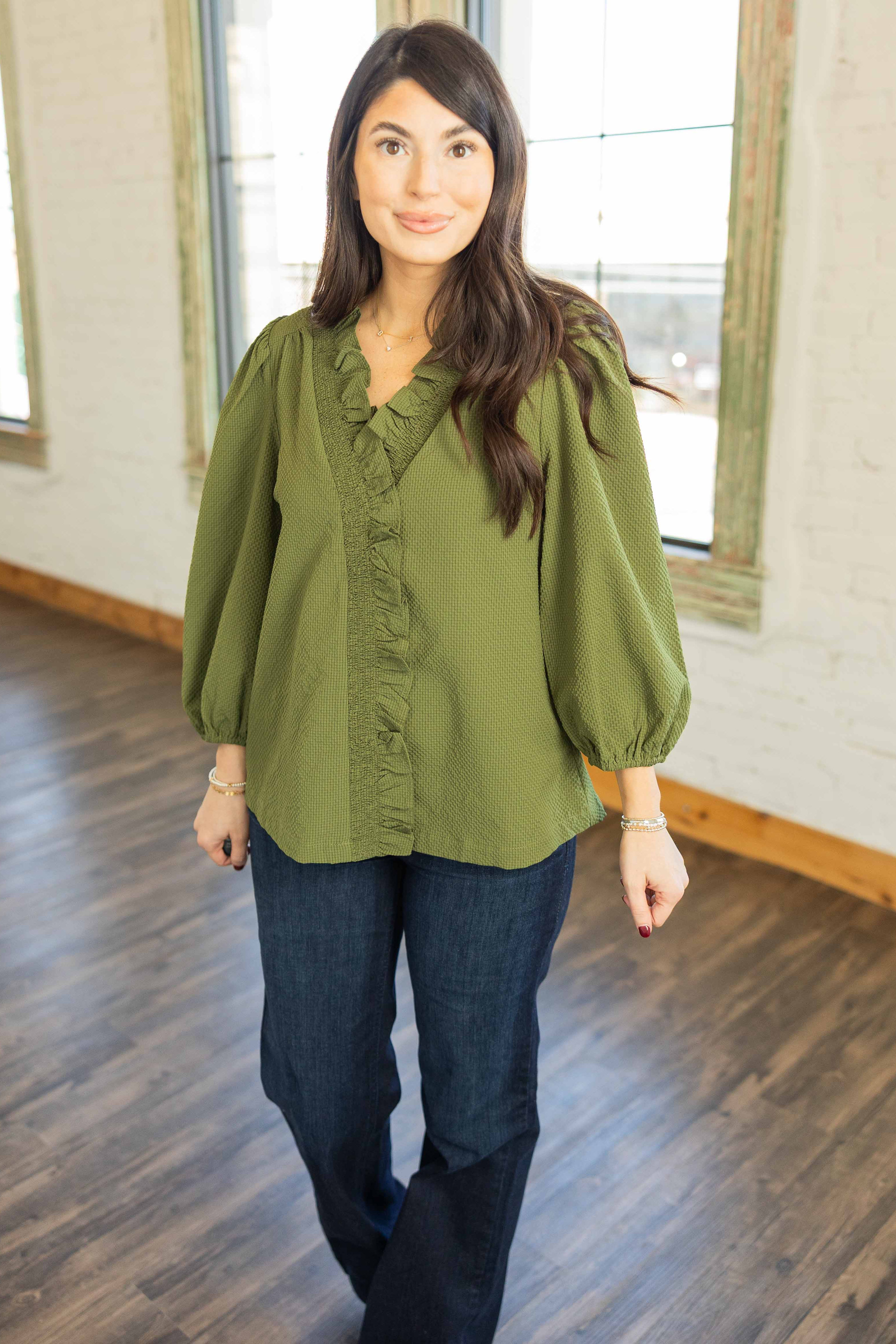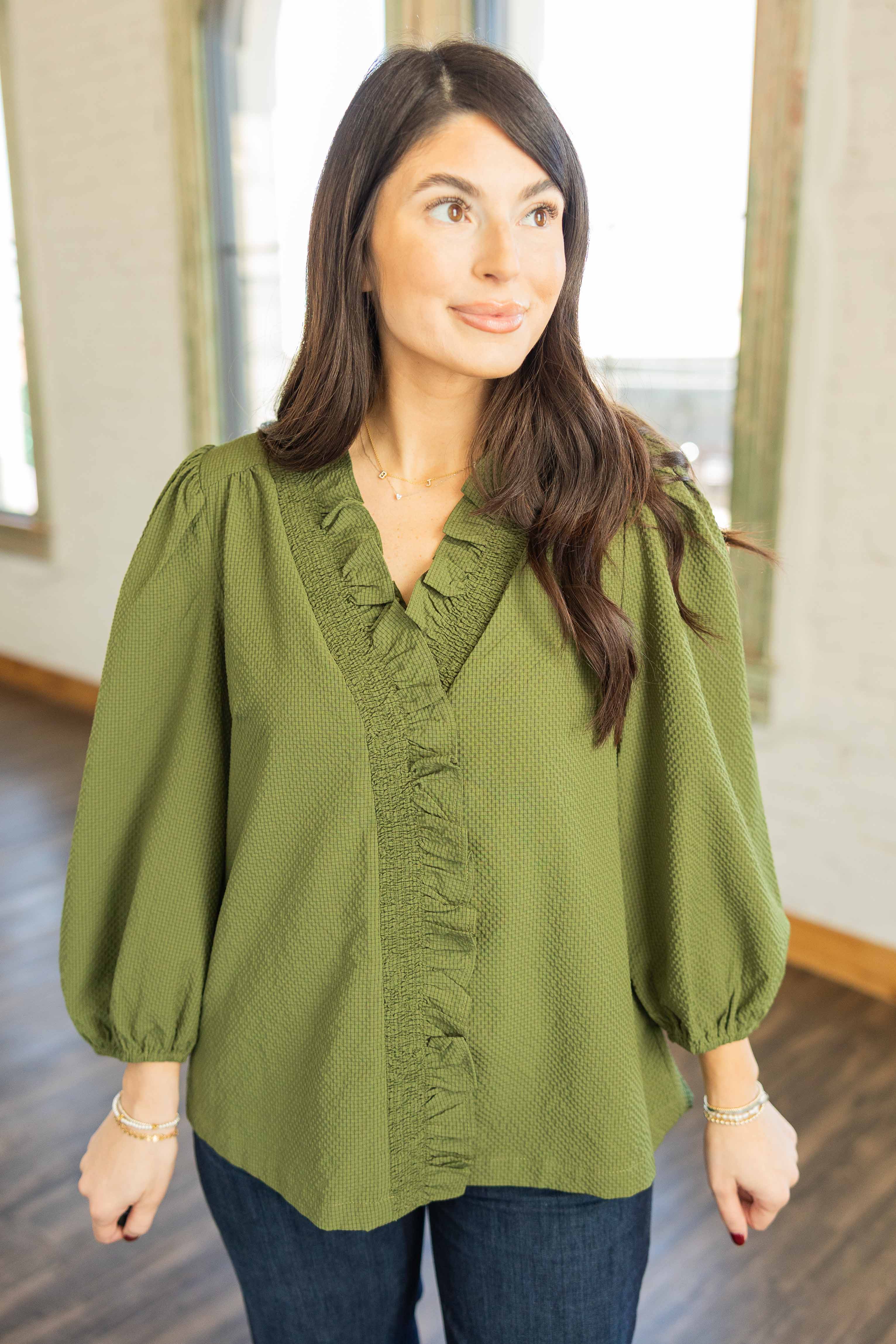 A little texture and a little ruffle go a long way. This soft olive top has a relaxed drape with smocked ruffle trim along the split neckline for subtle dimension. The 3/4 sleeves with elastic cuffs keep it polished and easy. Lightweight and non sheer, it is a great throw on and look cute piece.
