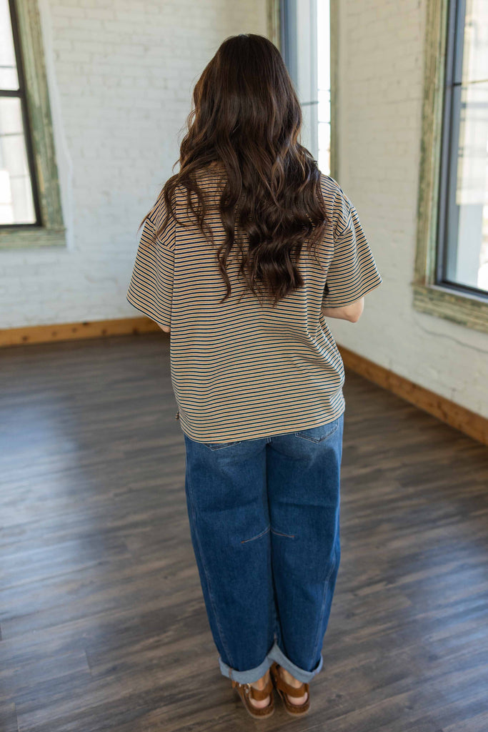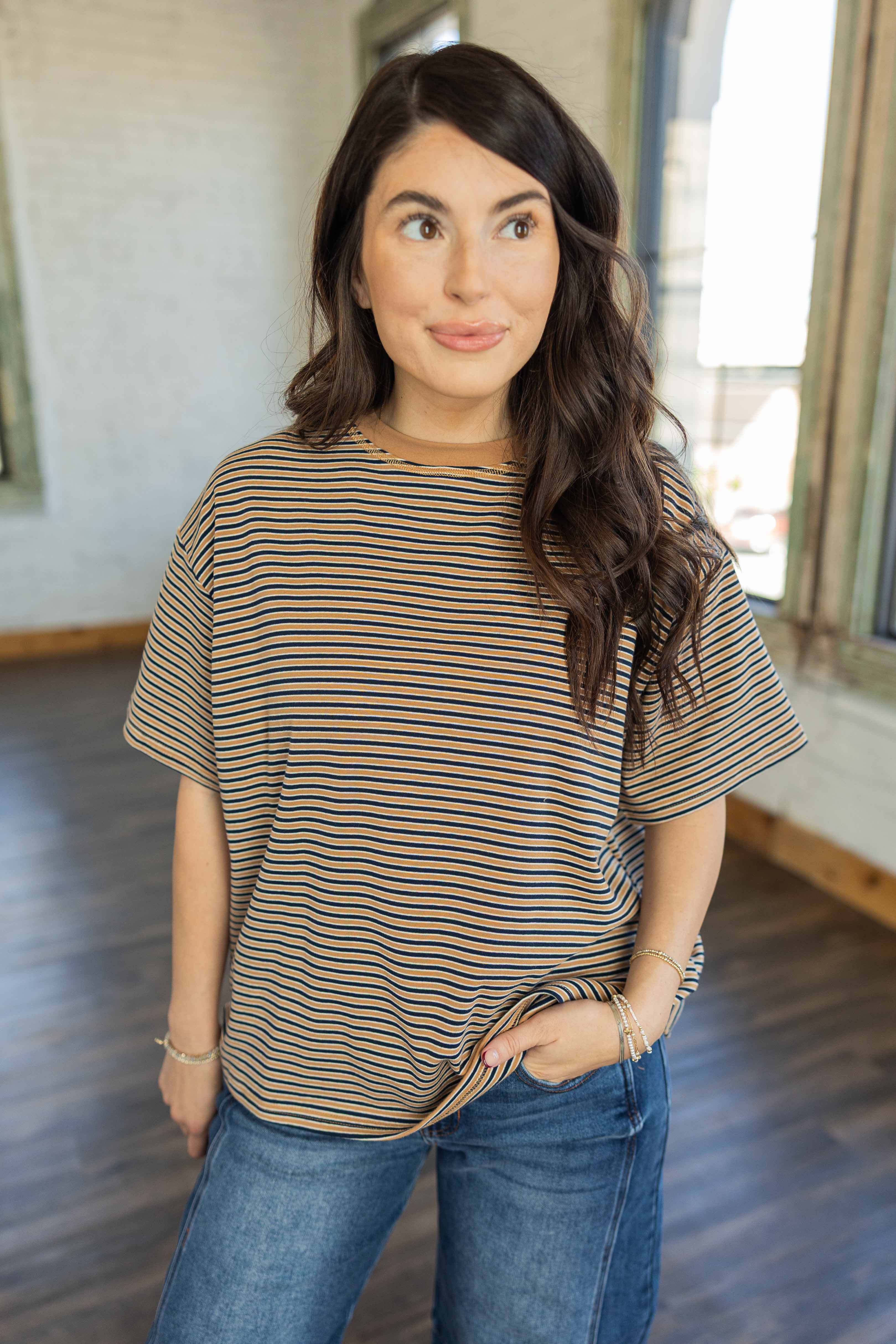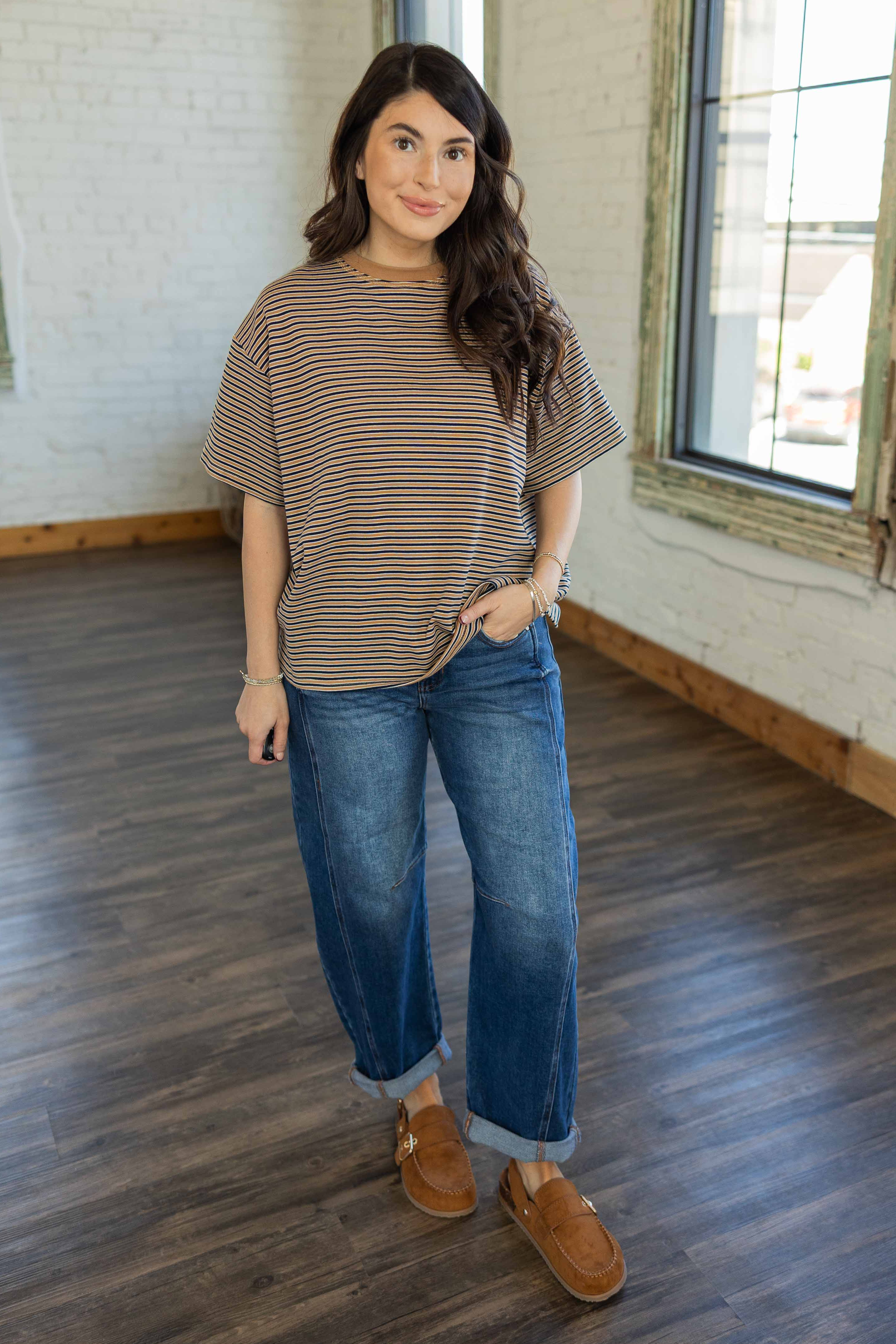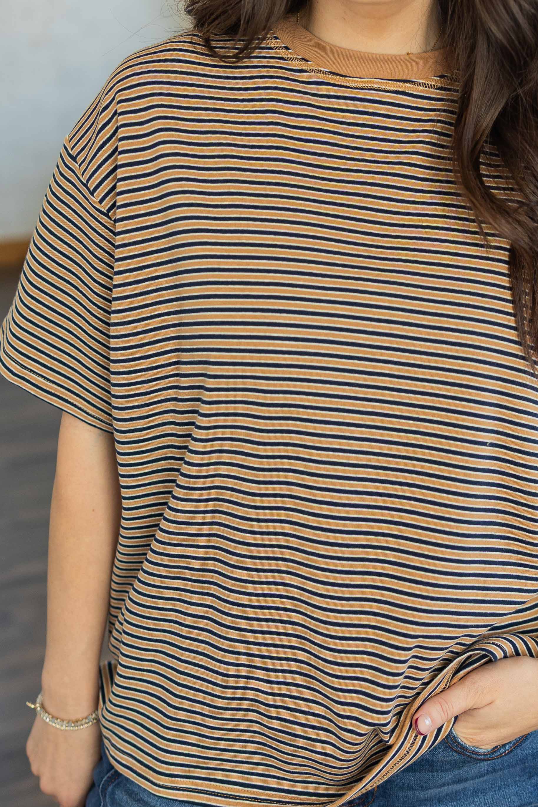 The Lyric Striped Oversized Top is easy, classic, and just a little bit cool. The soft cotton blend keeps it comfy, while the navy, cream, and tan stripes make it an instant outfit maker. With its relaxed shape and ringer neckline, it’s the kind of tee that looks good with everything from jeans to skirts.