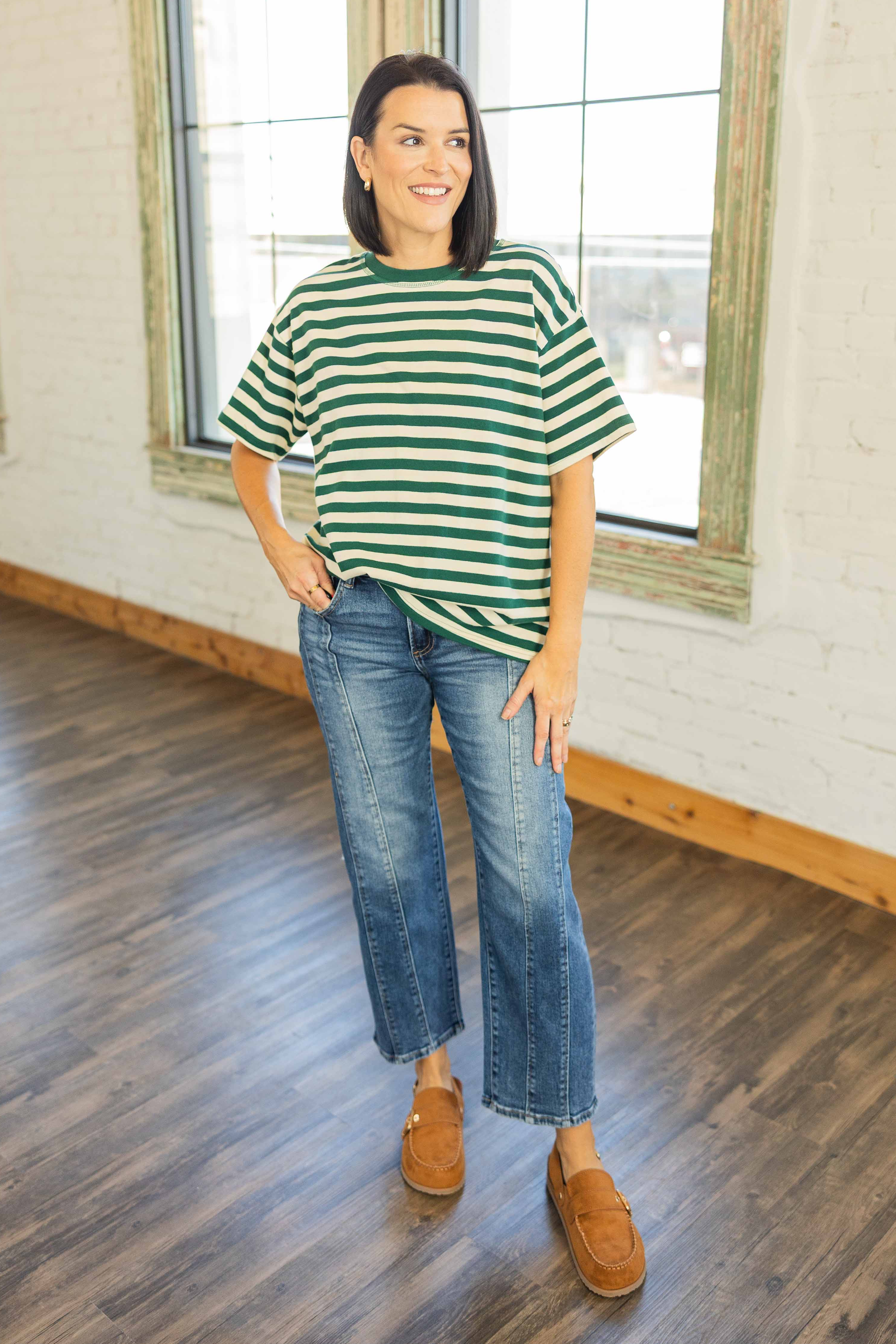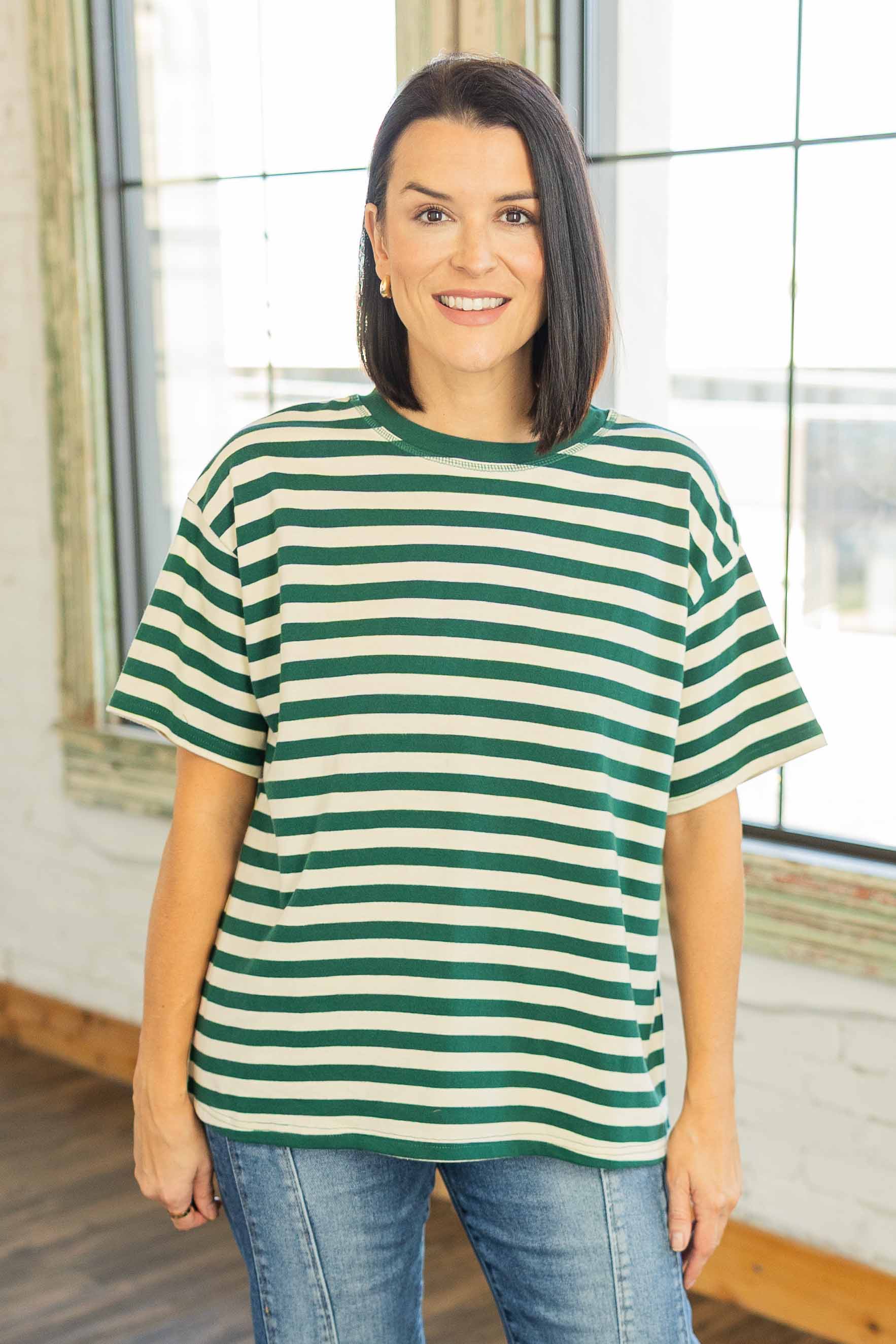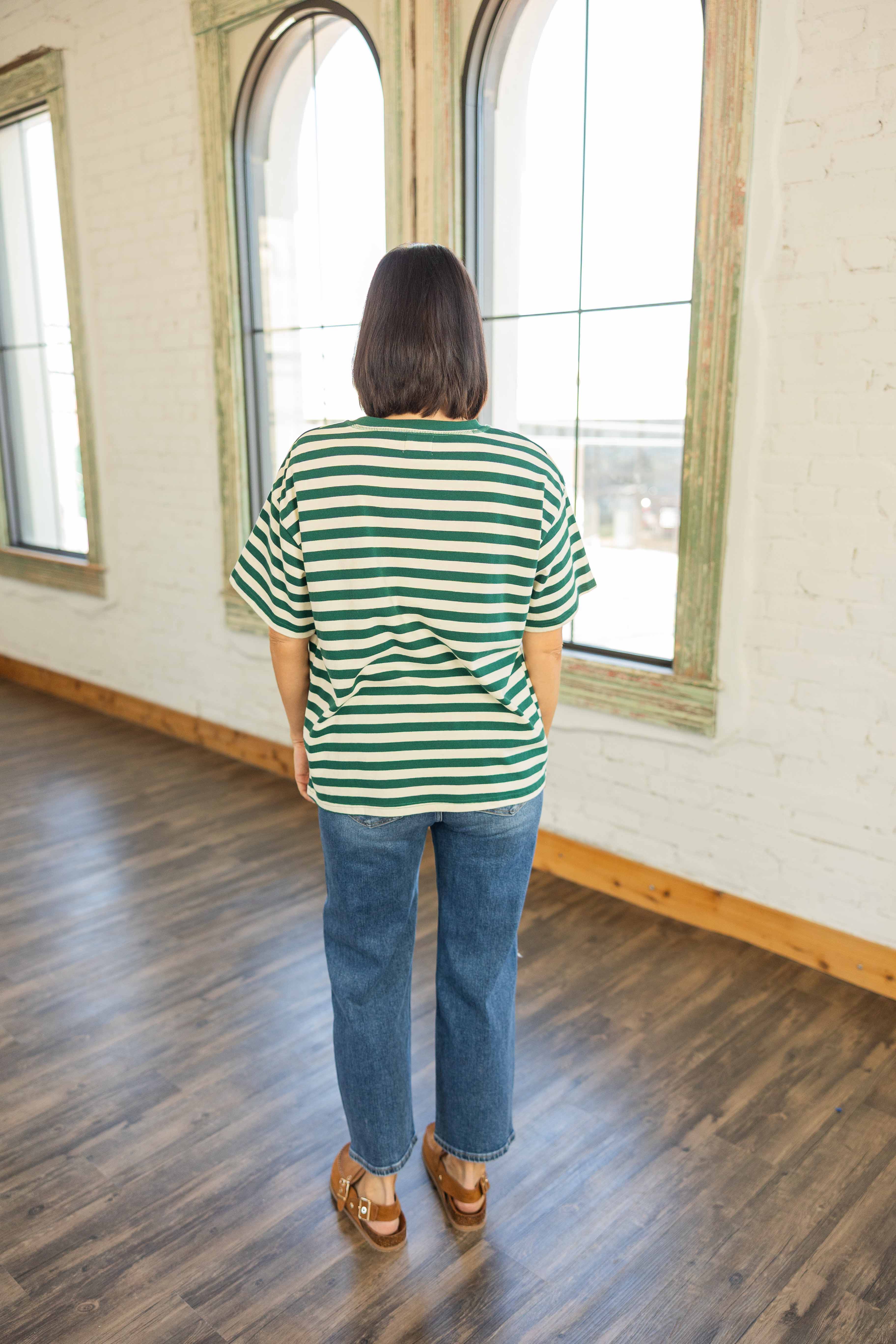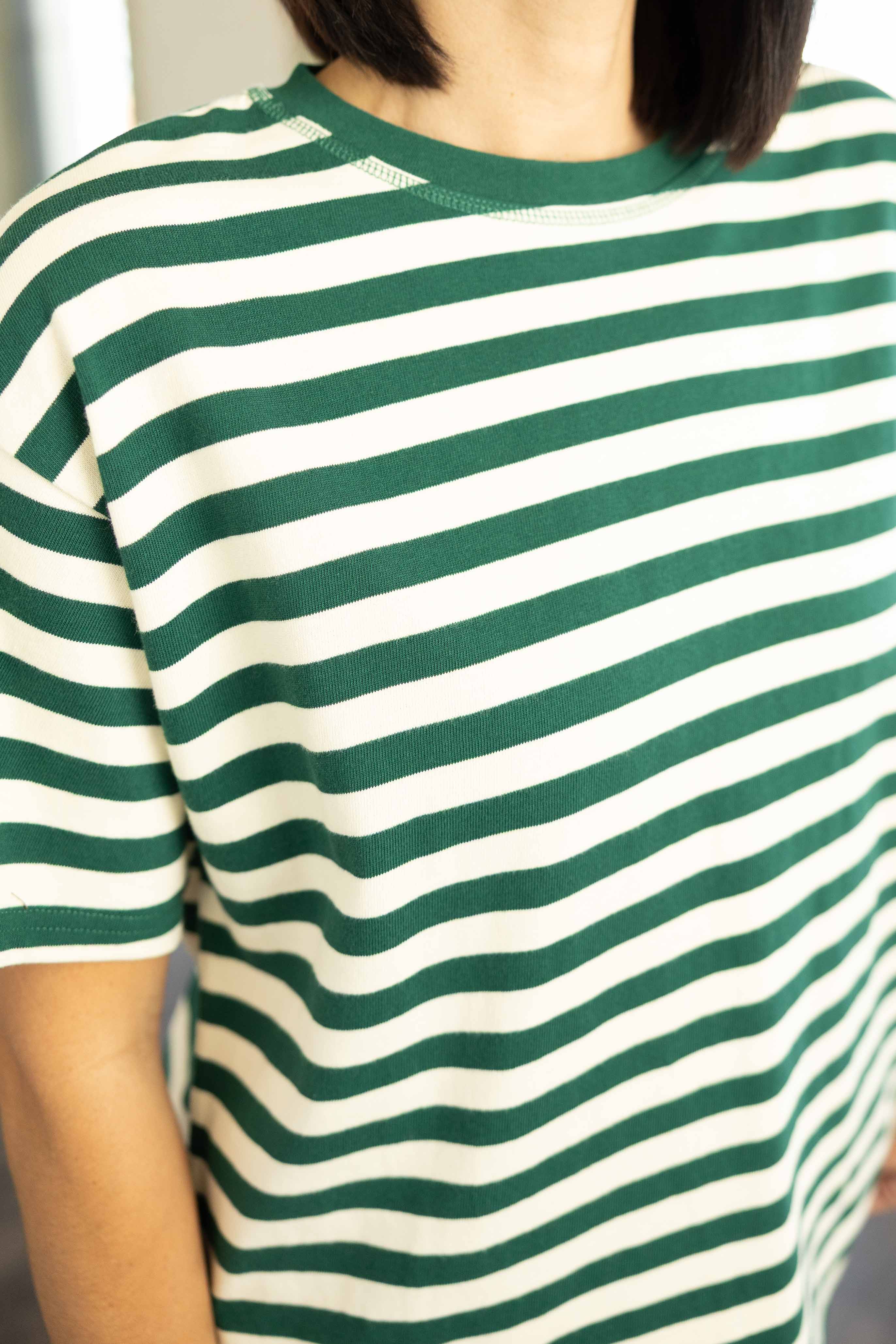 Casual, classic, and easy to wear. This green and cream striped tee gives that effortless oversized vibe. The ringer collar adds a touch of sporty detail and the soft cotton keeps it comfortable. It is an everyday grab and go piece you will reach for often.