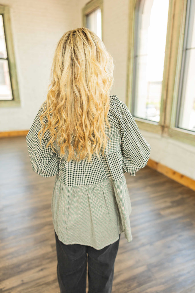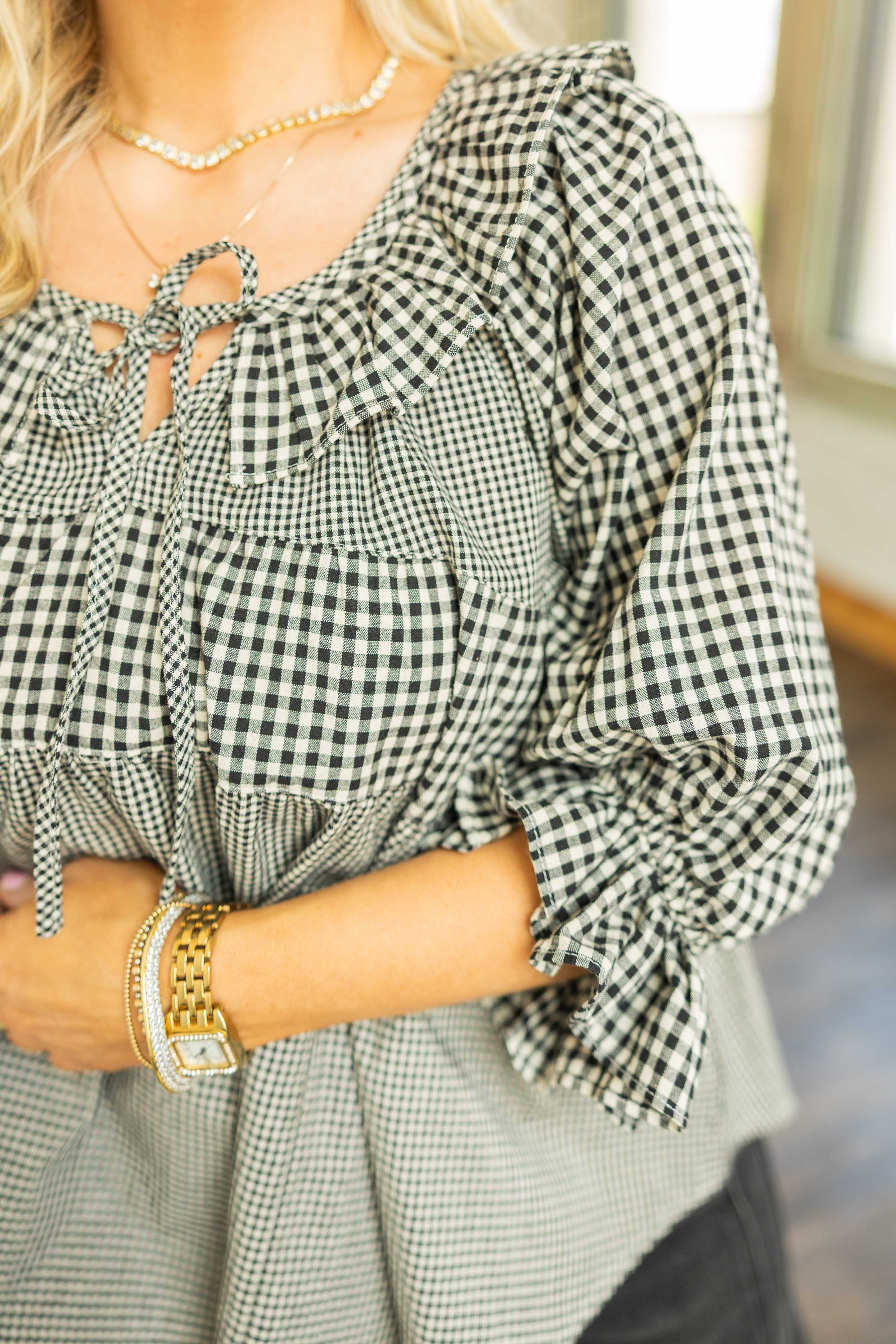 Sweet and timeless, the Zoey Gingham Top is a playful twist on a classic check print. The black and ivory gingham pattern gives it a fresh, everyday feel while the ruffle 3/4 sleeves and front tie neckline add a feminine touch. With a roomy, flowy fit and a high-low hem, this top pairs easily with denim or skirts for a look that’s both comfortable and put-together.