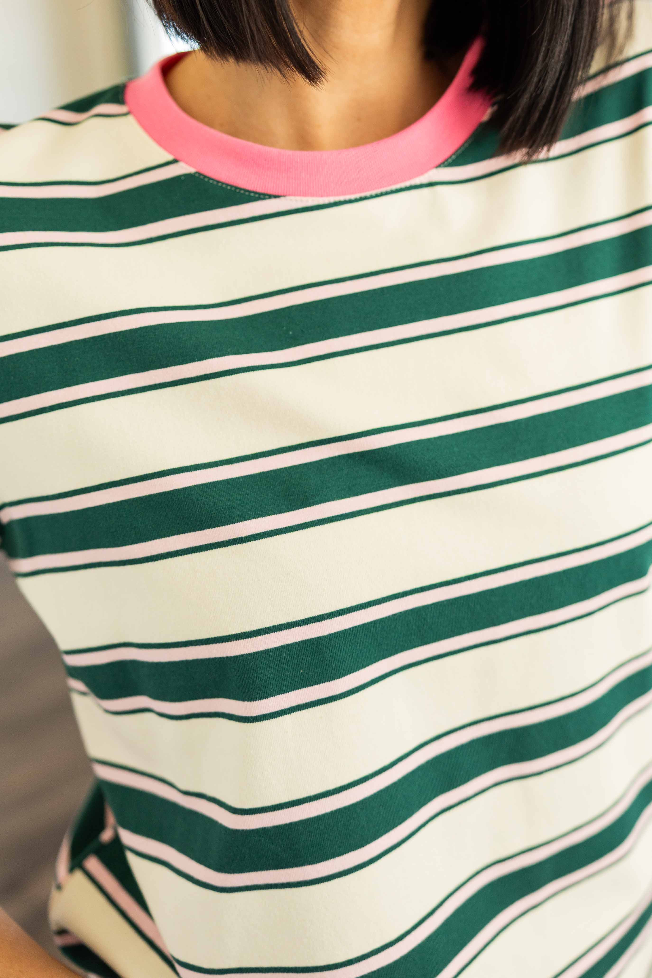 This one is playful in the best way. Cream base with deep green stripes and a pop of pink at the neckline and sleeve hems. It feels sporty, fresh, and just a little unexpected.