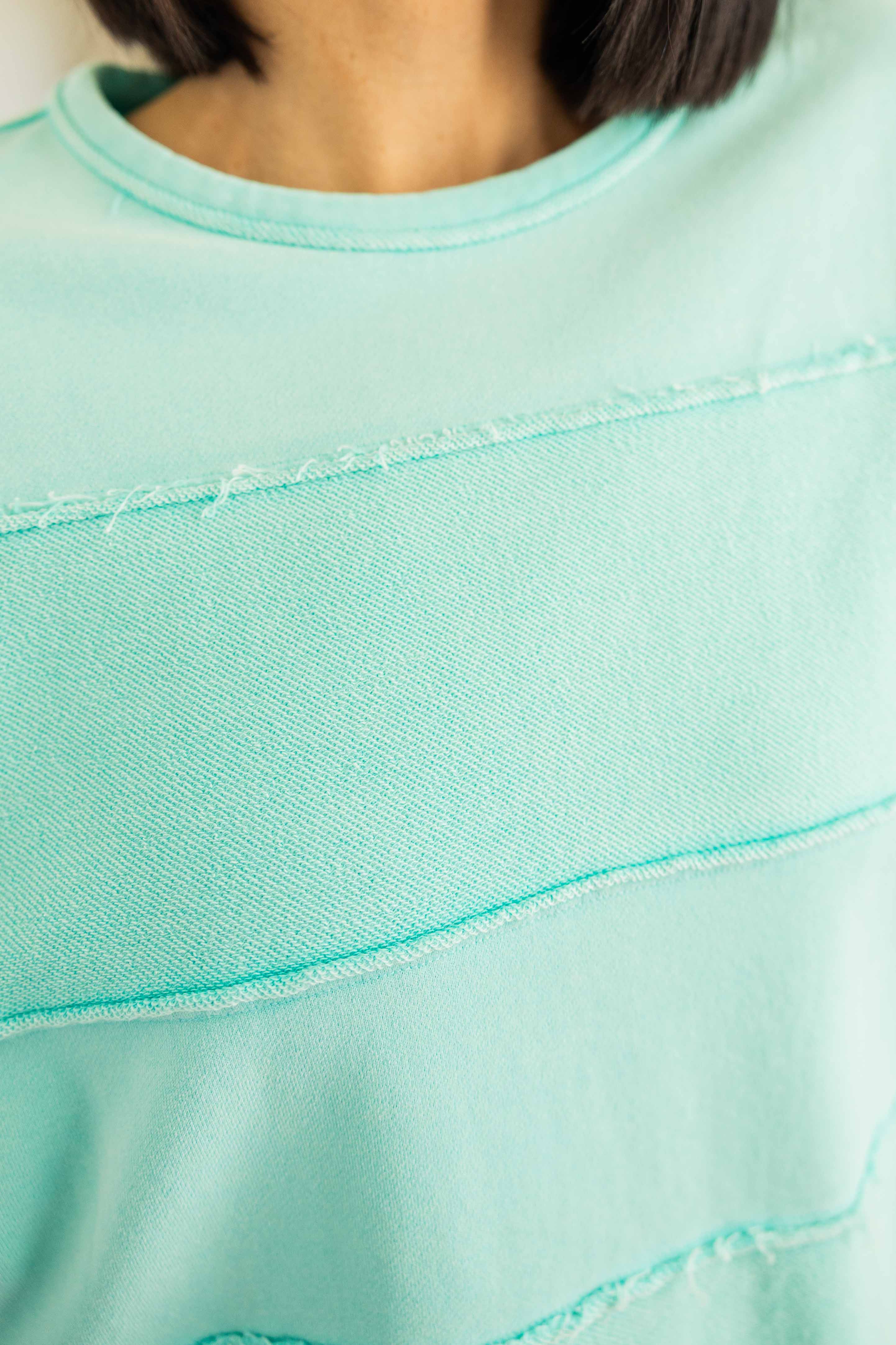 This minty mineral wash is giving fresh start energy. Soft seafoam green with that lived in terry texture that feels broken in from day one. It is cozy without being heavy. Casual without looking sloppy.