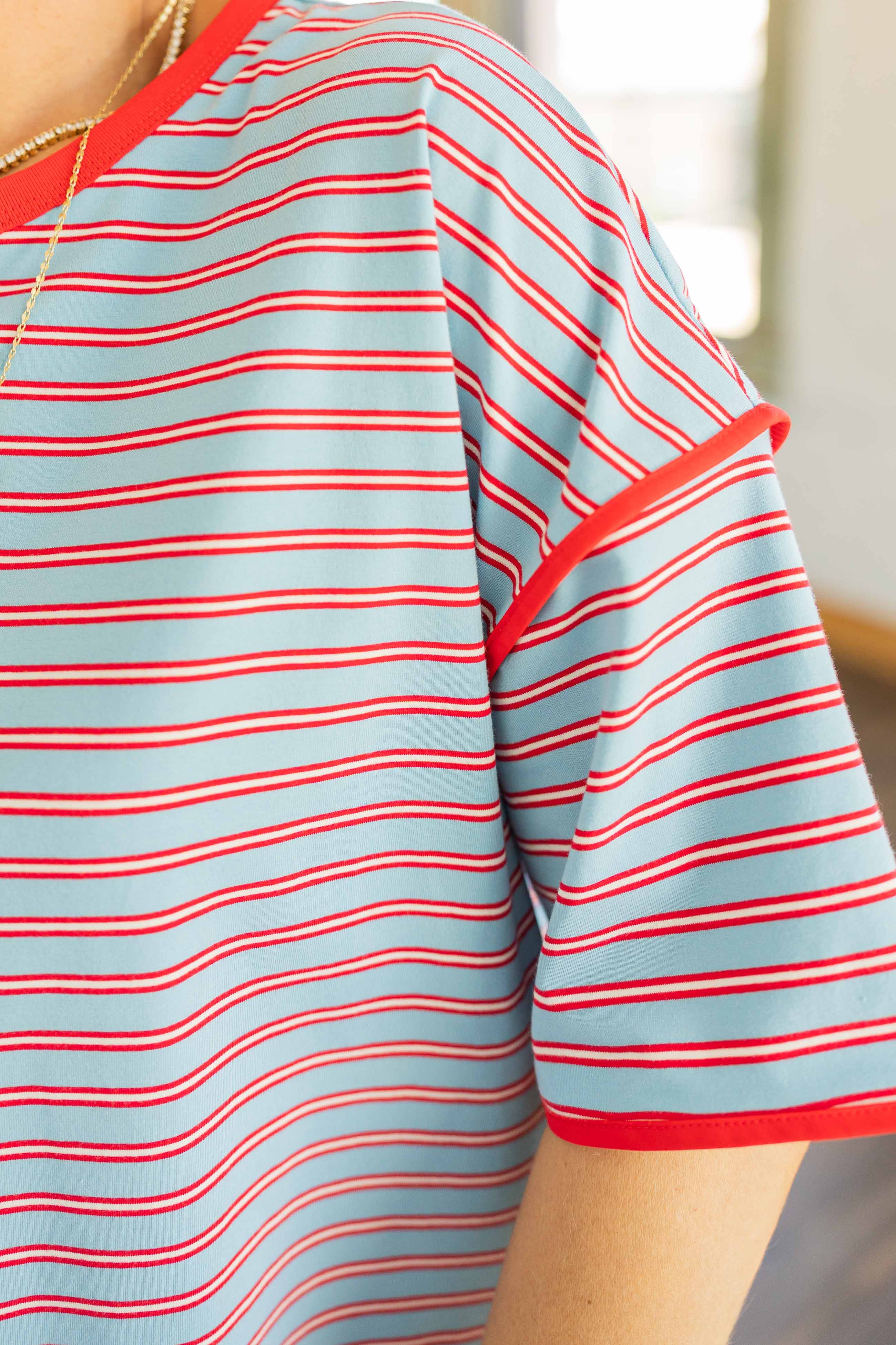 Easy, breezy, and ready for whatever your day turns into. This soft blue and white stripe with bold red trim gives you that classic Americana feel without being too on the nose. The boxy fit keeps it relaxed and comfortable, while the drop shoulder adds that laid back, effortless vibe. It is one of those tops you grab on a hot day and instantly feel put together. Pair it with denim, white shorts, or throw it on over a swimsuit. It just works every time.