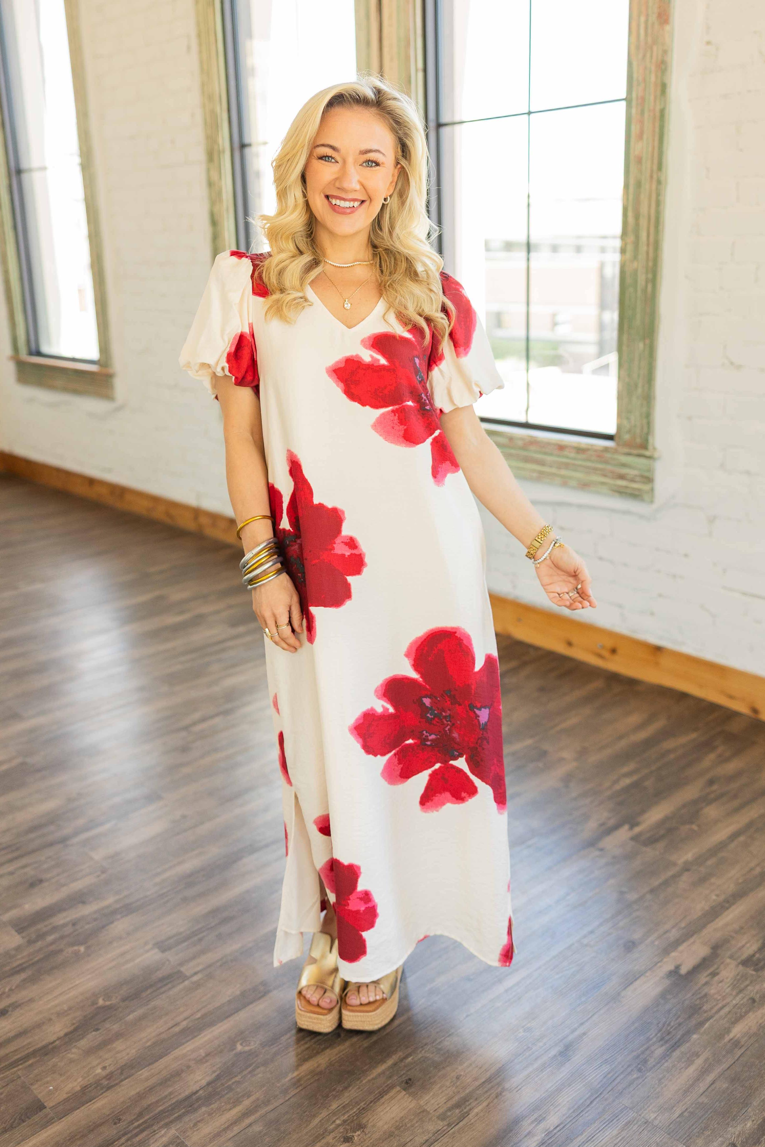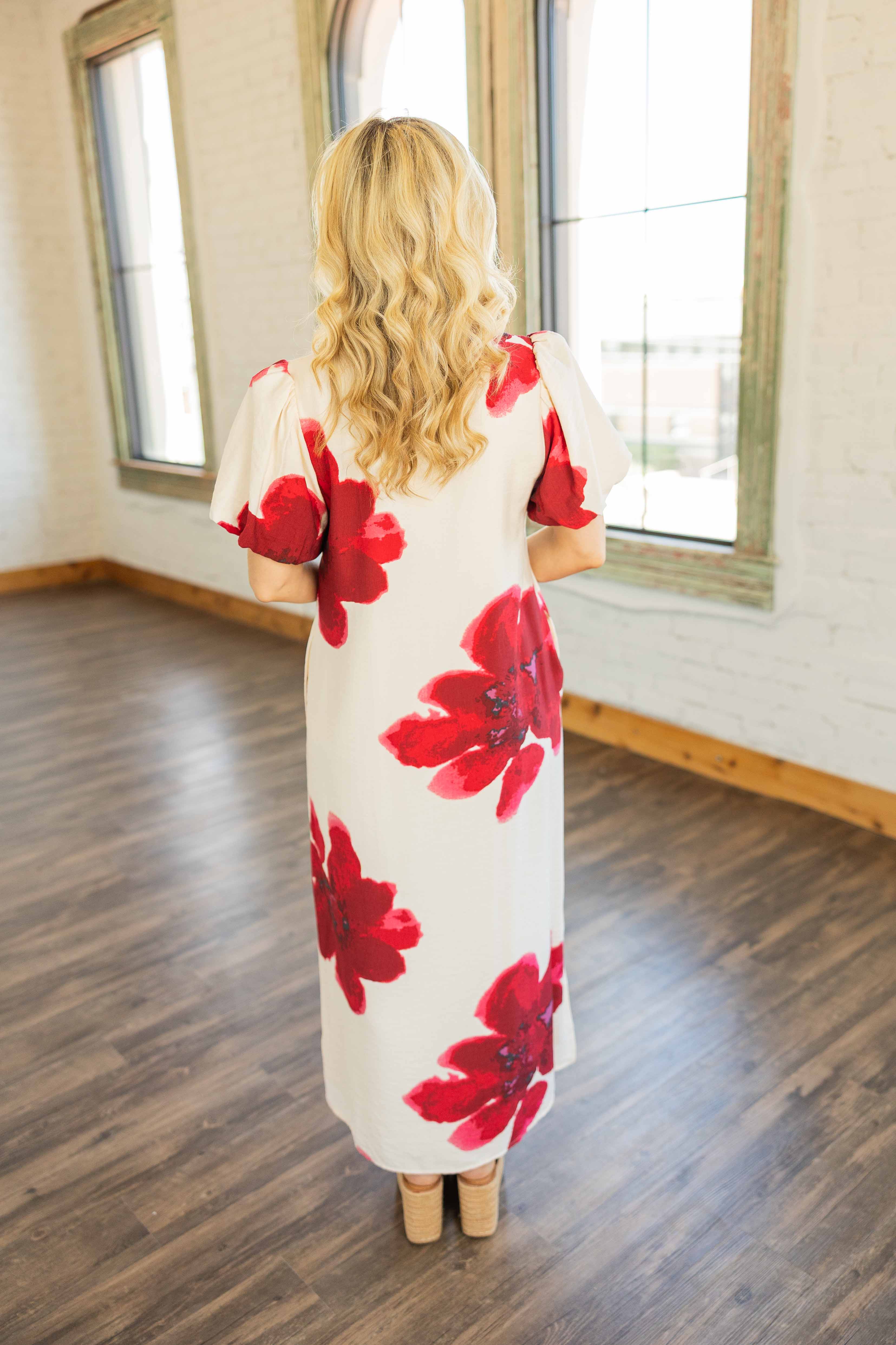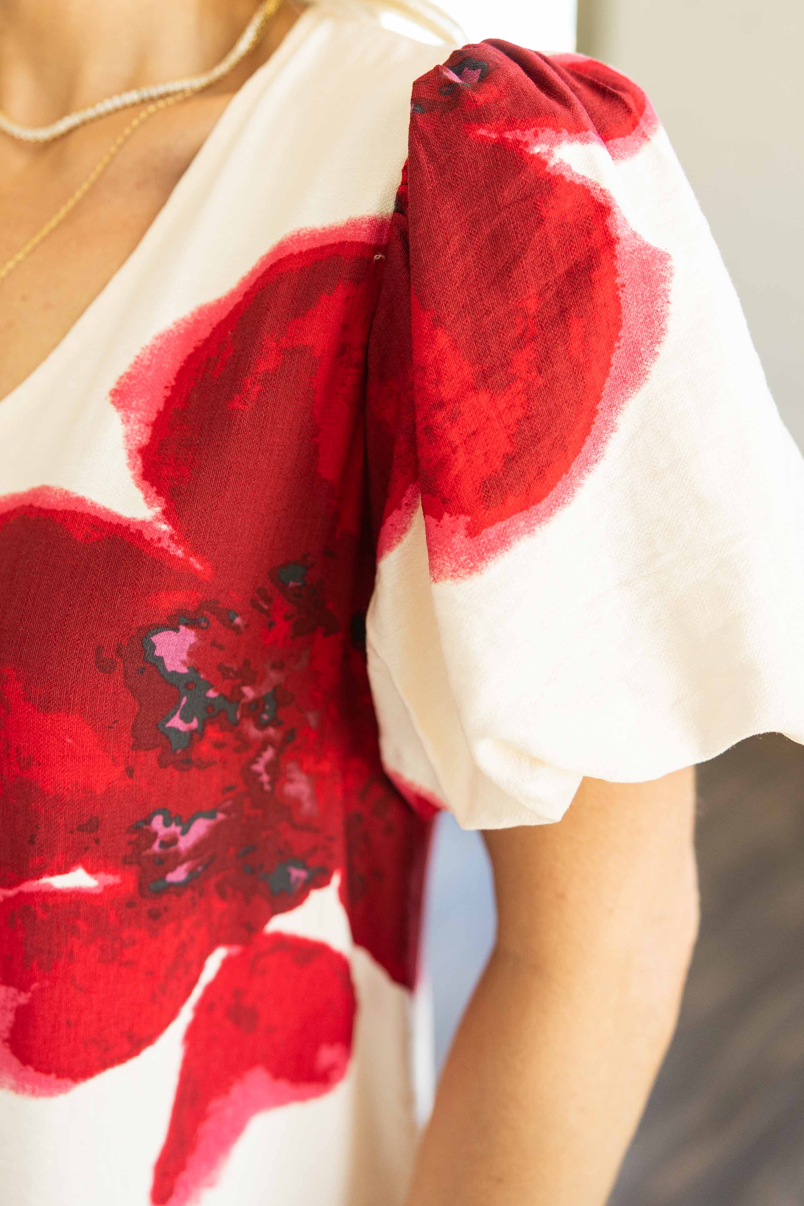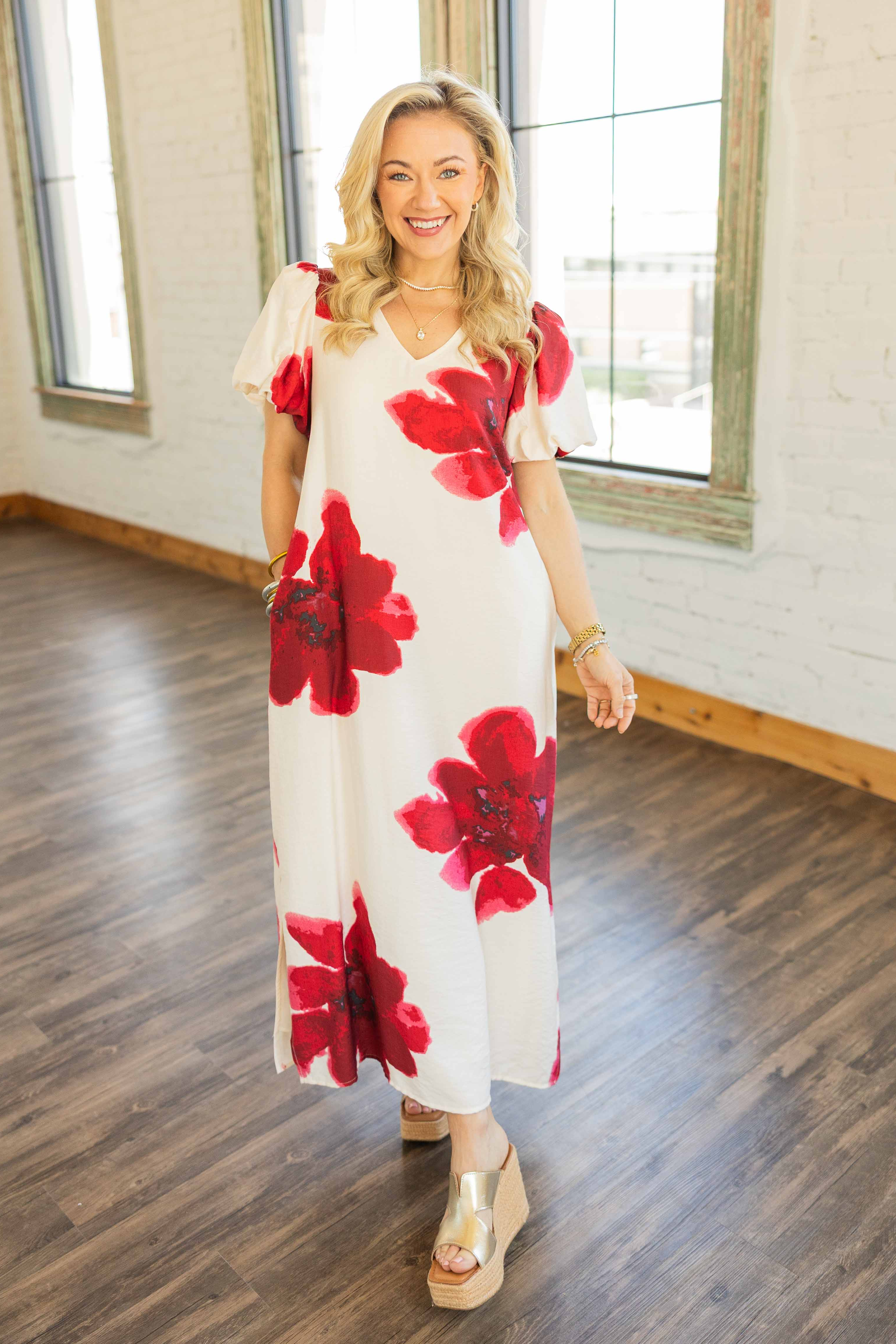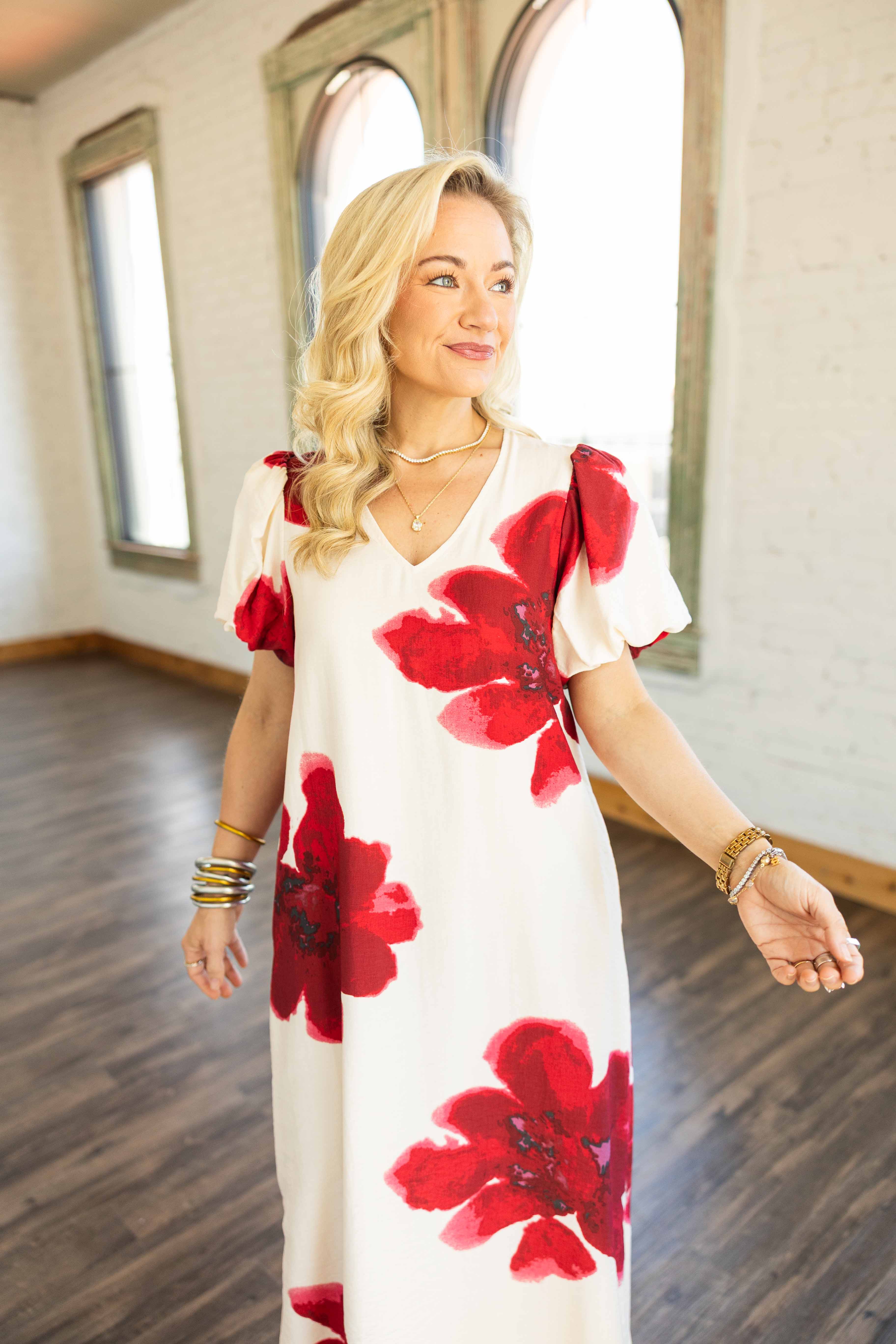 She is bold. She is effortless. She does not need accessories but she will take compliments. This soft ivory base with oversized red florals makes a statement the second you walk in. The relaxed fit keeps it easy and comfortable, while the puff sleeves add just enough shape to feel styled. And yes, she has pockets. We love a dress that works as hard as you do.