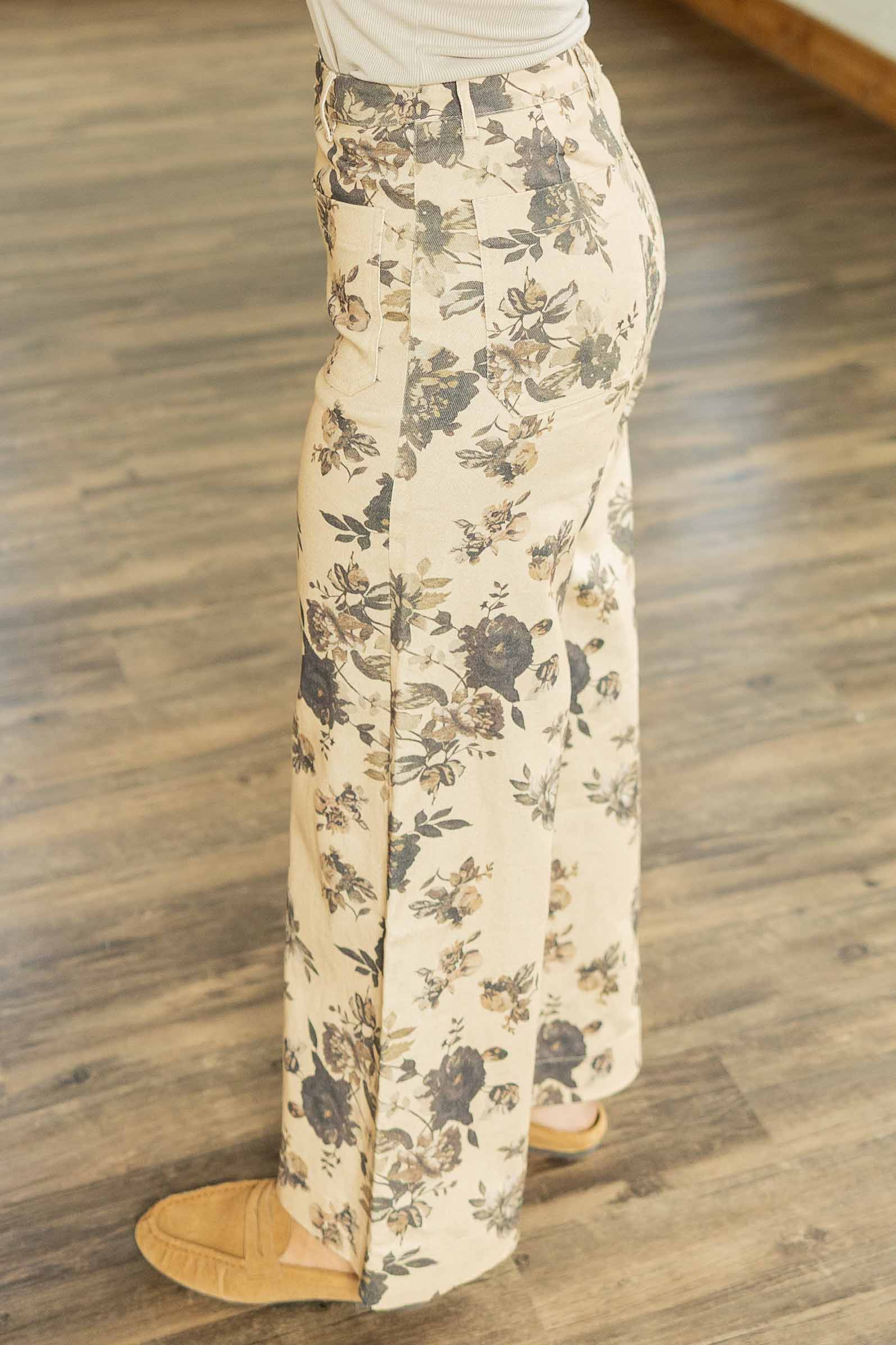 Effortlessly chic with a hint of vintage flair. The Alicia Floral Cropped Pants feature a neutral taupe base covered in muted charcoal floral prints that feel timeless and fall-ready. The wide-leg cropped silhouette and trouser hem give them a polished look, while the soft cotton-spandex blend keeps them comfy all day.