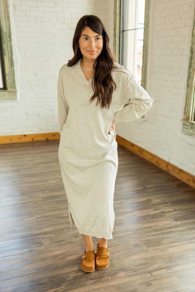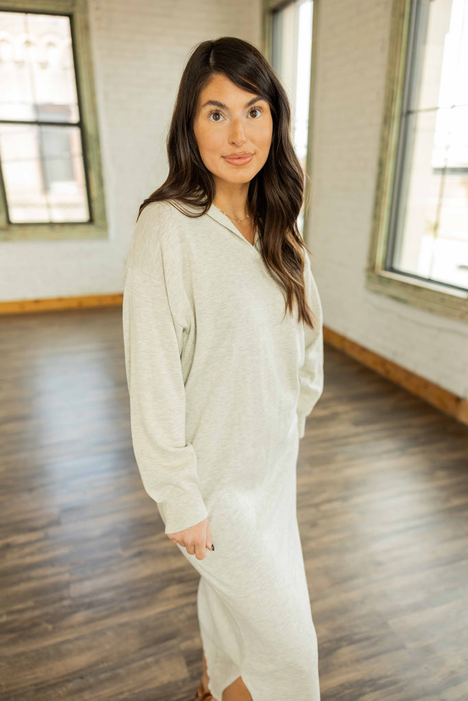 The Azari Dress is your cozy-girl essential. Made from 100% cotton with a heathered grey soft sweater knit, it drapes beautifully without clinging. The pullover style keeps it effortless, while the collared V-neckline gives it a little polish. Side slits add just enough movement, making it as practical as it is comfy.
