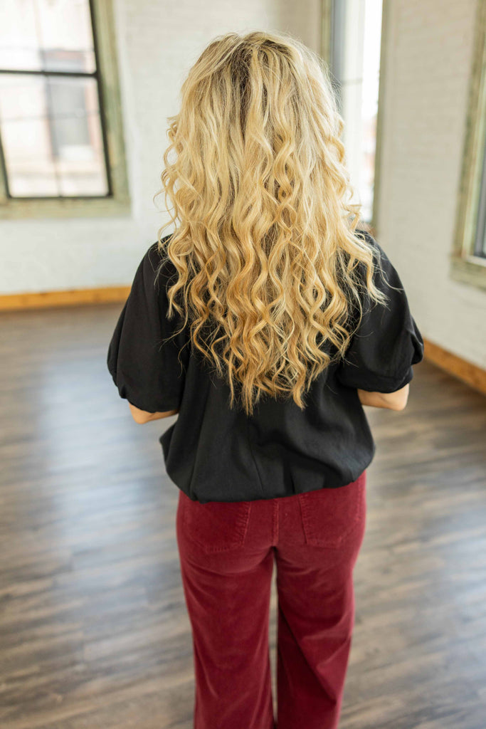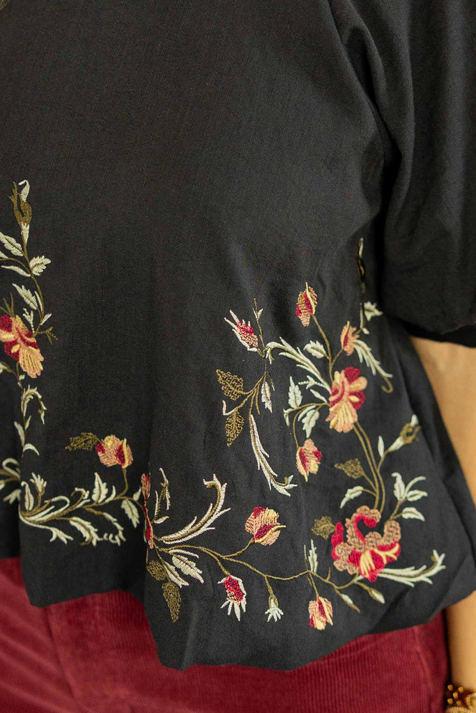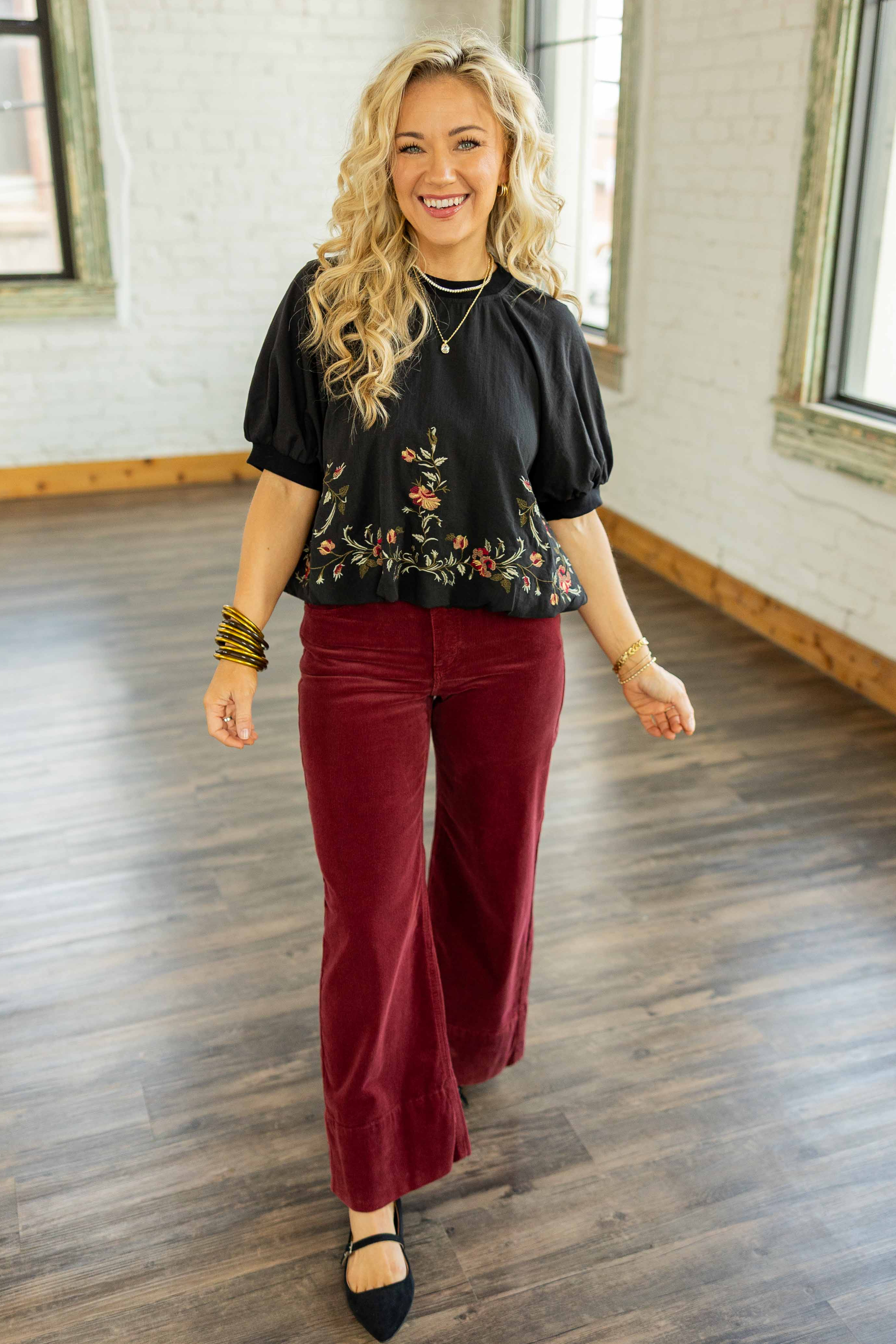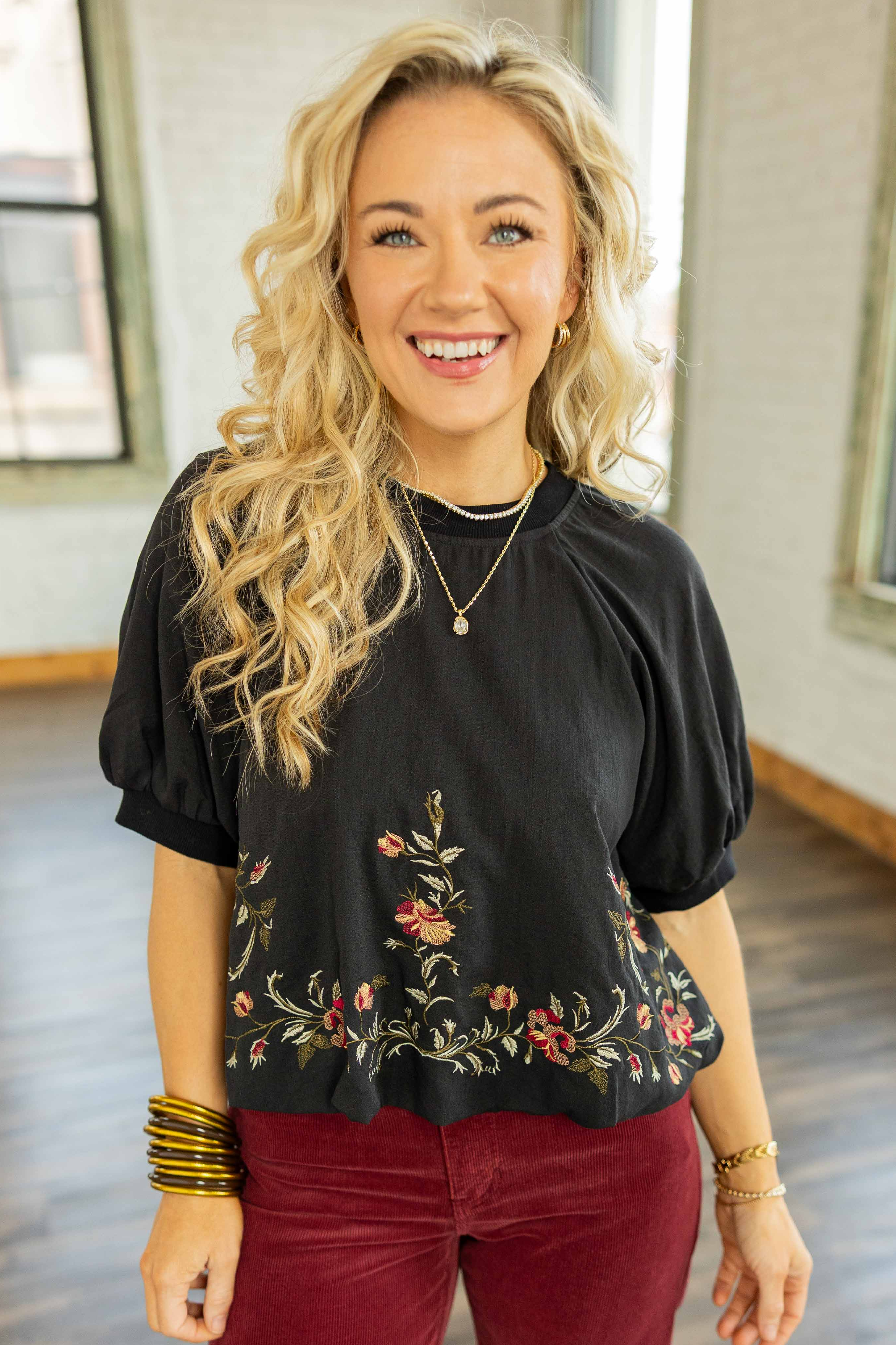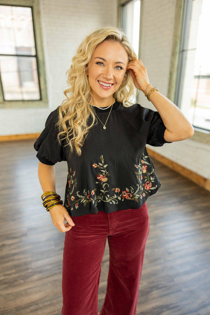 A little drama, a lot of detail. The Dayanna Top brings embroidered elegance to your fall rotation with its rich black base and intricate floral stitching in warm tones of red, gold, and green. The bubble hem gives it a soft, flattering shape while the short puff sleeves keep it playful. It’s the perfect mix of feminine and polished—no effort required.