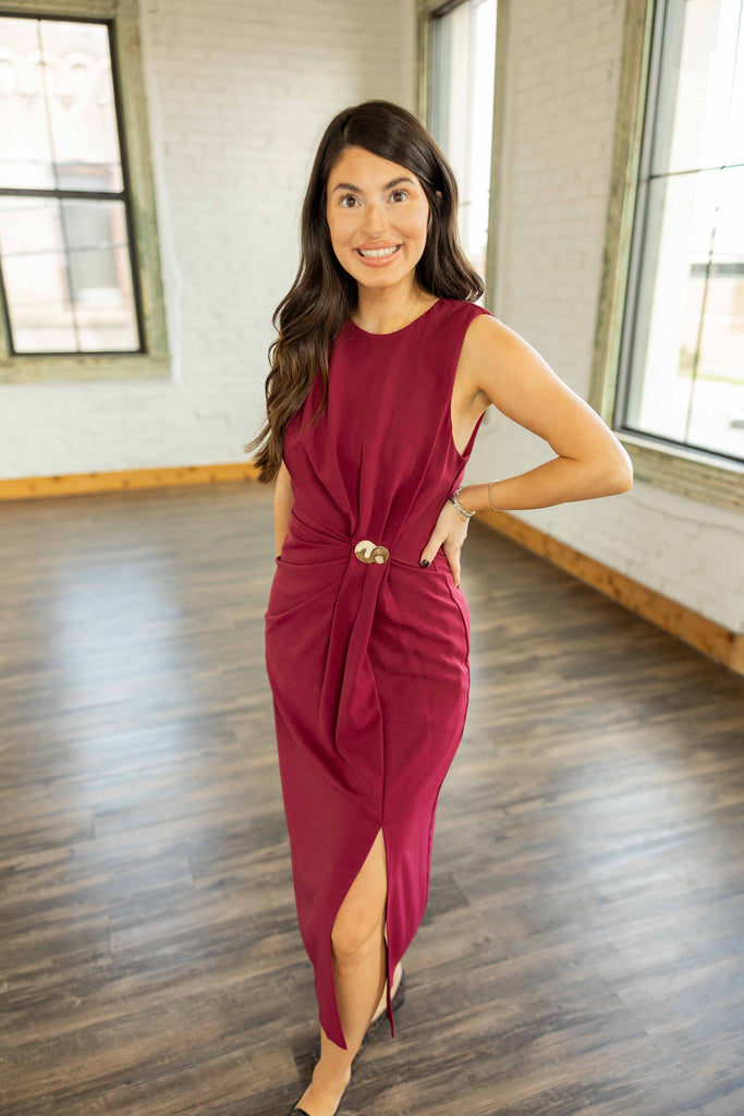 The Soraya Dress is sleek, simple, and ready to turn heads. This sleeveless maroon midi features a gathered waist with a gold accent that flatters your shape and adds just the right amount of polish. The side slit keeps it effortlessly chic while the silky fabric gives it an elevated feel without sacrificing comfort.