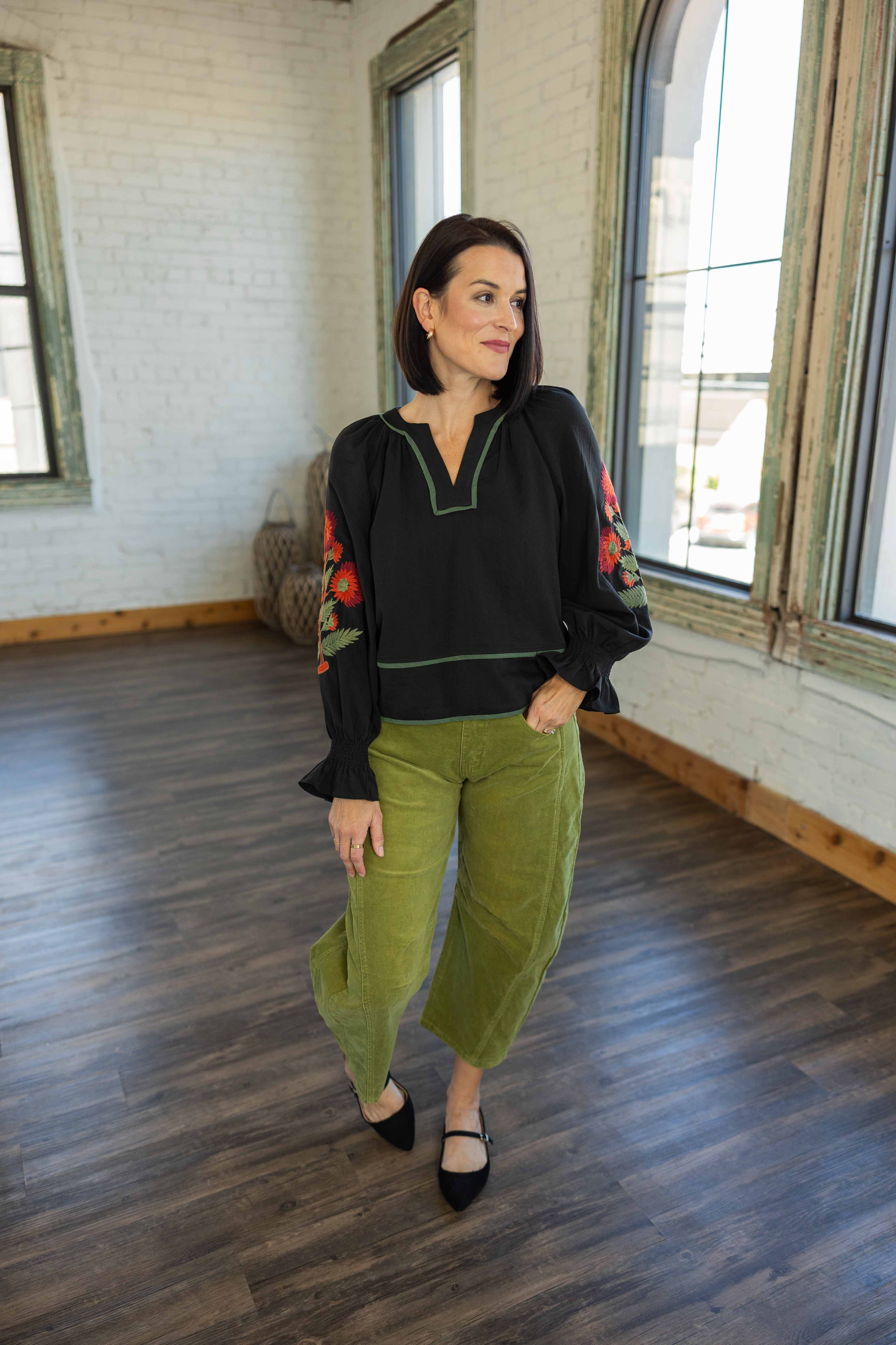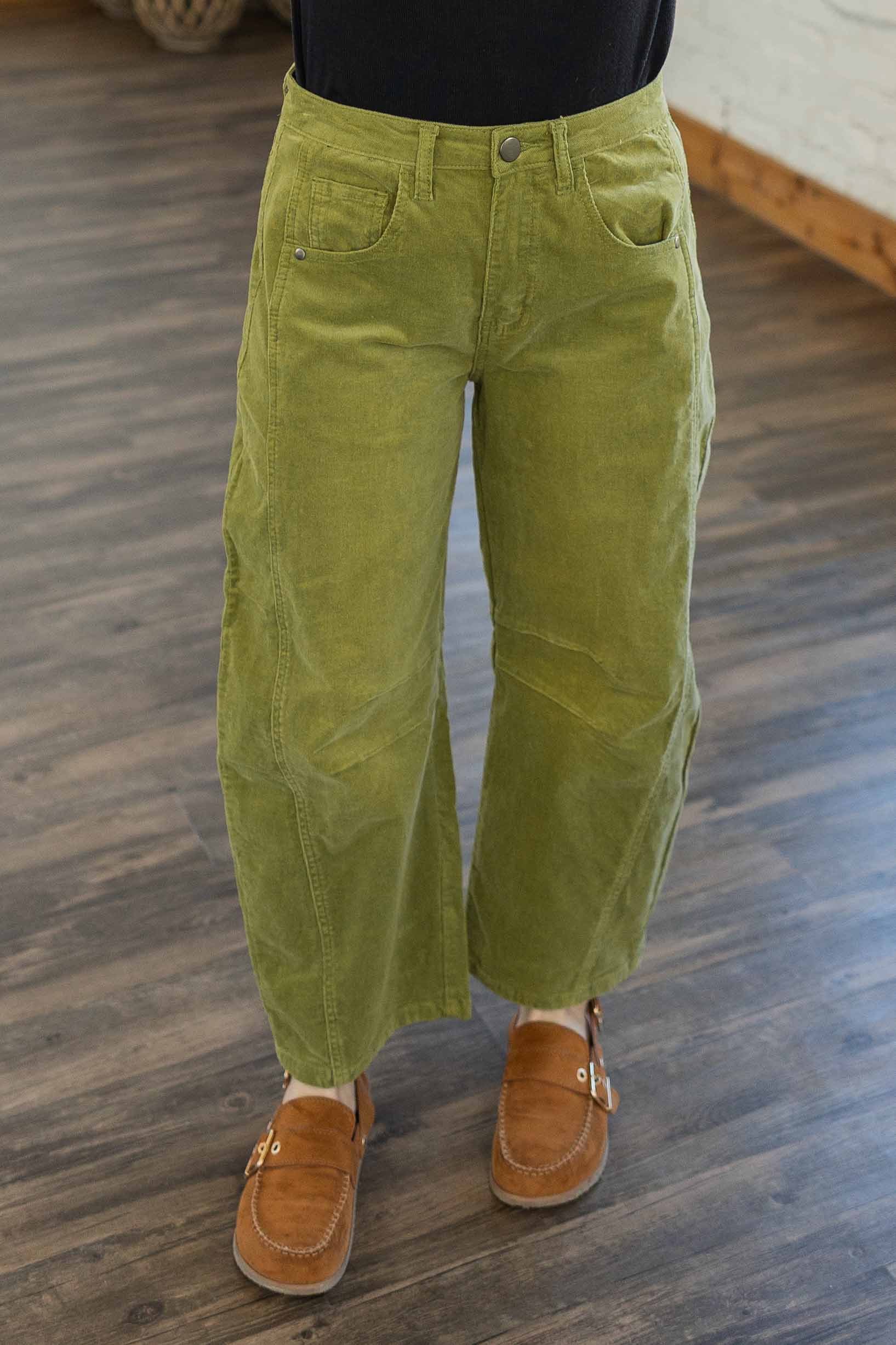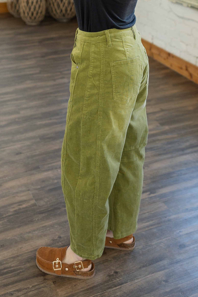 The Alison Stretch Corduroy Barrel Pants are fun, flattering, and full of personality. The bold olive green color makes a statement while still pairing easily with fall neutrals and cozy knits. The soft corduroy fabric and modern barrel leg shape give a comfy yet polished look that works for any casual day out.