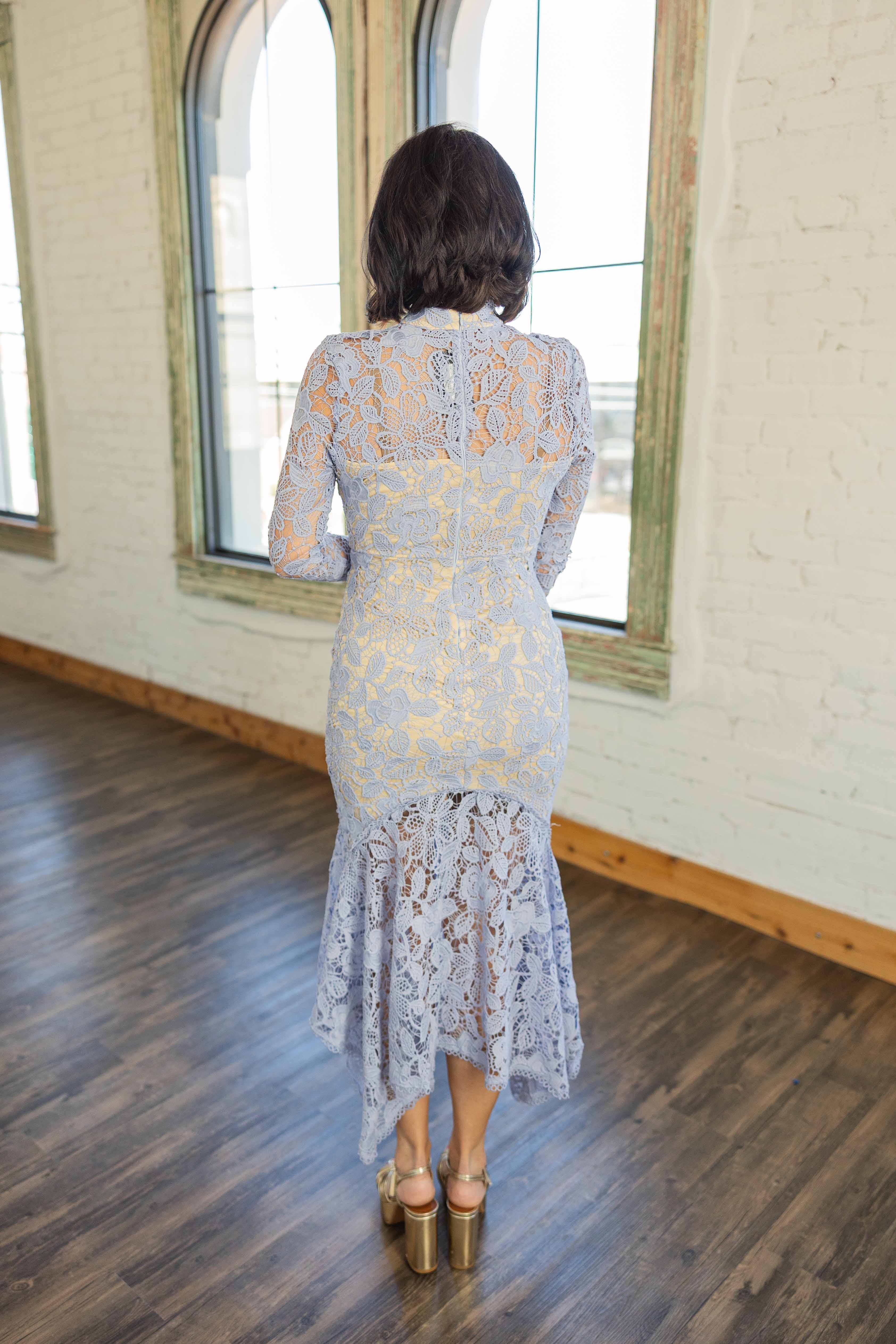 This one is elegant with a little drama. The lace overlay brings texture and romance, while the fitted silhouette keeps everything sleek. The soft dusty blue color feels timeless and photographs beautifully. The mermaid hem adds movement without being fussy, and the lining keeps you covered where it counts. Heads will turn. In a good way.
