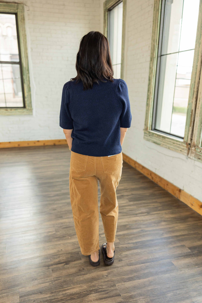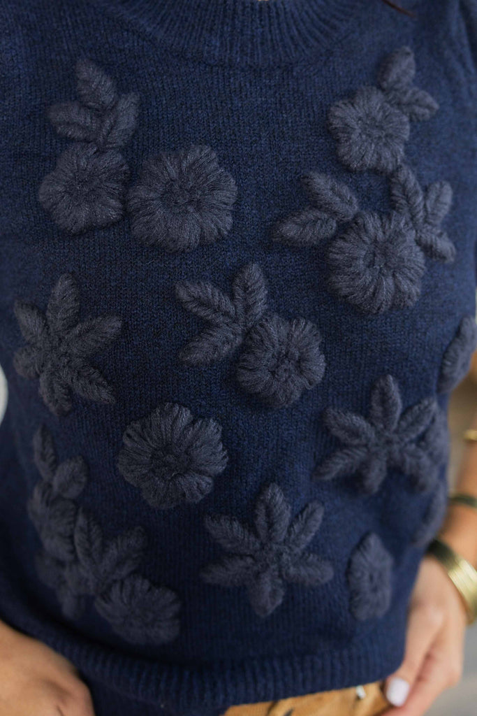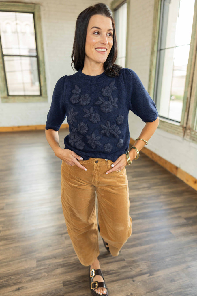 The Amber top brings cozy texture and fall charm together in one perfect piece. The deep navy knit feels rich and timeless, while the raised floral appliqué adds a touch of softness that makes it feel a little dressy without trying too hard. The short puff sleeves and slightly fitted shape give it that flattering, feminine look that pairs just as easily with corduroy, denim, or your favorite fall skirt.
