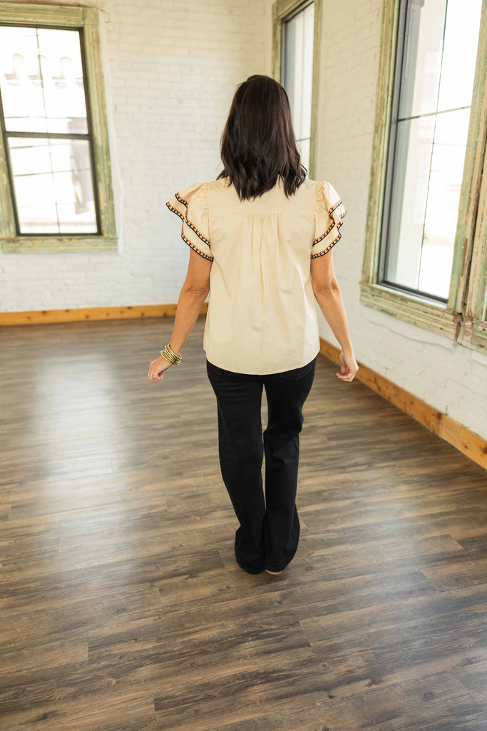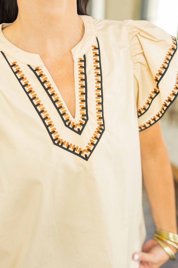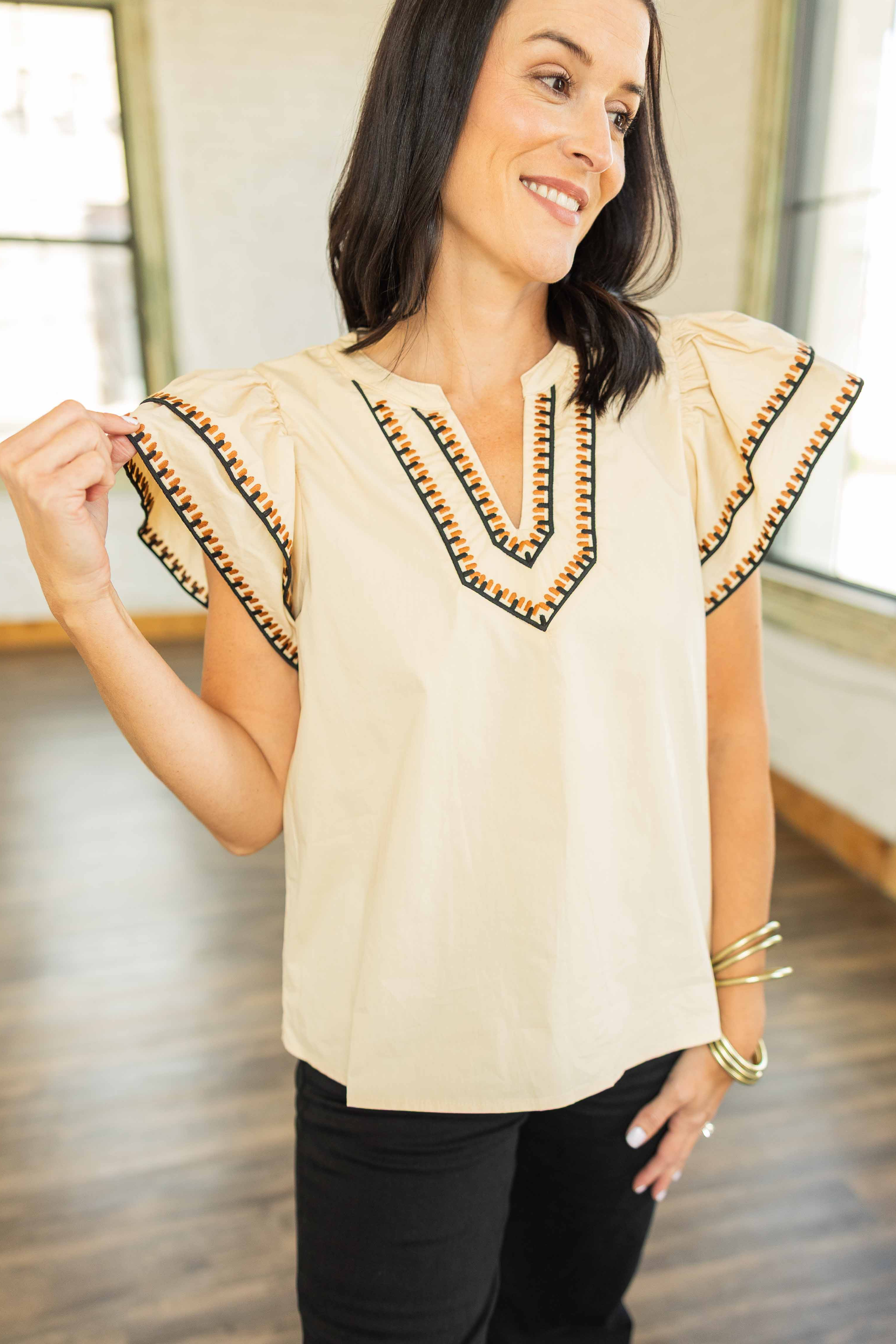 The Amirah top brings a little flair to your everyday style with its layered flutter sleeves and bold stitched details. The soft cream color gives it that easy, neutral vibe, while the contrast embroidery in black and copper adds just the right amount of punch. Made from 100% cotton, it’s lightweight, breathable, and the perfect mix of sweet and statement.