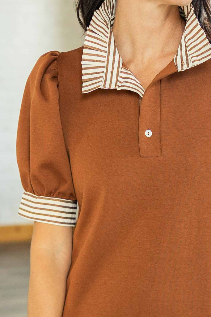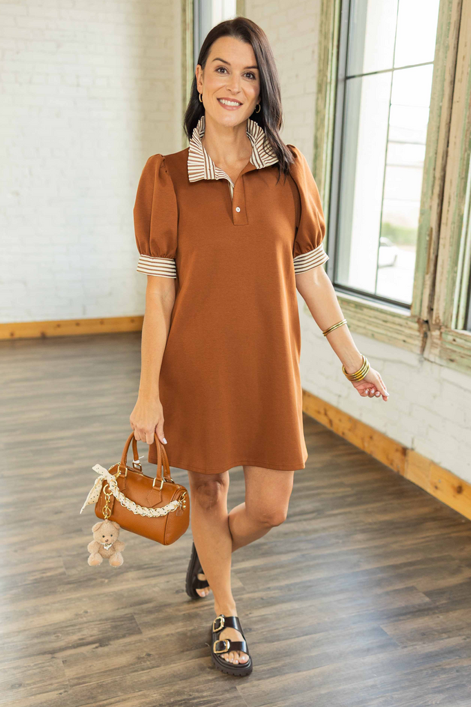 Preppy meets playful in the Elisa Dress. This mini features a warm chestnut brown body with a contrasting striped ruffle collar and sleeve cuffs in tan and cream. The relaxed pullover fit makes it easy to toss on and go, while the puff sleeves and soft knit fabric give it just the right touch of polish. Oh, and yes, it has pockets.