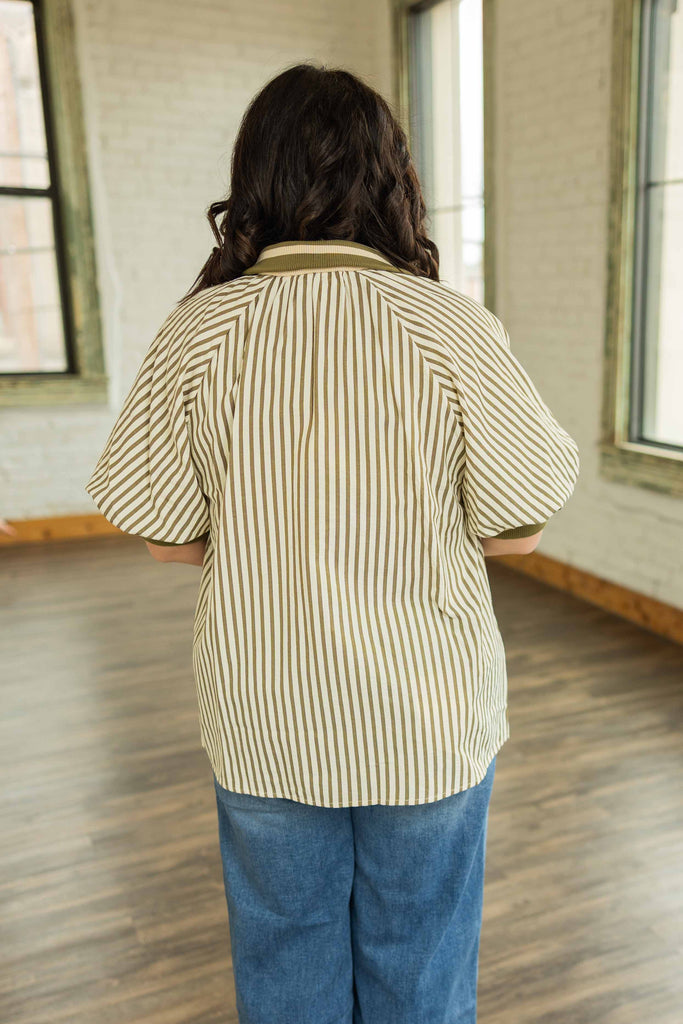 The Elowyn Plus top is a cozy fall staple with a sporty twist. Its cream base and olive green stripes bring that crisp autumn vibe without feeling heavy, perfect for those warm Texas days that just pretend to be fall. The quarter zip neckline and contrast trim give it a casual, laid-back feel, while the elastic hem keeps the fit polished and easy to style. Lightweight, comfy, and full of personality—this one’s ready for pumpkin spice season and tailgate weekends.