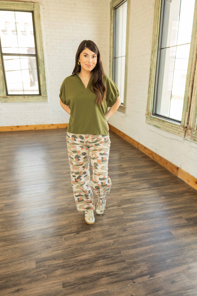 Camo just got a fall refresh. The Fancy Camo Pants feature a relaxed, wide-leg silhouette in a washed twill fabric that gives that soft, lived-in feel right out of the gate. The muted green, beige, and clay orange tones make them perfect for the season—bold enough to stand out, neutral enough to wear on repeat. Finished with a raw cropped hem and side pockets for an effortless, laid-back vibe.
