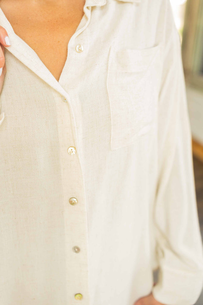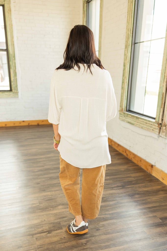 The Isabel top is that effortless fall essential you’ll wear on repeat. The soft linen-blend fabric in a natural ivory heathered tone gives cozy, elevated neutral vibes—perfect for pairing with everything from denim to cords. Its oversized fit and high-low hem make it easy to half-tuck, layer, or lounge in, depending on the day. Lightweight but never sheer, it’s the button-down that does it all.