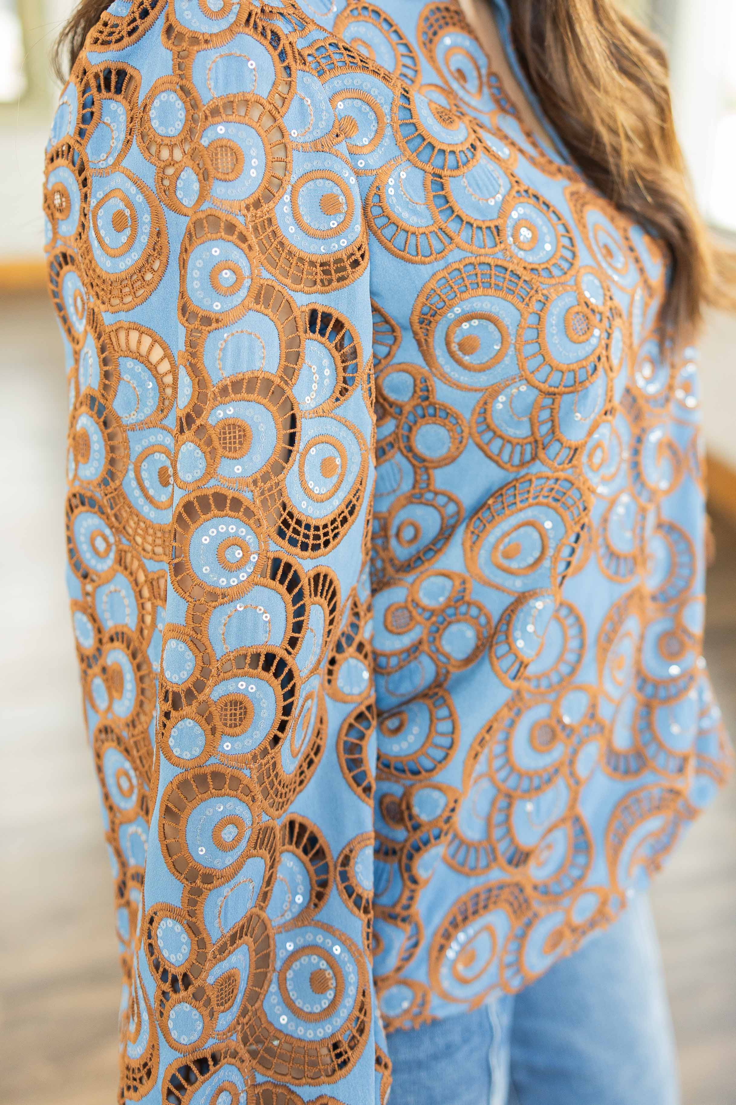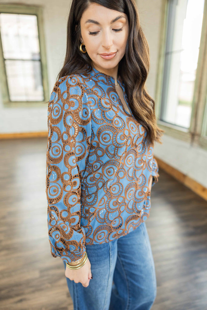The Laura top is fall sparkle done tastefully. The mix of warm copper embroidery and soft blue makes it a standout piece for the season—earthy yet elegant. The intricate circular embroidery is accented with subtle sequins that catch the light just right, adding a little glam to your fall lineup. With sheer sleeves, a lined bodice, and an easy pullover V-neck fit, this one moves seamlessly from daytime to dinner out.