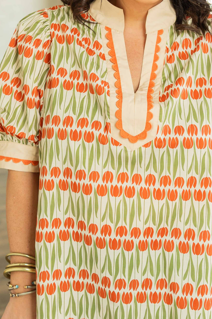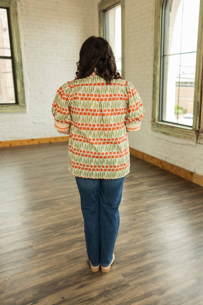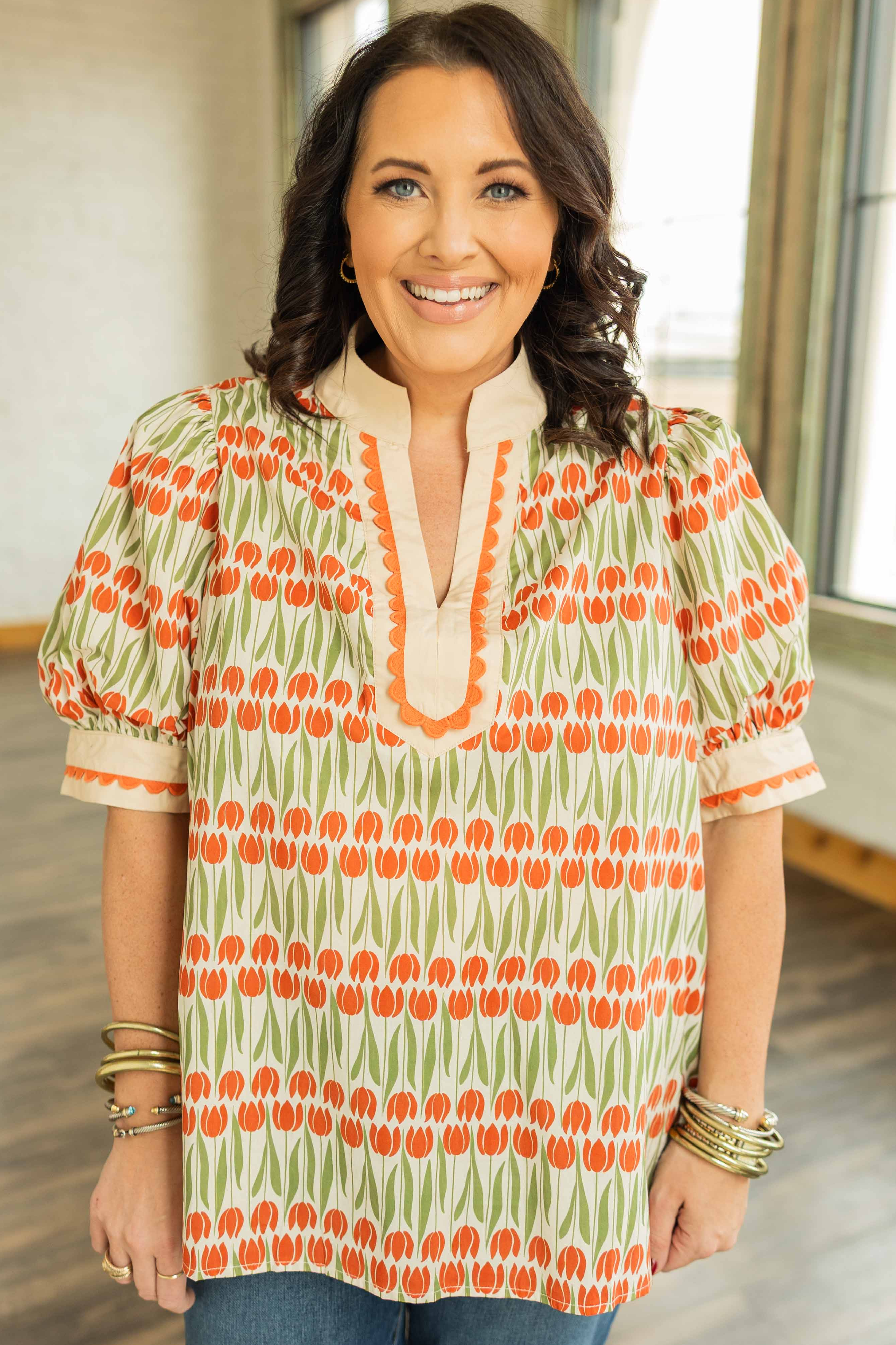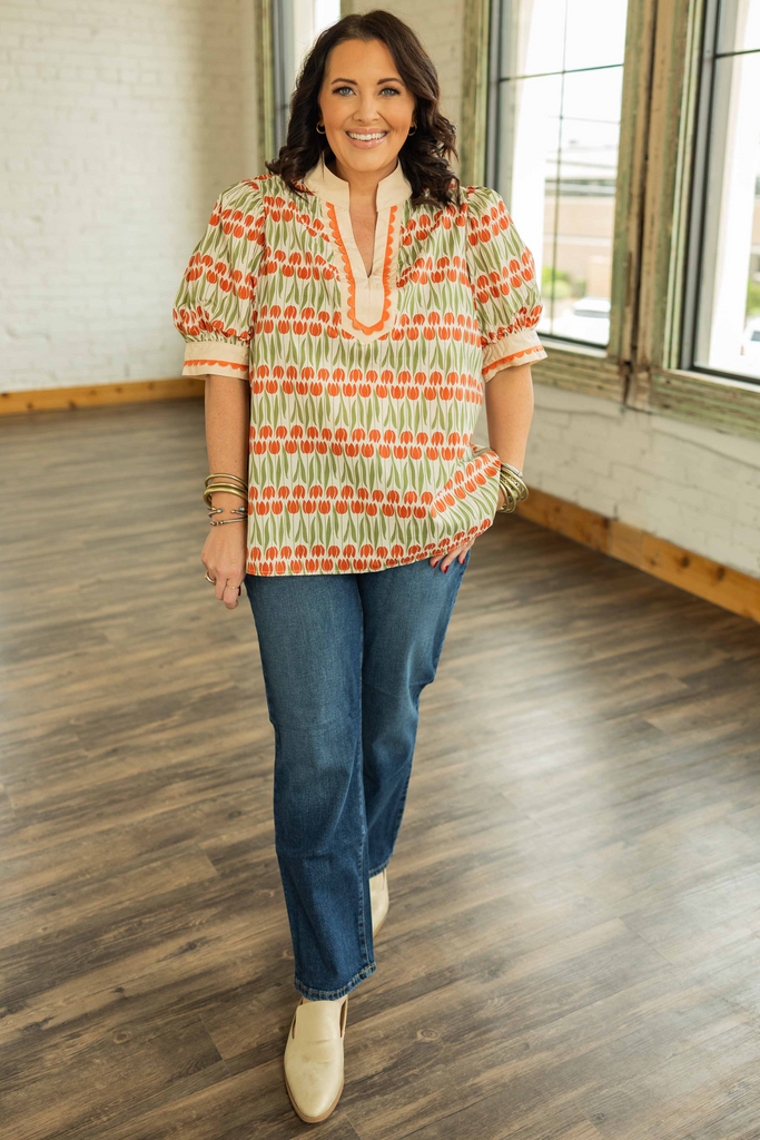 The Luisa Plus top is serving fall color in the best way. With its soft cream base and warm shades of pumpkin orange and olive green, it’s giving cozy-but-cool energy that transitions perfectly into the season. The scalloped trim and caftan neckline keep things playful, while the puff sleeves and relaxed fit make it an easy favorite for layering under cardigans or pairing with denim.