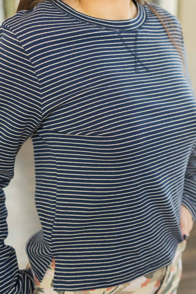 Classic, comfy, and made for fall layering, the Quinn top is a closet essential you’ll reach for all season. The navy and ivory stripes give that timeless, cozy feel while the soft cotton blend adds just enough stretch to keep things easy. The long sleeves and side slits make it perfect for pairing with vests, shackets, or denim on cooler mornings that turn into warm afternoons—Texas-style.