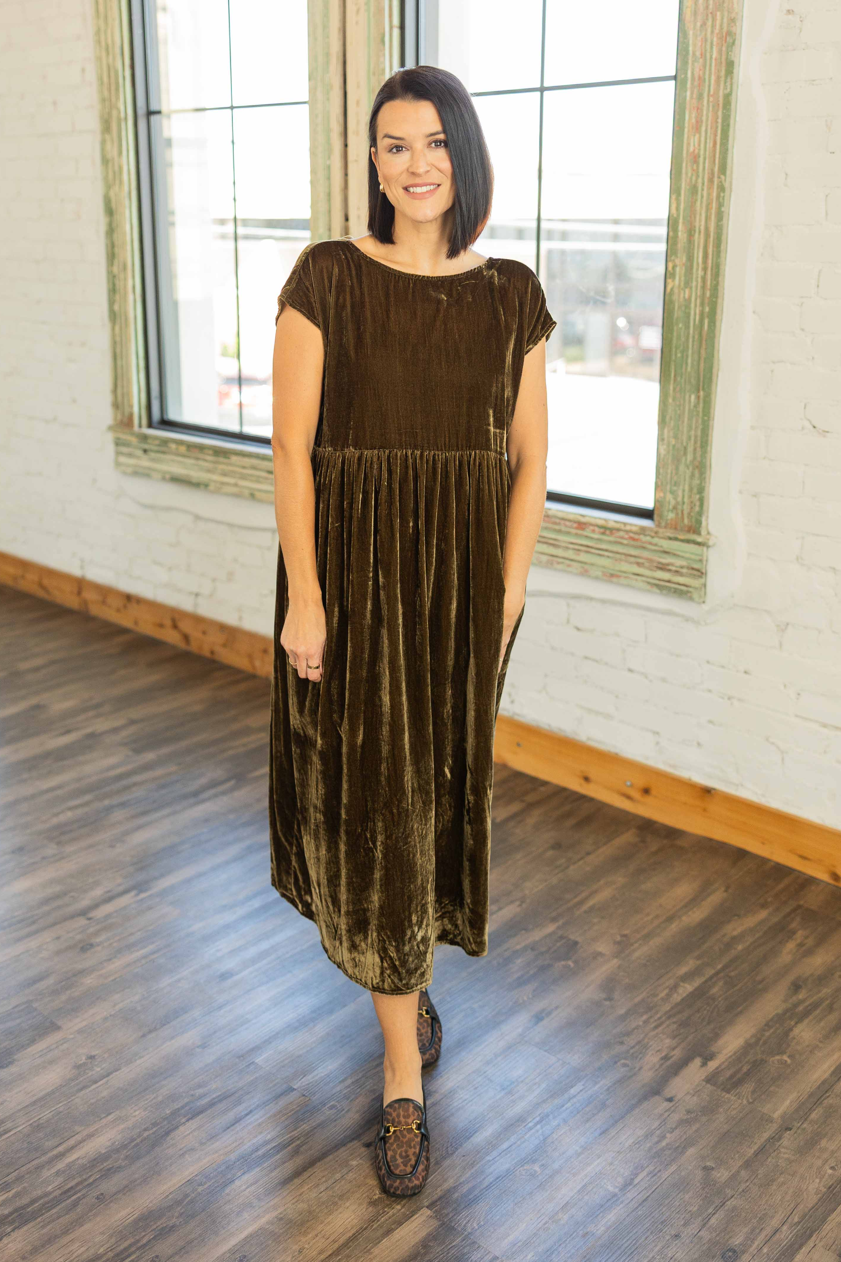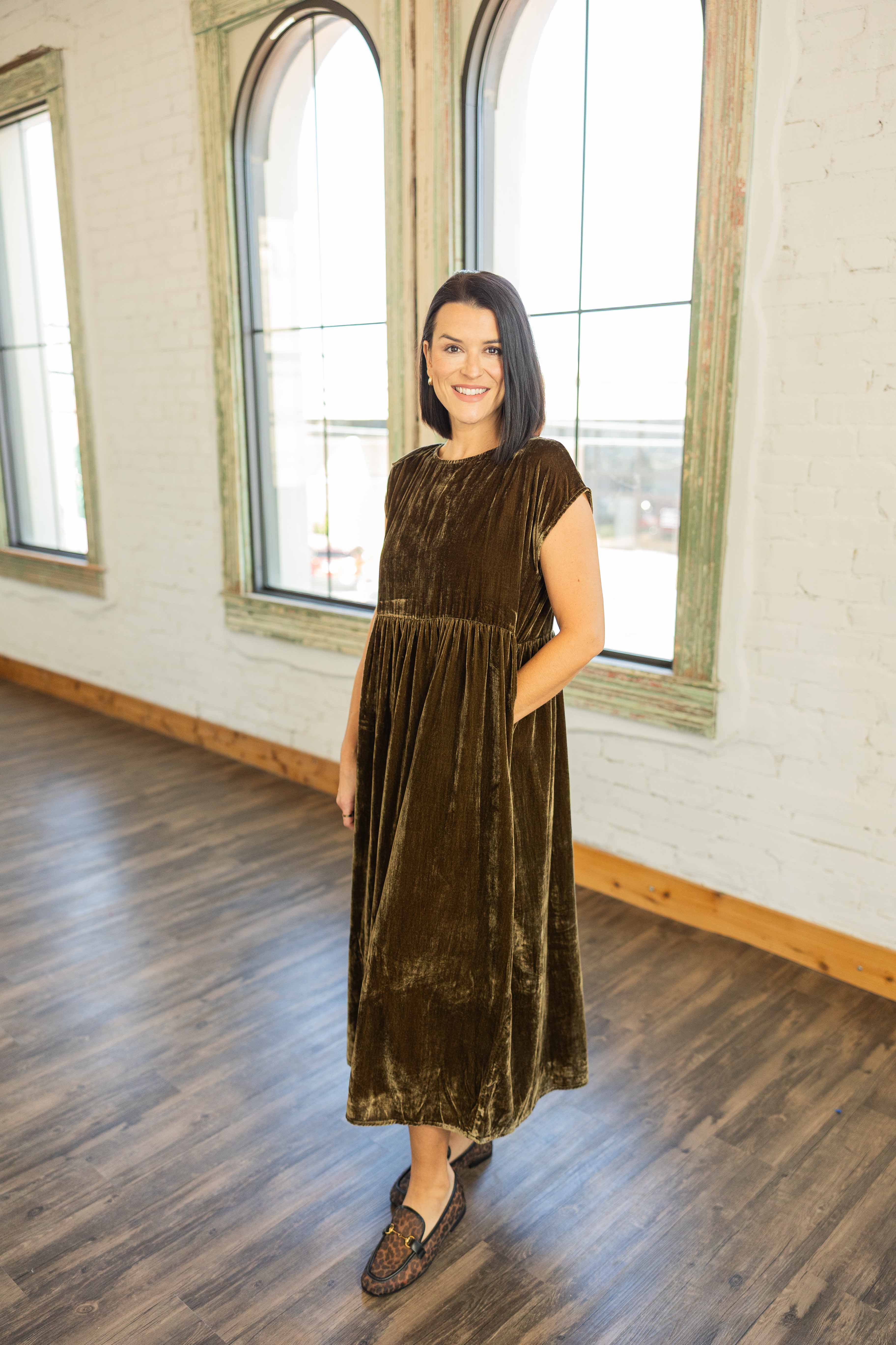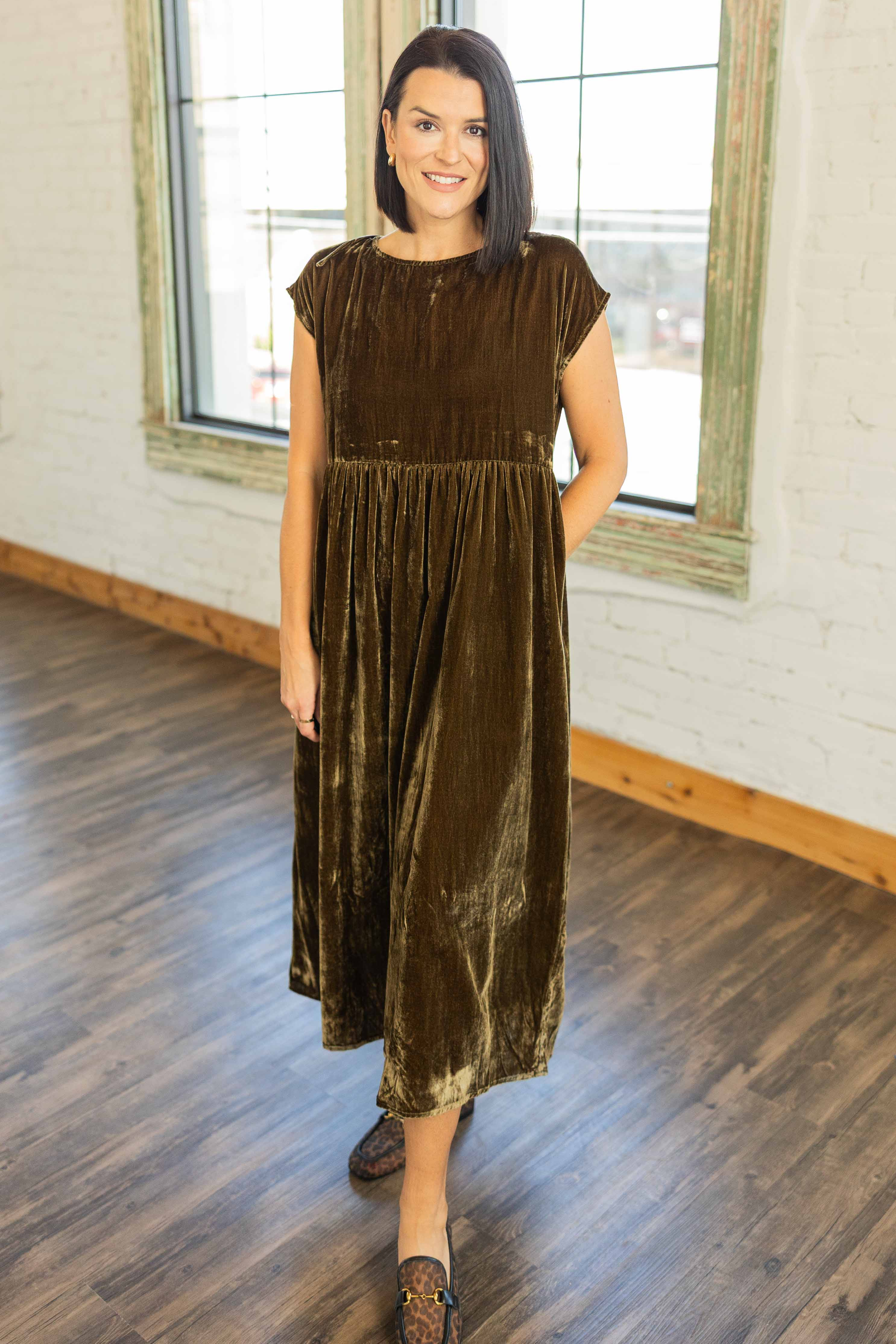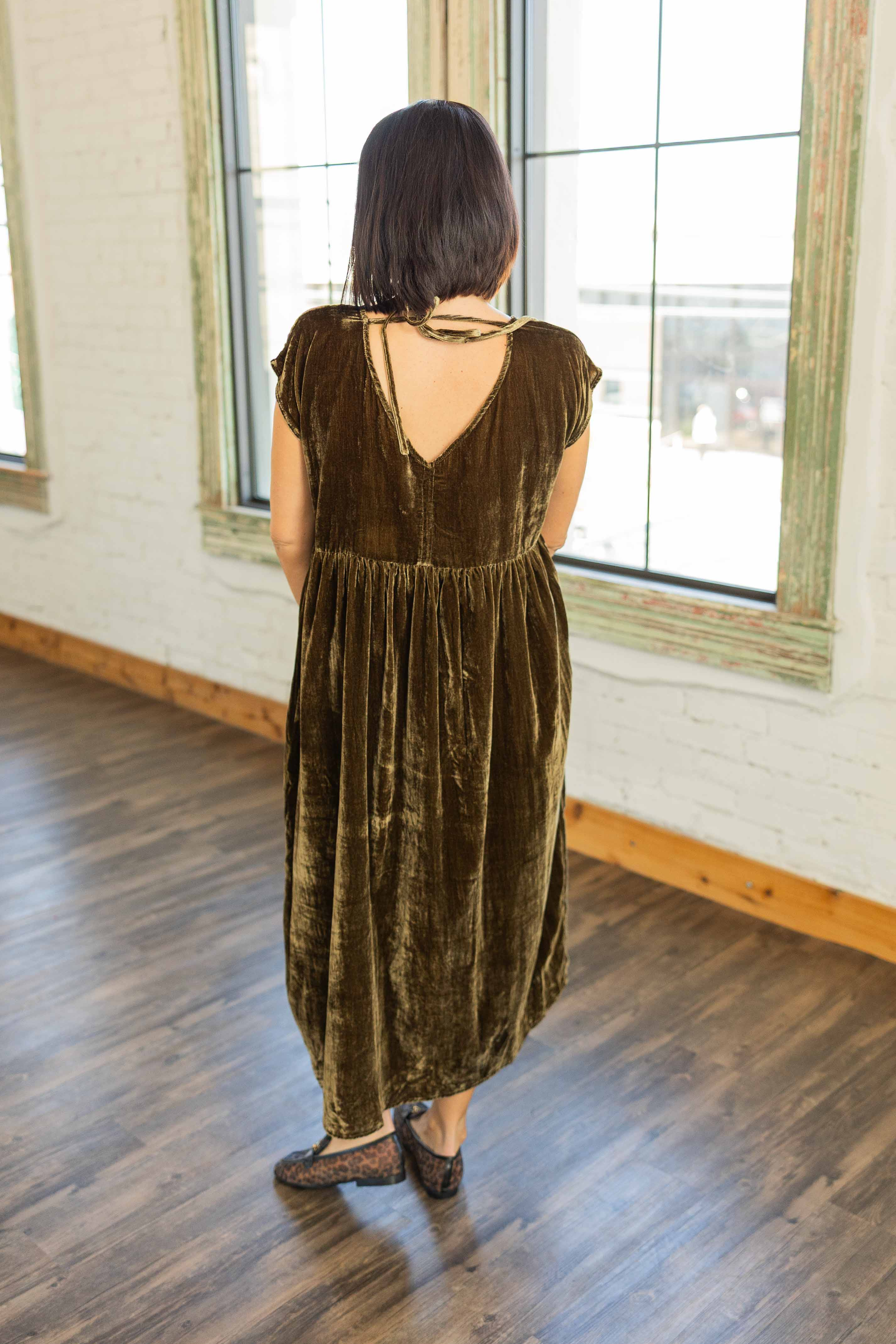 This crinkled velvet beauty is luxe, relaxed, and totally wearable. The rich olive tone feels festive and the intentionally oversized shape gives it that cool effortless vibe. Cap sleeves, pockets, and a self tie back give it a feminine finish. Floaty, comfortable, and perfect with flats or boots, she is holiday magic with zero fuss.