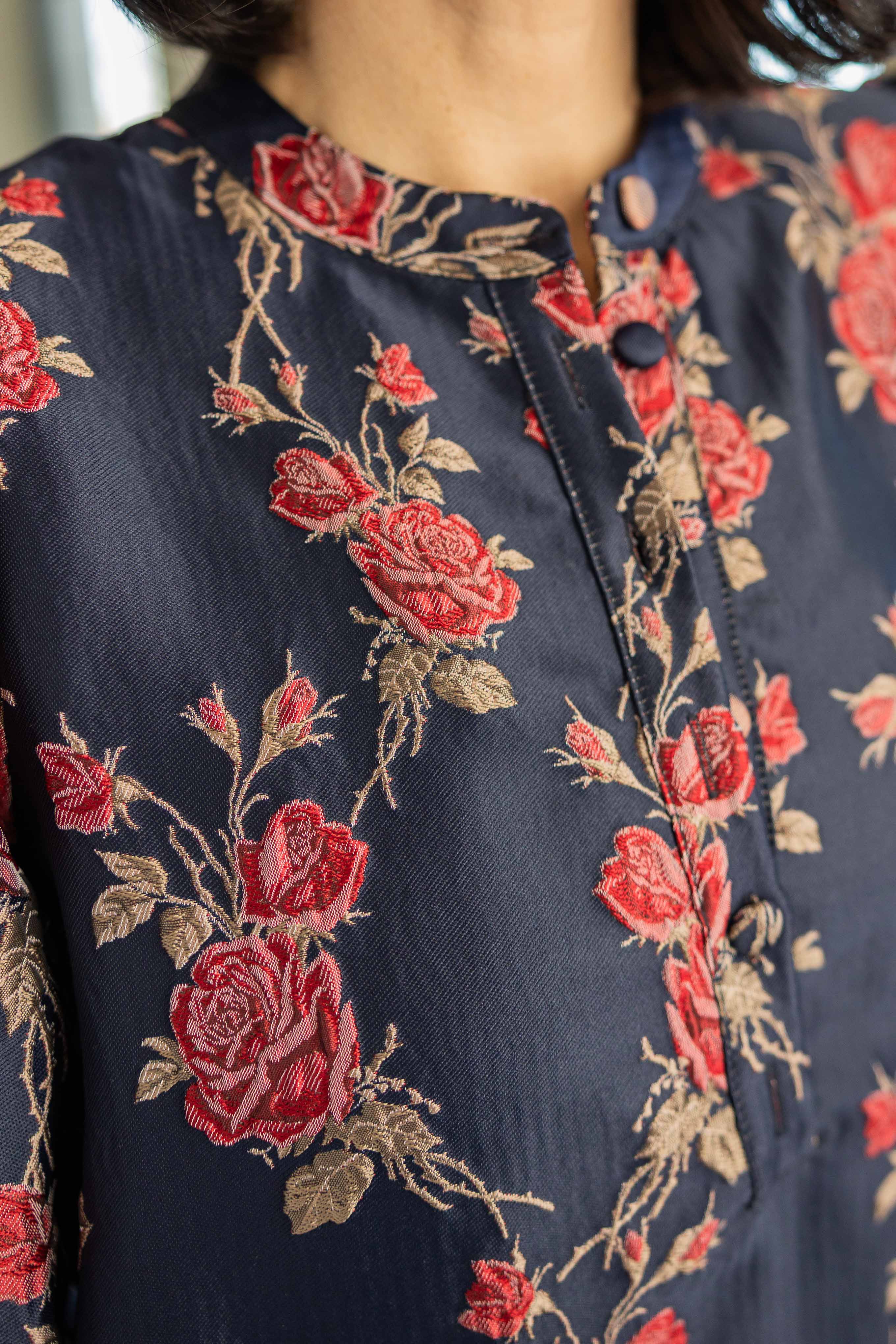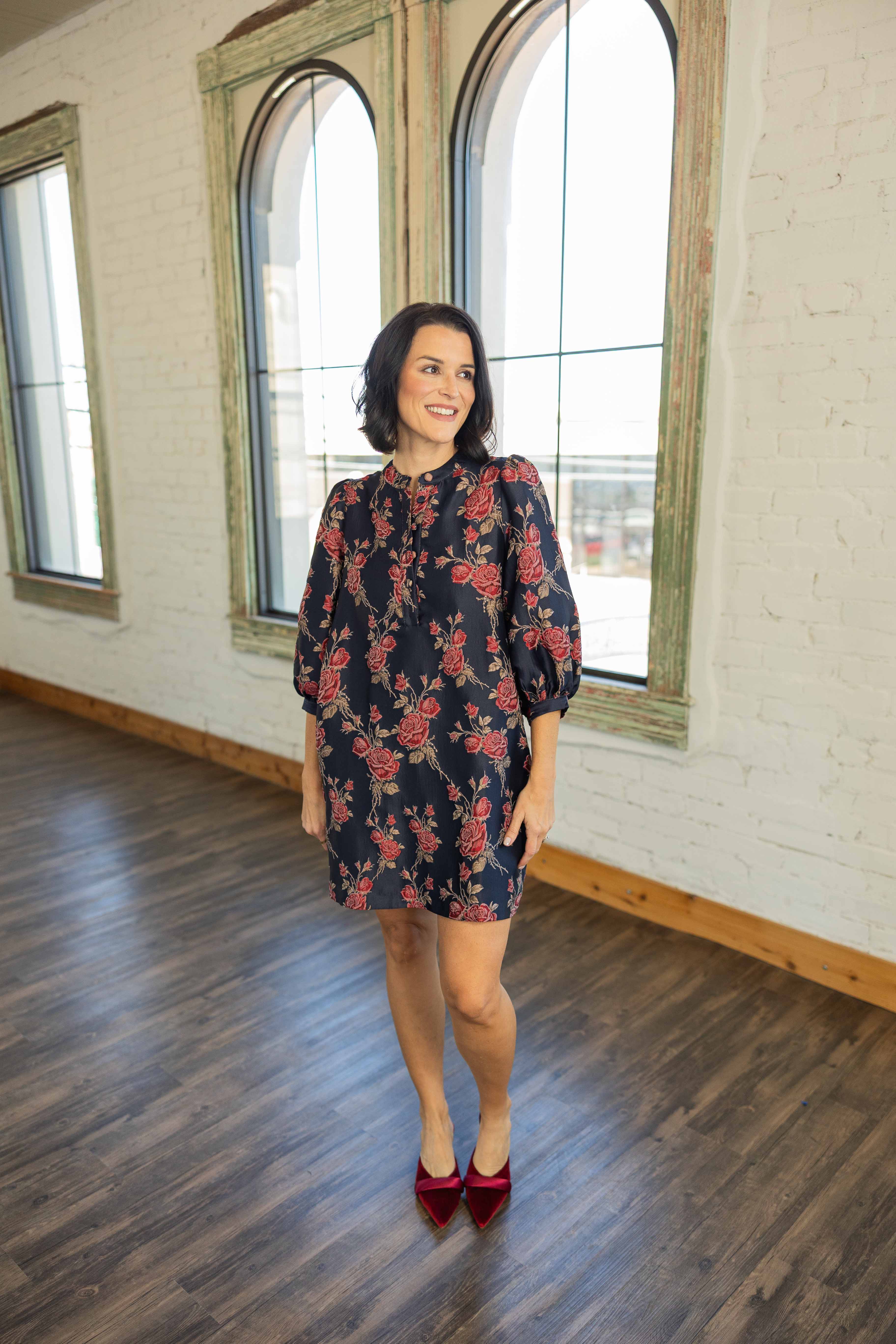 Easy. Breezy. Pretty without trying. This mini dress is lightweight and flowy with a soft woven feel that moves with you. The deep navy base paired with rich red florals makes it feel classic but still fun. The relaxed shape keeps it comfortable, and the long sleeves balance the shorter length perfectly. Plus, pockets. Always a yes.