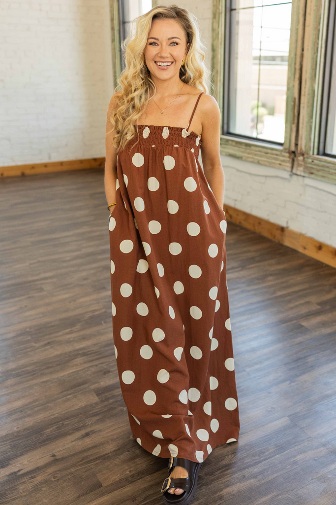 When you want to feel like you're floating through life (even if you're lowkey spiraling), the Lilyana Maxi Dress is here for you. This flowy maxi moment features a bold polka dot print, adjustable straps, and—wait for it—POCKETS. Because looking adorable shouldn't mean sacrificing space for snacks or lip gloss.