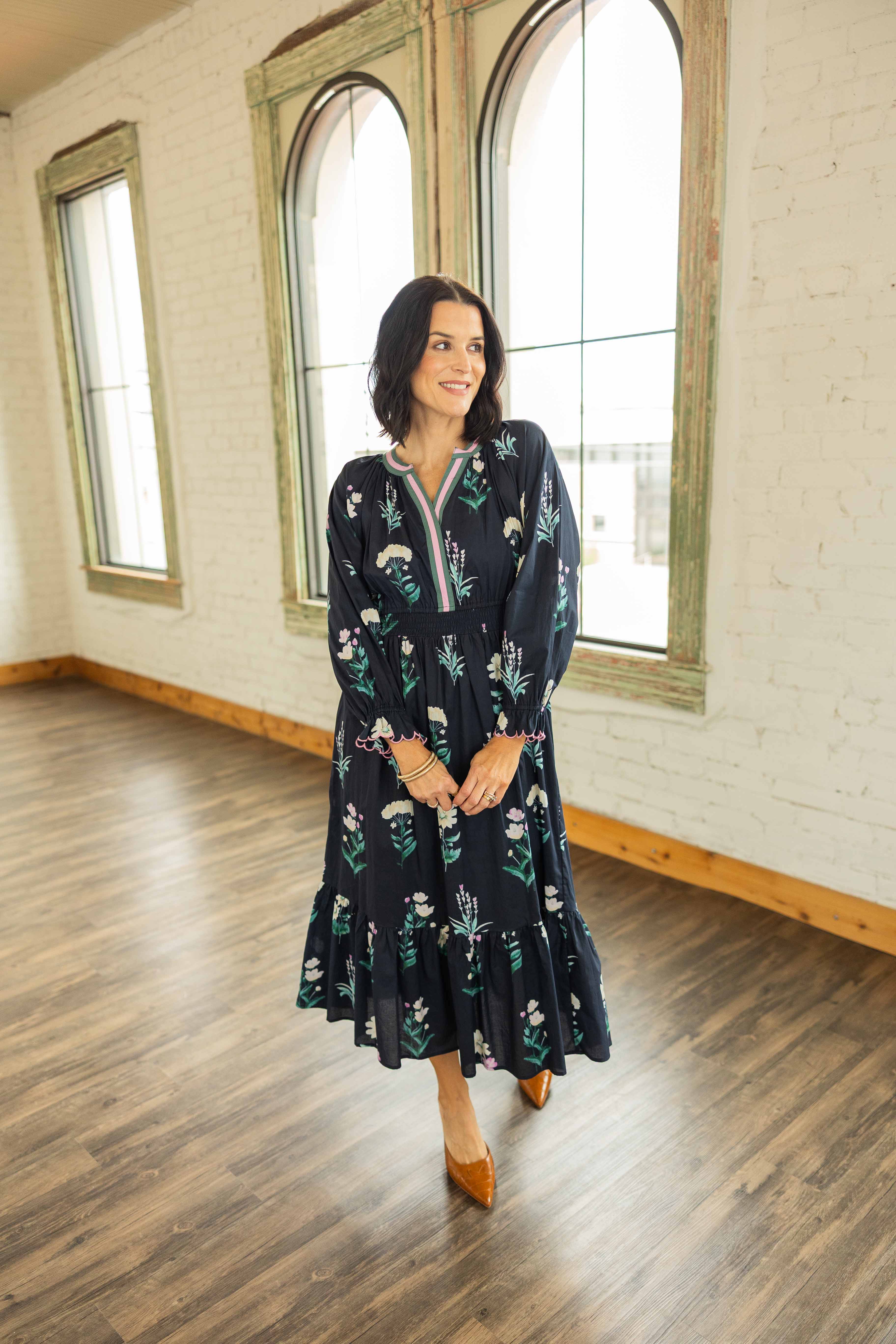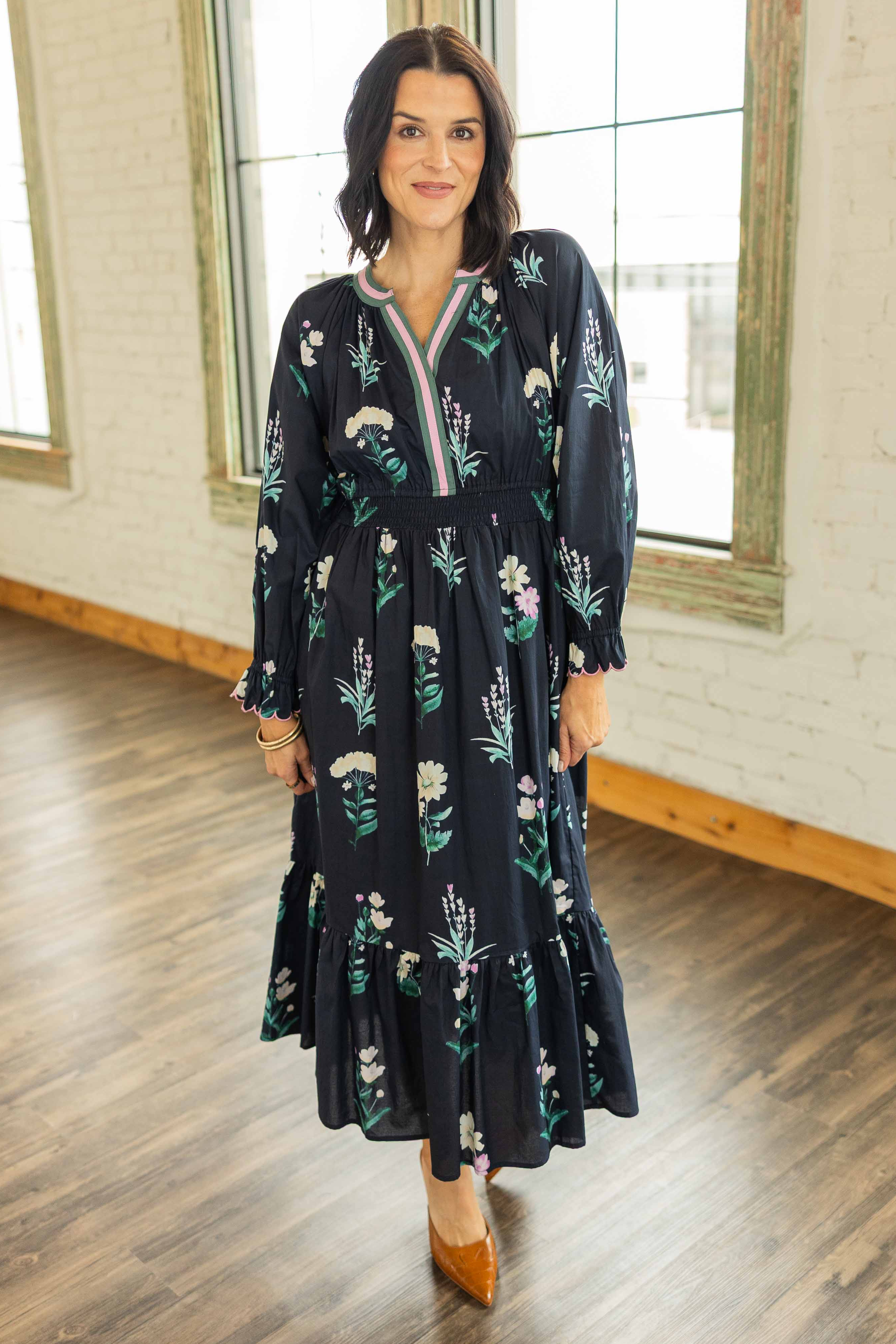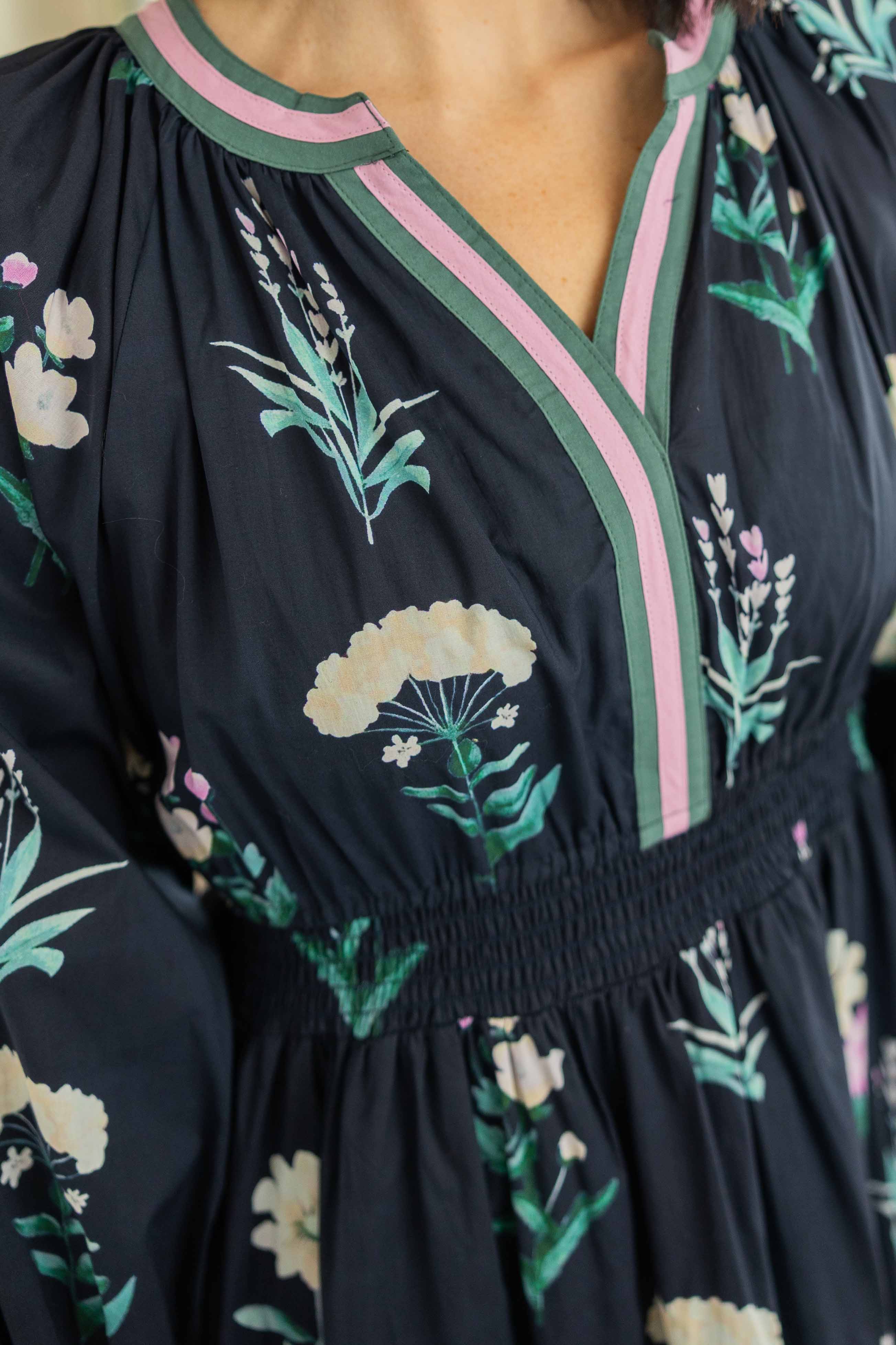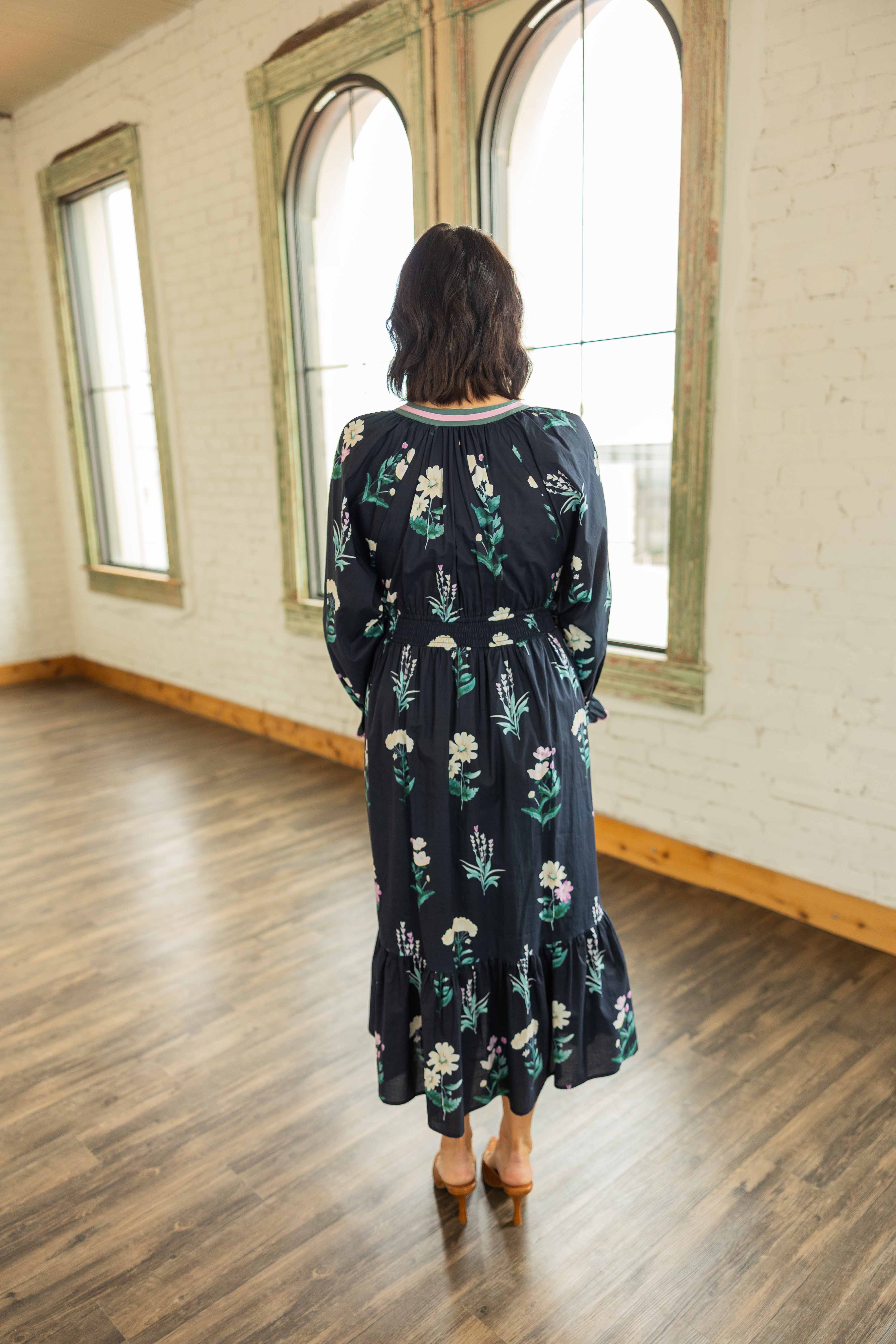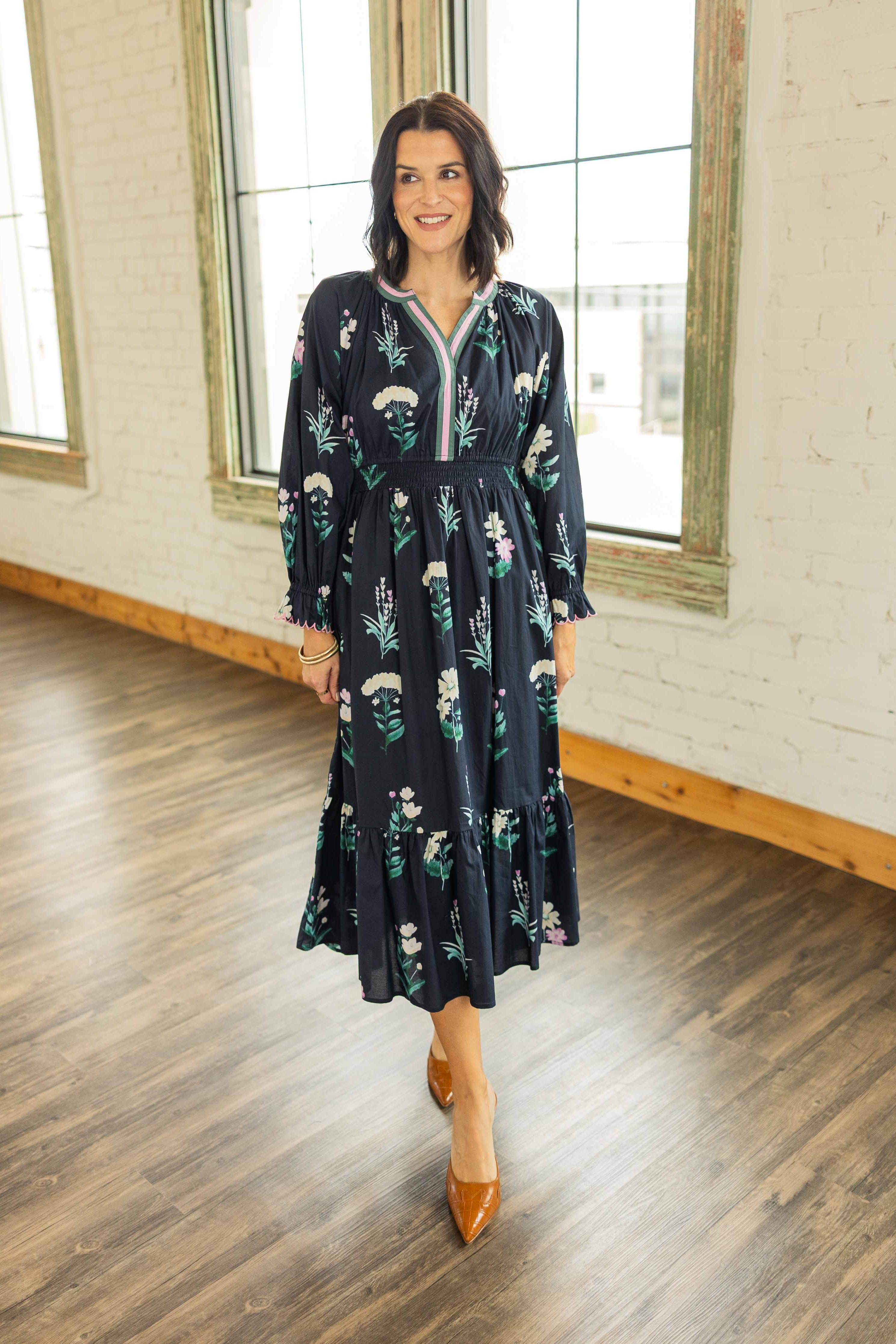 This one feels timeless in the best way. Soft cotton with a graceful drape that moves when you do. The black base is sprinkled with a delicate floral print that pops without overpowering. The V neckline flatters. The ruffled details add romance. The lined skirt keeps it comfortable and easy from morning plans to dinner out.