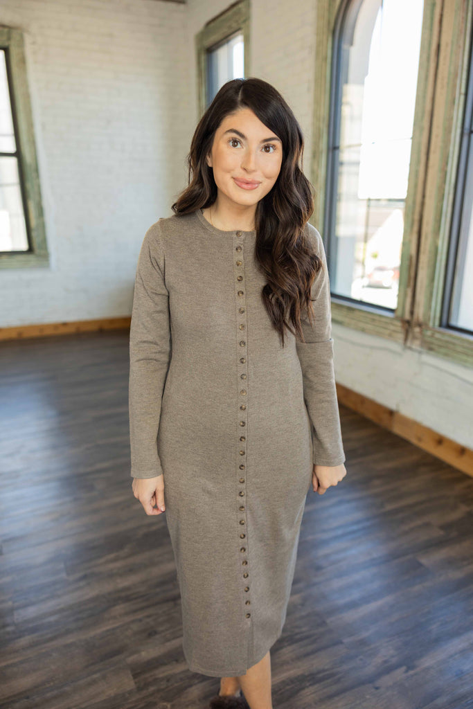 The Tilly Sweater Button-Up Midi Dress is simple, sleek, and secretly cozy. This fitted ribbed knit style hugs in the right places while still keeping things comfortable and relaxed. The long sleeve silhouette and button-down front give it a polished look, but the soft, stretchy fabric makes it feel like your favorite lounge set.