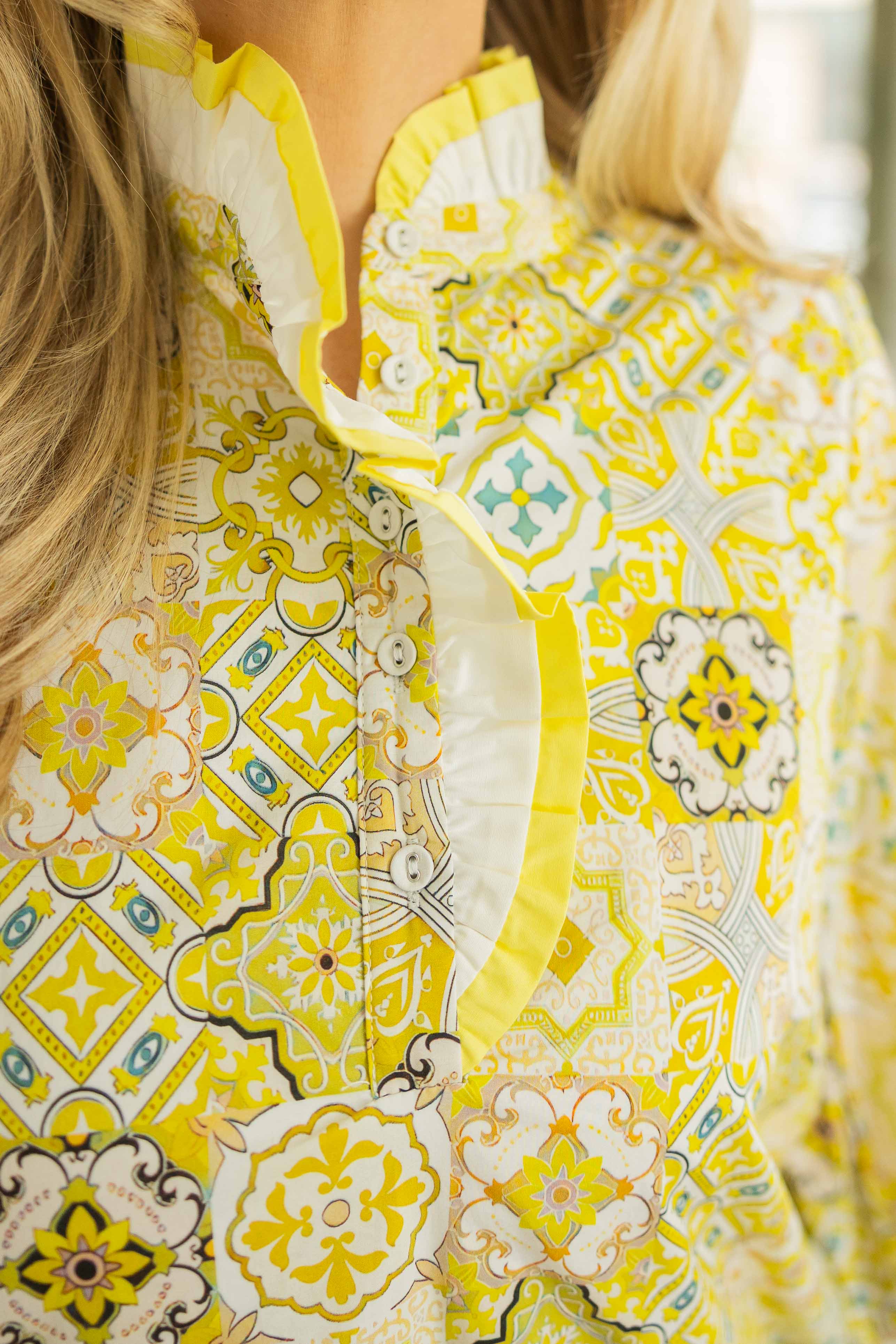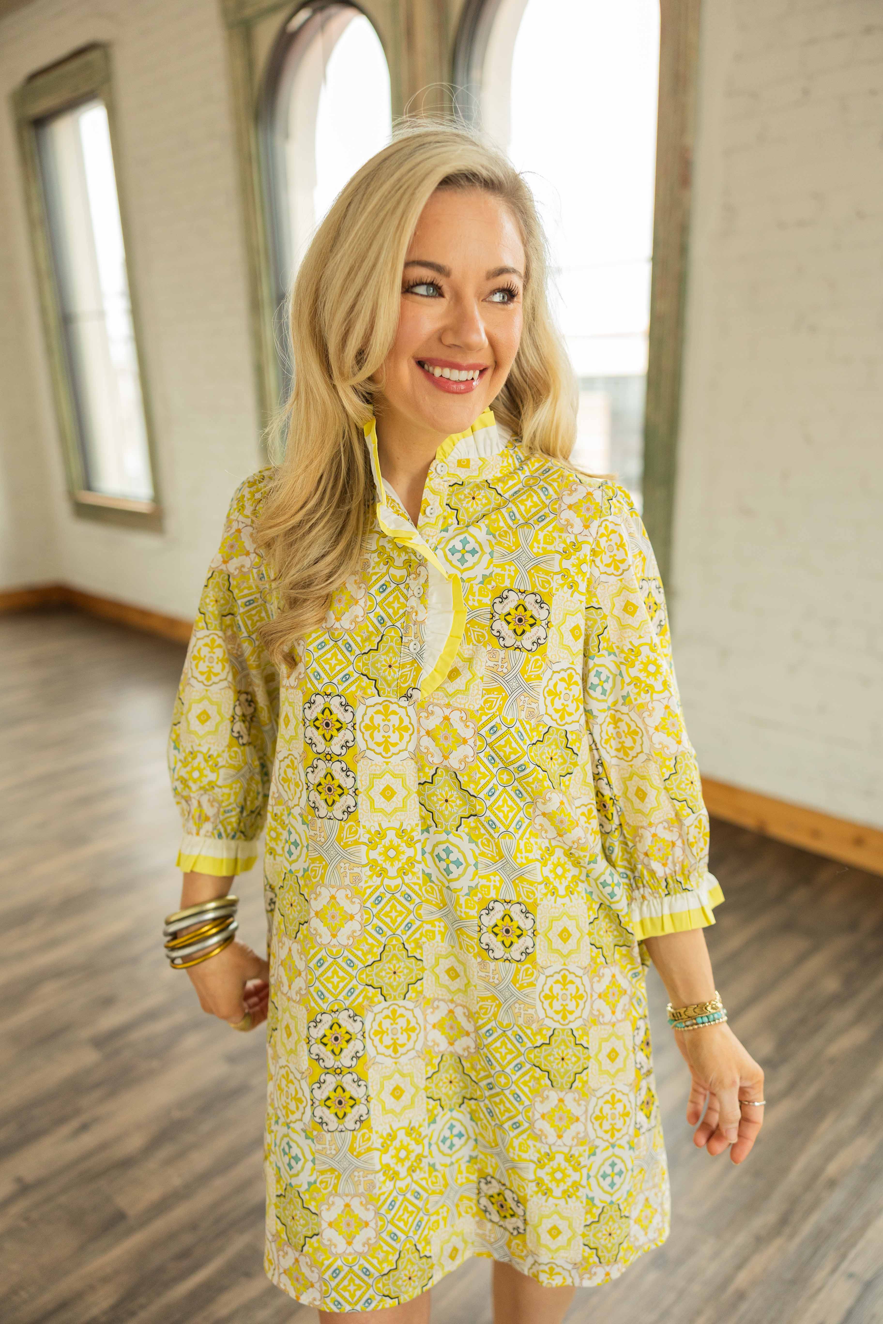 Bright. Happy. Effortless in the way we love. This mini shift dress features a cheerful boho floral print that feels fresh and fun without being loud. The ruffled high neckline and front button detail add charm, while the easy shift silhouette keeps it comfortable and wearable all day. Toss it on and go. No overthinking required.