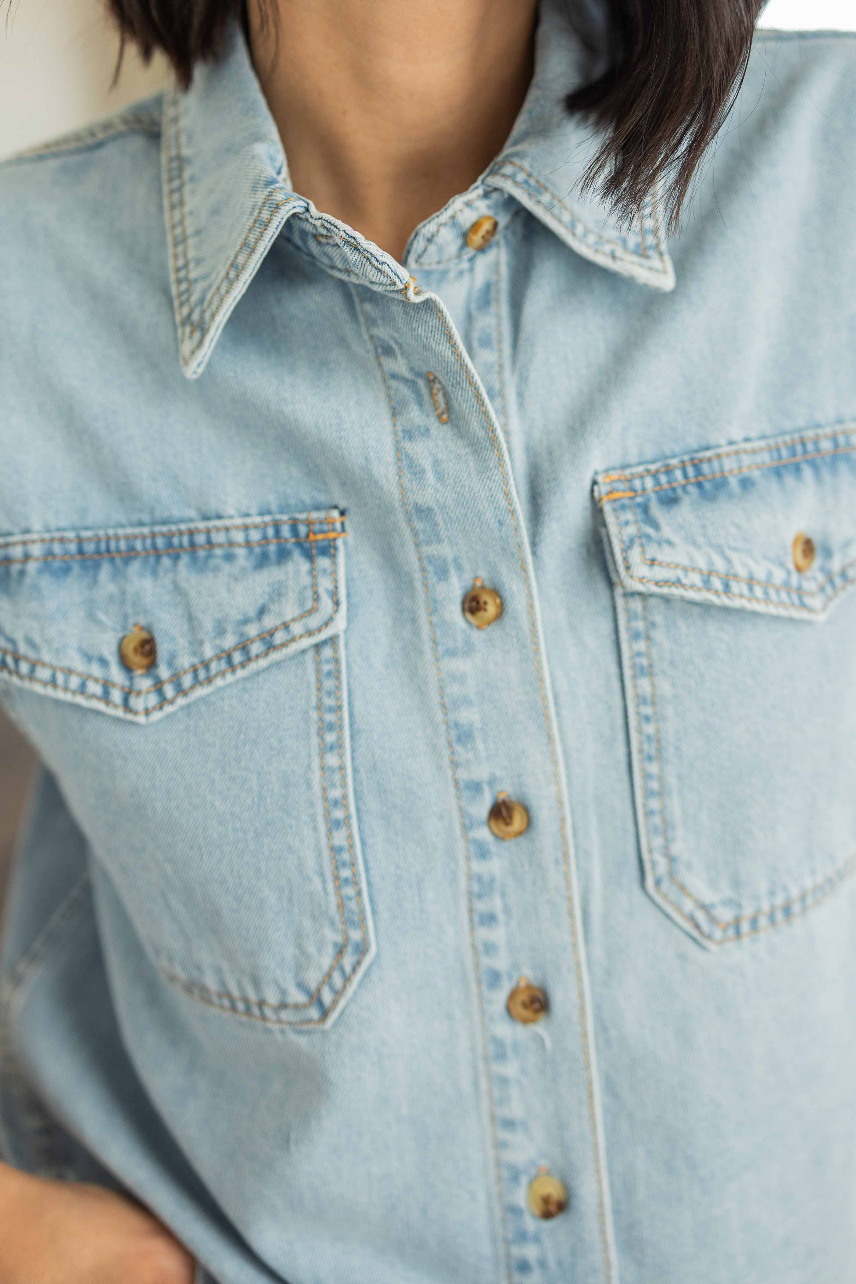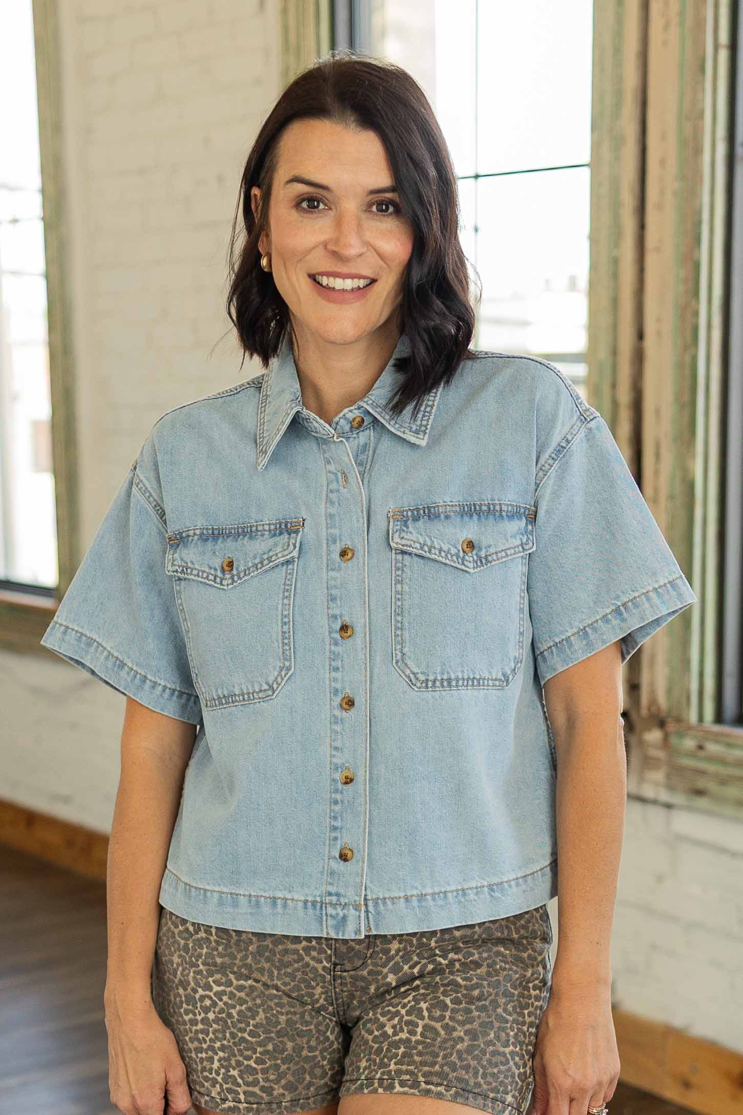 Denim, but make it easy. The Julieta Denim Relaxed Cotton Top is a lightweight button up that gives you that classic denim look without feeling heavy or stiff. The relaxed cropped silhouette keeps it modern while the short sleeves make it perfect for warm days. Functional buttons and front chest pockets add that timeless utility detail, while the soft light wash keeps it fresh and versatile.
