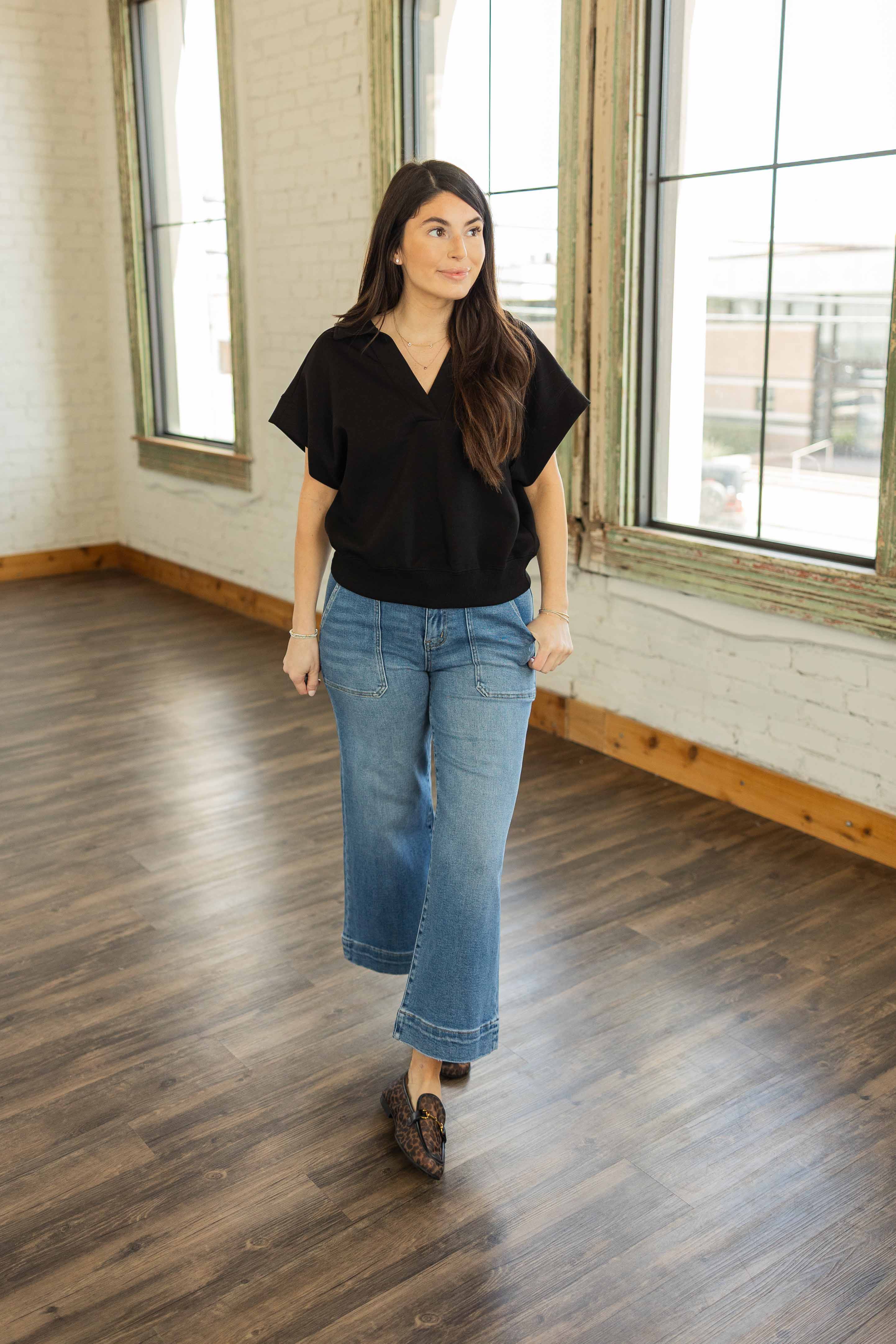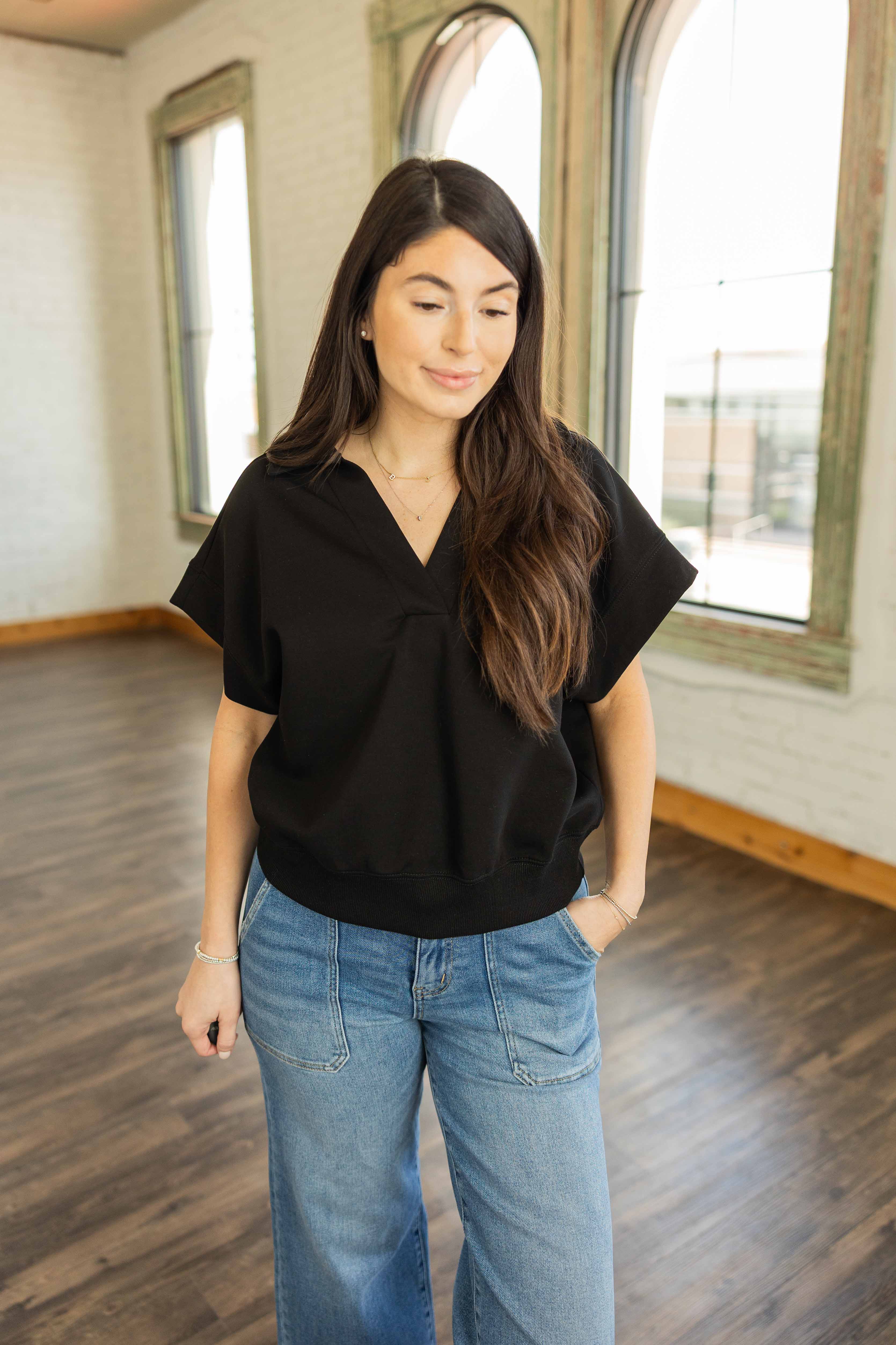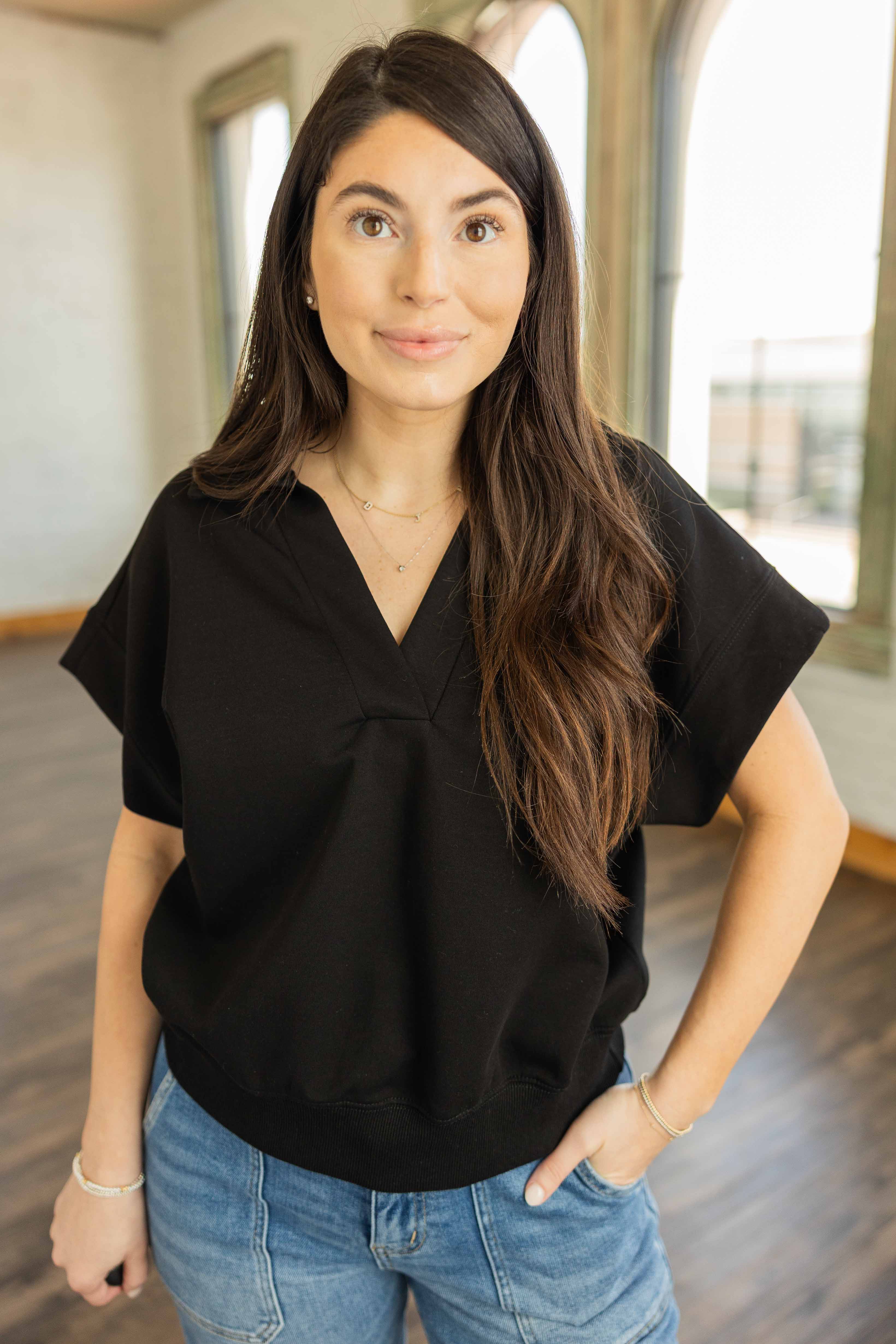 Simple, polished, and unbelievably comfortable. The Leanna Luxe Knit Pullover Top brings that clean everyday look with a buttery soft knit fabric that feels amazing against the skin. The relaxed silhouette drapes effortlessly while the wide short sleeves keep the shape modern and easy to wear. A soft V neckline with a subtle collar detail gives it just enough structure, and the ribbed hem adds a nice finished touch. It is one of those pieces you will reach for again and again.