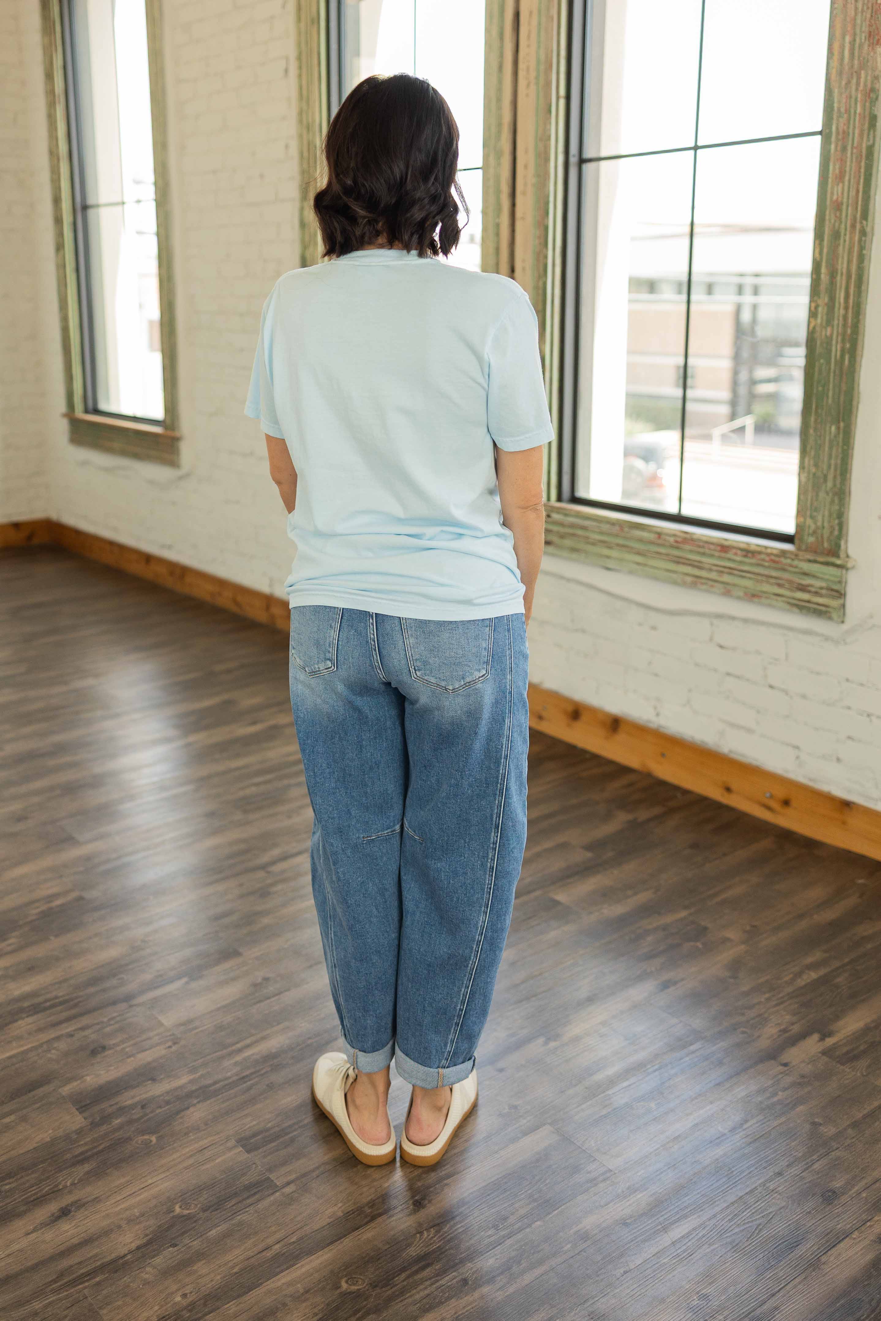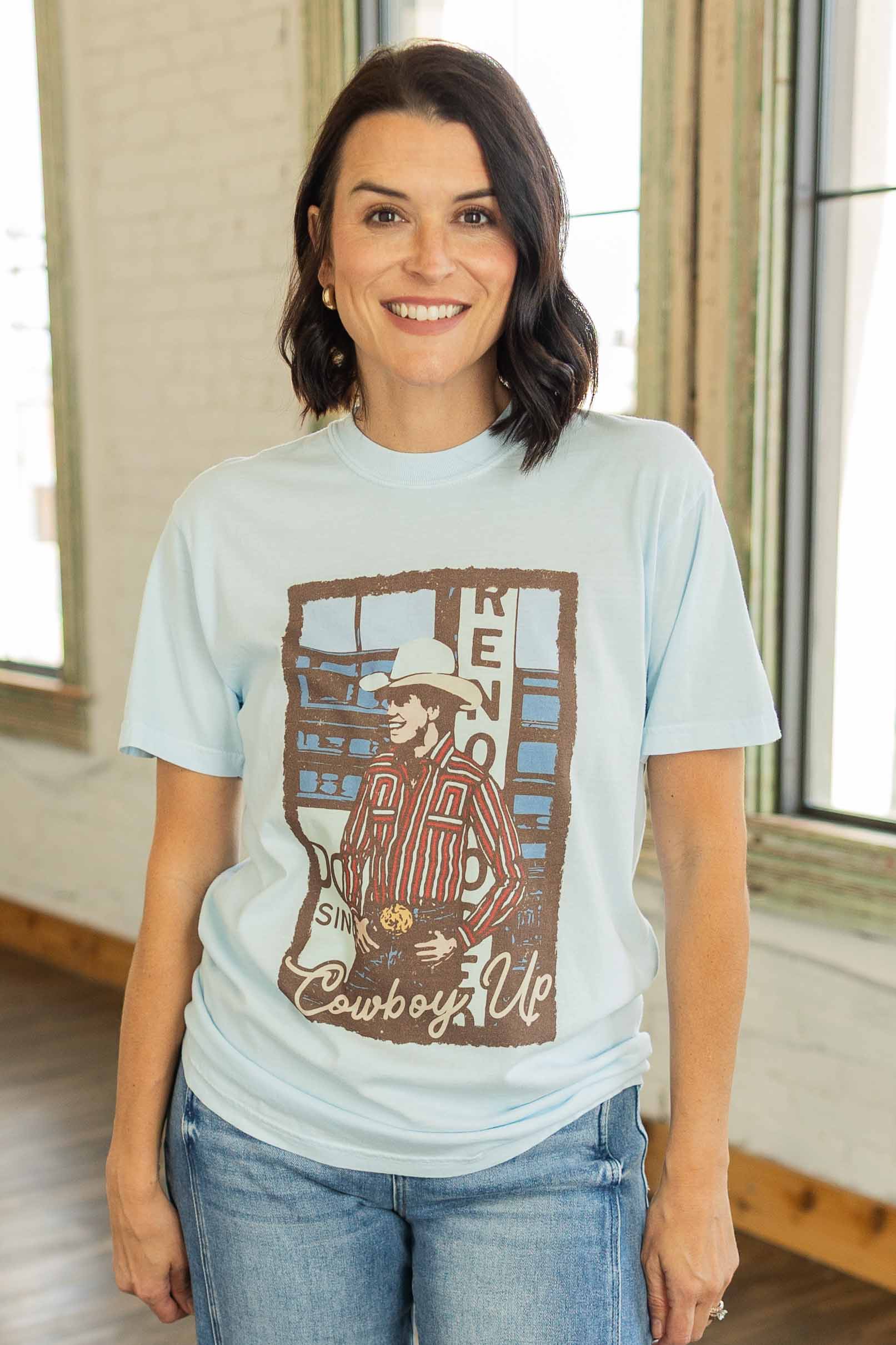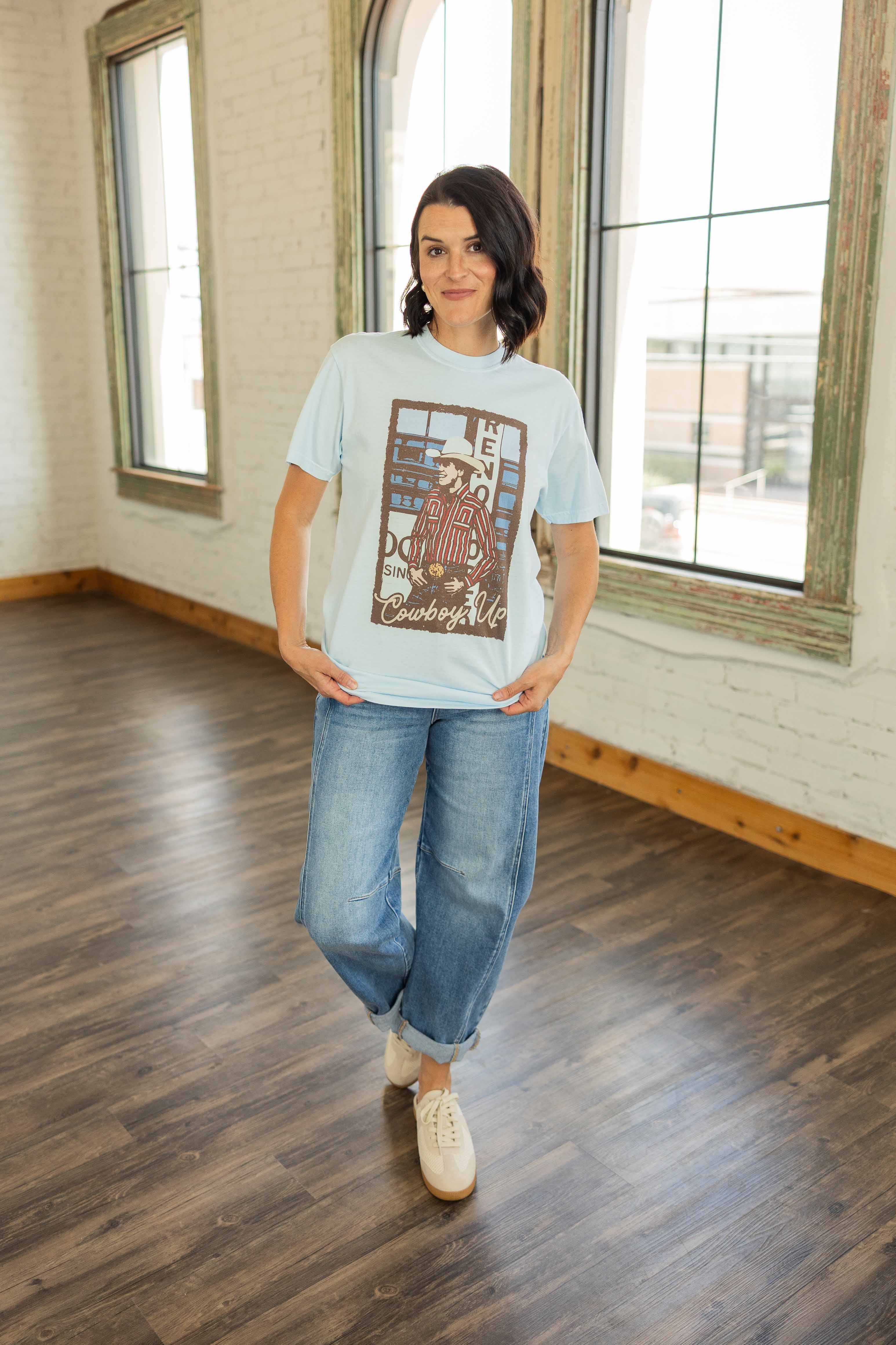 Some days just call for a little western attitude. The Let’s Cowboy Up Graphic Tee features a vintage inspired rodeo graphic with rich brown, red, and blue tones set against a soft light blue tee. The retro cowboy design gives it that worn in western feel that looks even better with denim and boots. Made with the classic Comfort Colors tee fit, it has that relaxed broken in softness right from the start.