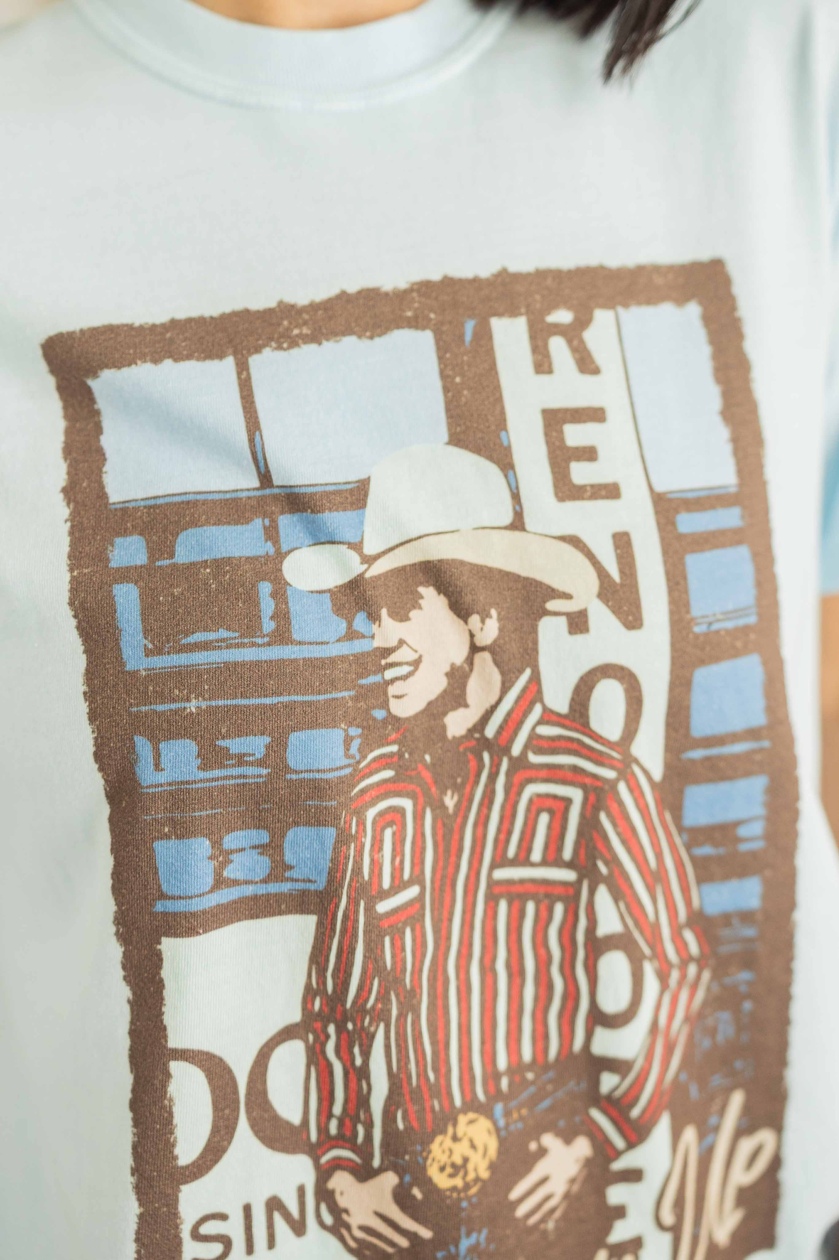 • Light blue tee with vintage rodeo cowboy graphic